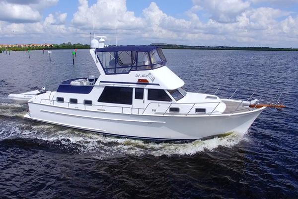 The bridge is a large, easily accessed without climbing a ladder and fully enclosed with screens. The cockpit has a transom door and generous swim platform ,safety ladder and heavy duty davit system for the Caribe 11 ft RIB.