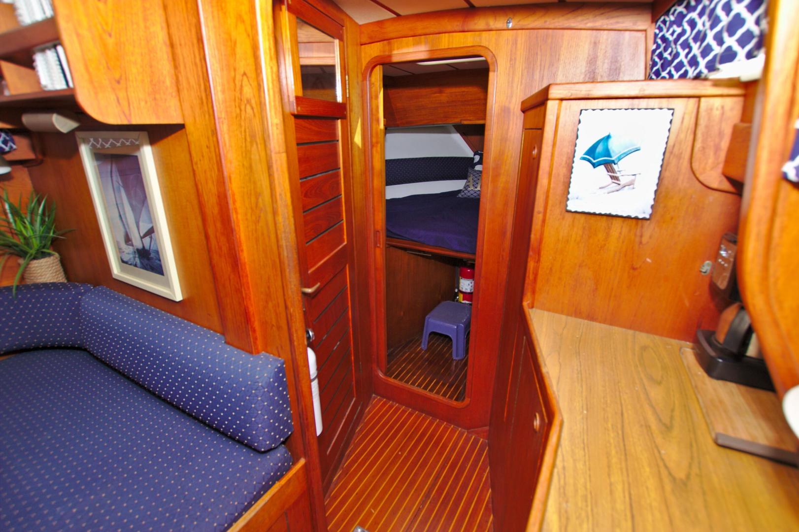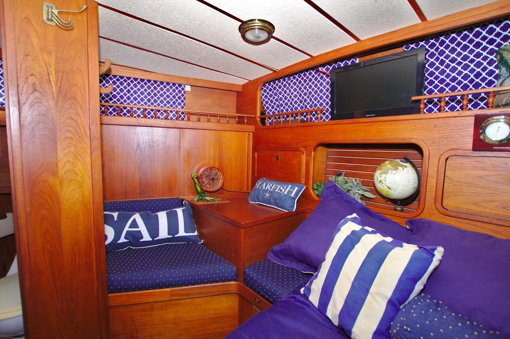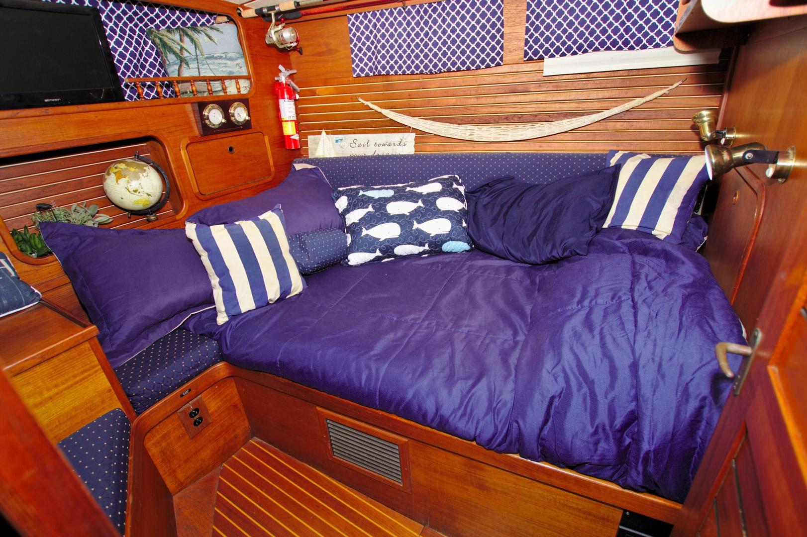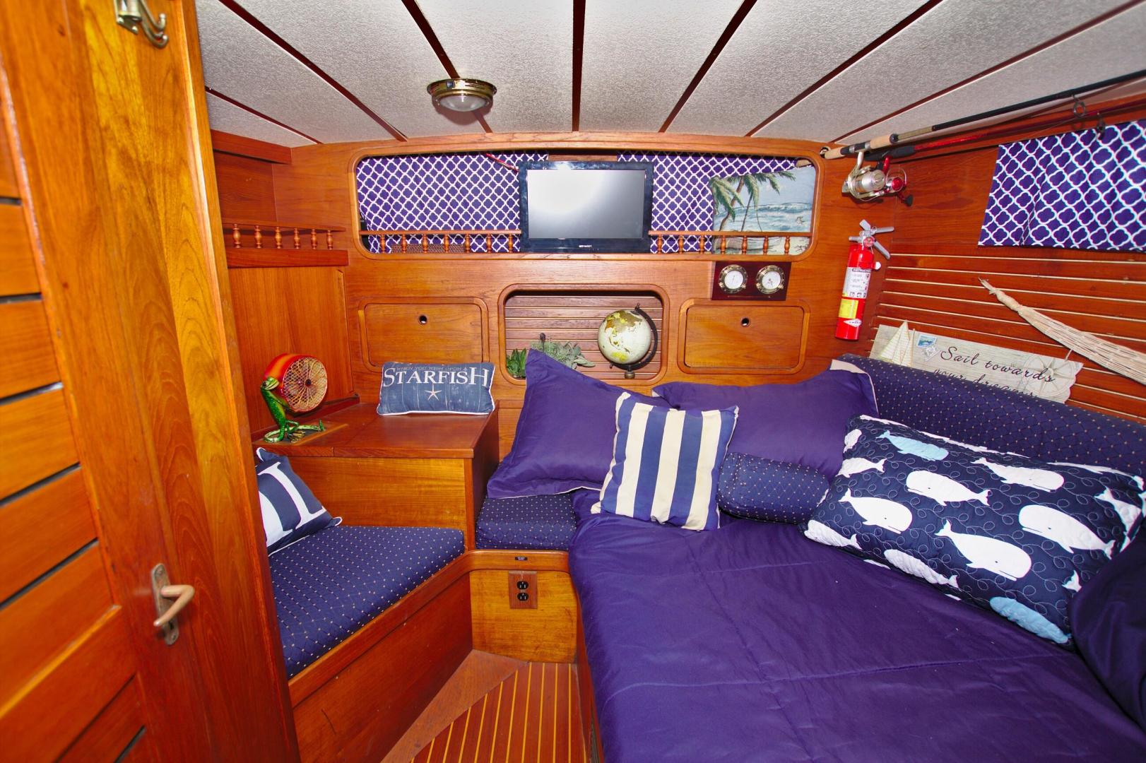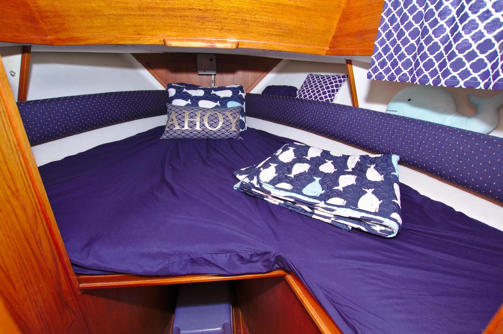 - Features a step-up V berth with filler cushion sleeps two/three