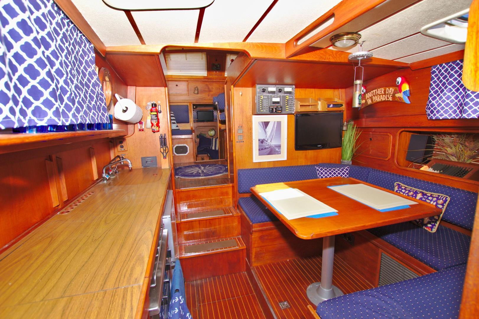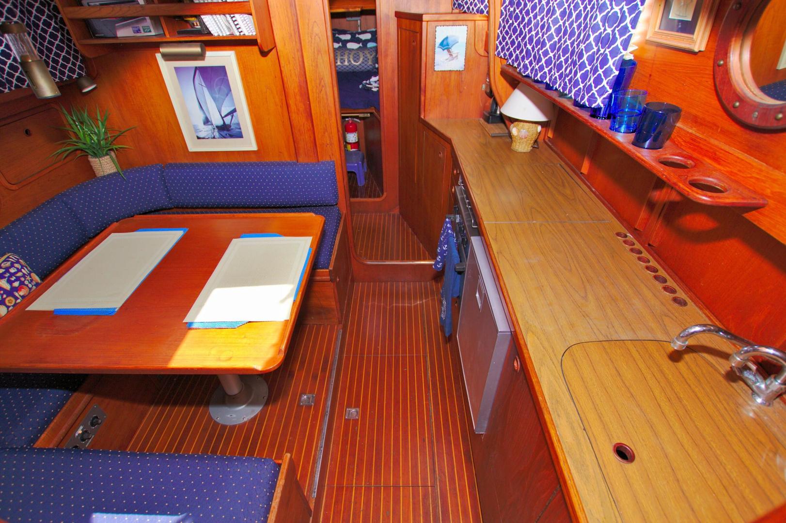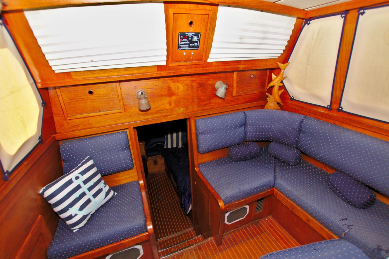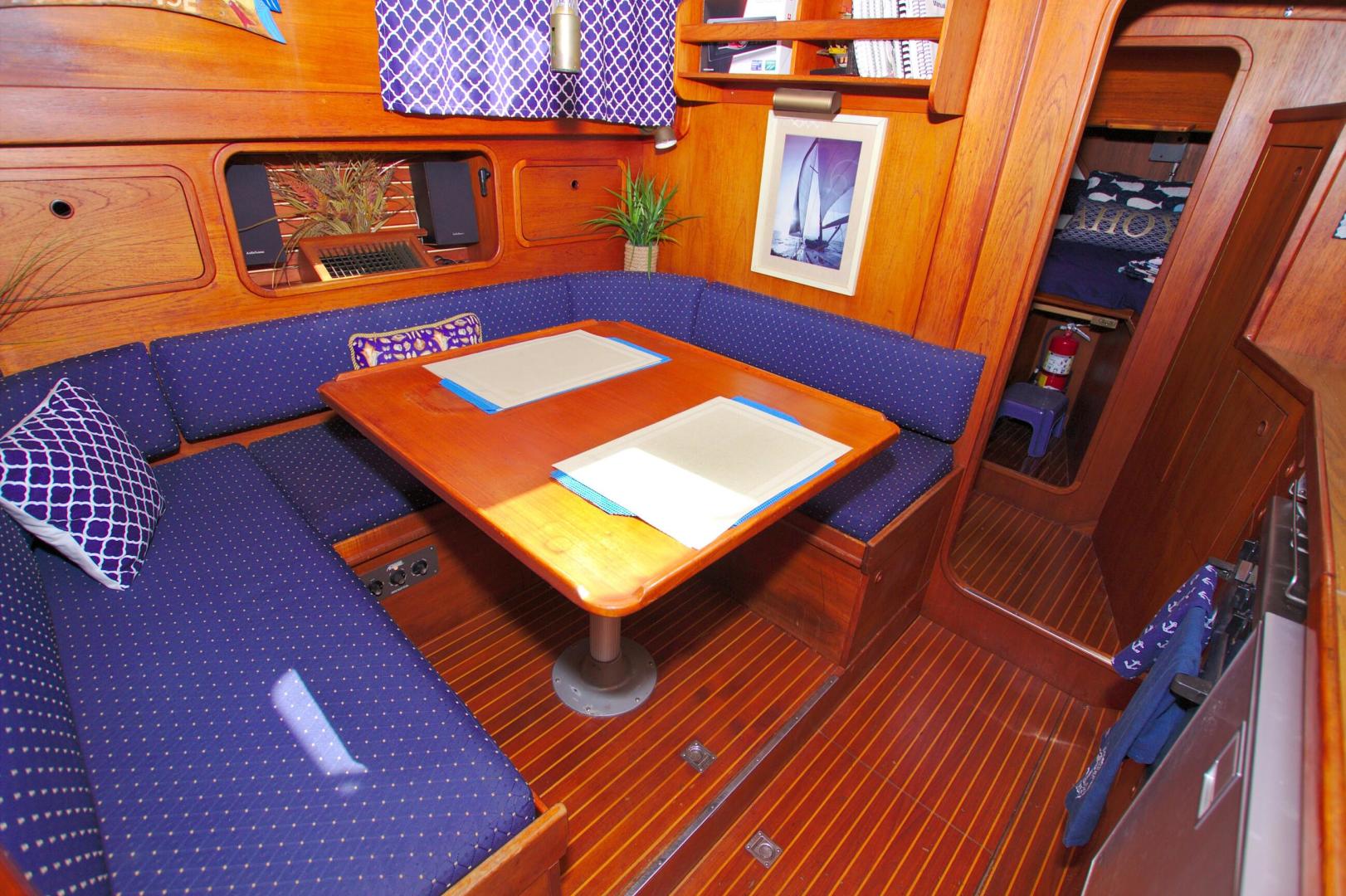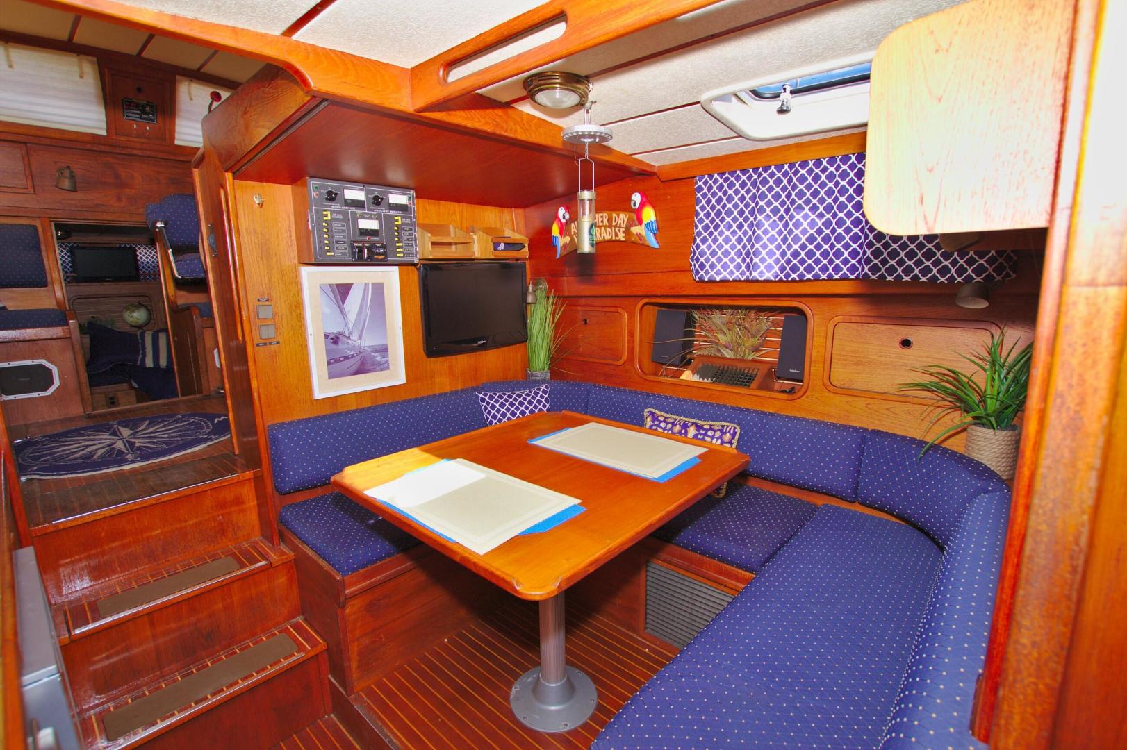 - (2) steps down in the center of the boat to port is aTeak Dining table for (6), that can be lowered for sleeping with the included filler cushions.
