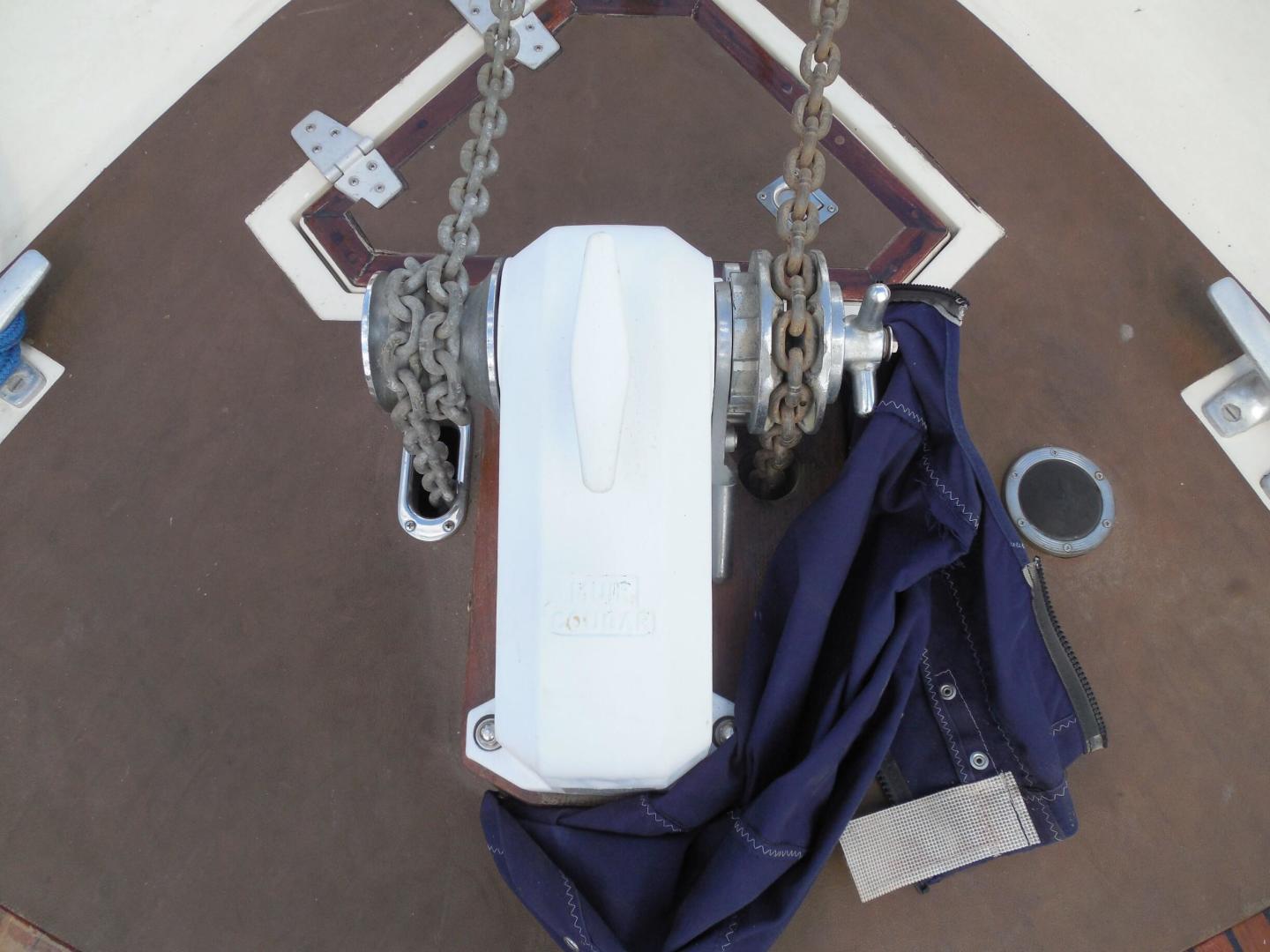 - Forward Deck Has a “Muir Cougar” two Spool Heavy Duty Windlass with 150’ anchor Chain for the two Anchors mounted on extended Bowsprit a CQR Delta Plow and a Bruce