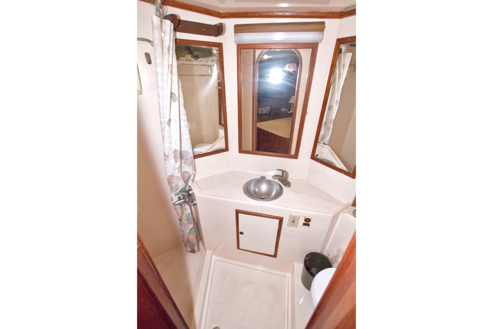 The spacious sundeck and flybridge layout provide excellent outdoor living and visibility, while the interior features a well-designed two-stateroom, two-head configuration. The aft master stateroom includes a centerline queen berth with ensuite head, and the forward stateroom offers over/under bunks for guests. A bright salon, functional galley, and convertible dinette make this boat well-suited for extended cruising or liveaboard use.