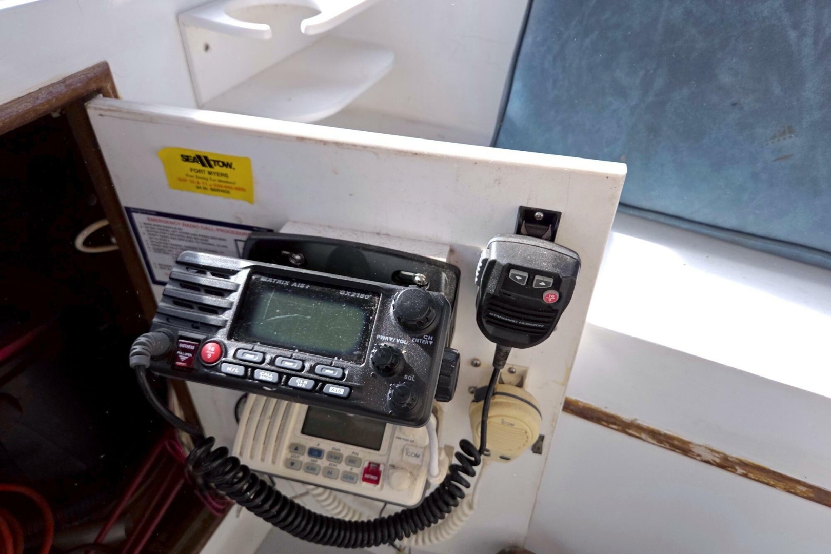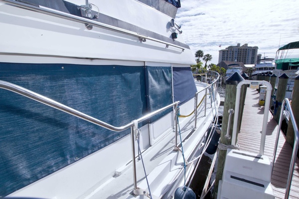 Equipped with Garmin GPS/chartplotter with radar, Raymarine autopilot, 8kW Westerbeke generator, electric windlass, and full helm instrumentation at both stations, this vessel is ready for cruising. The folding radar arch adds flexibility for bridge clearance, making it a strong Great Loop candidate.