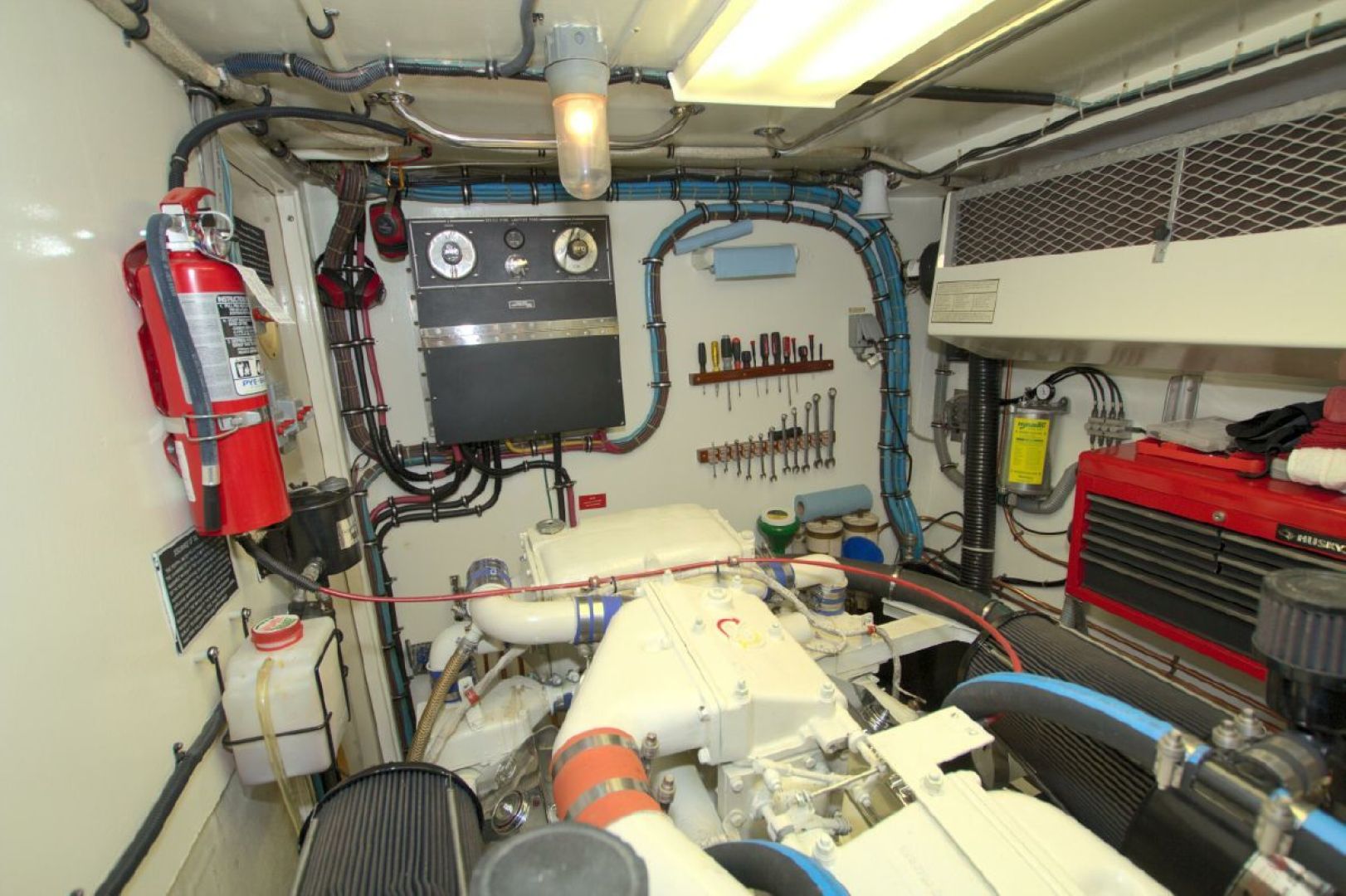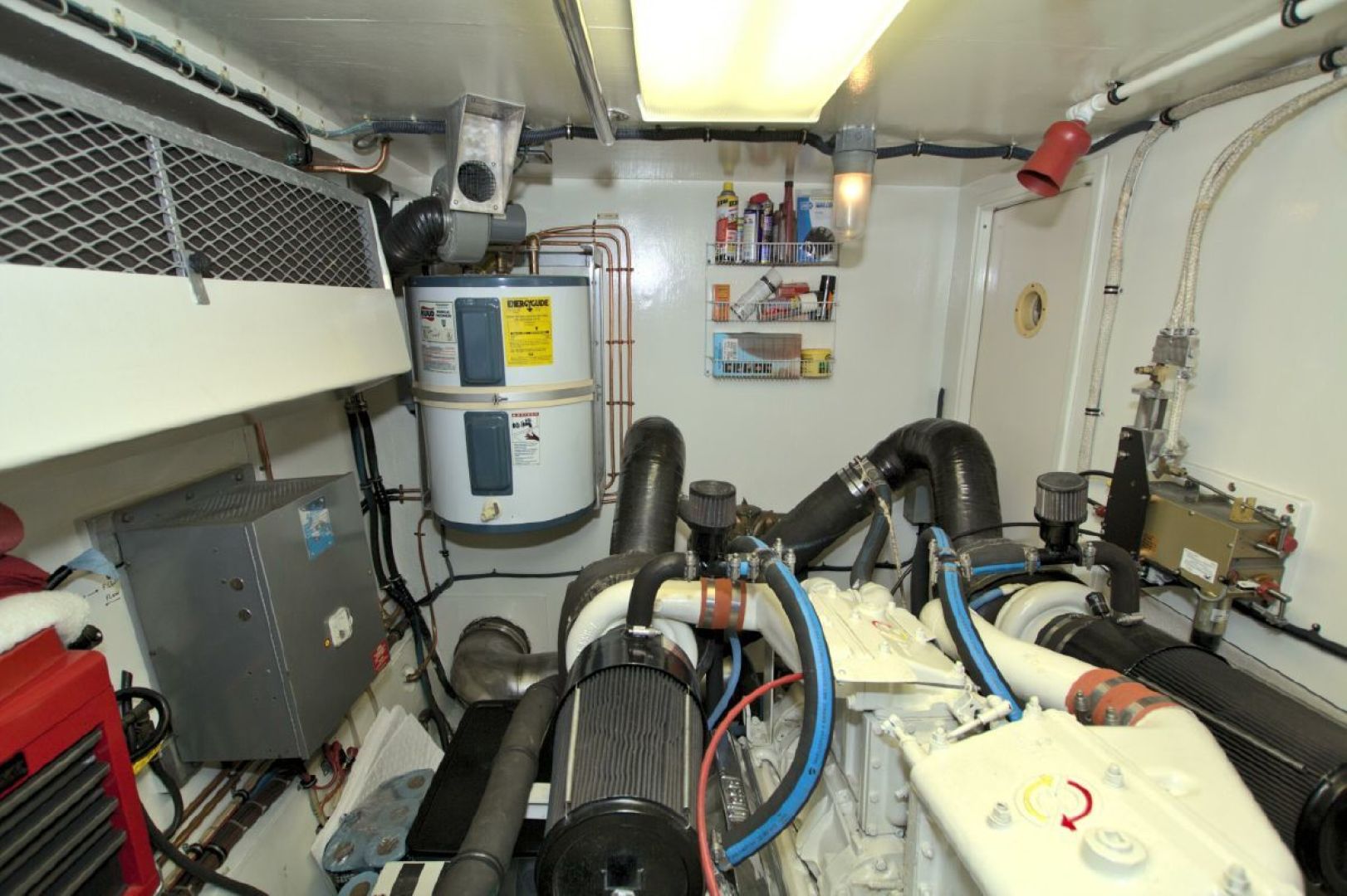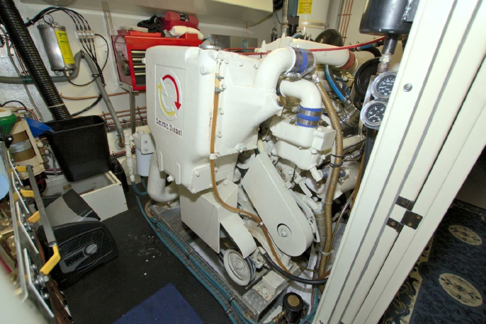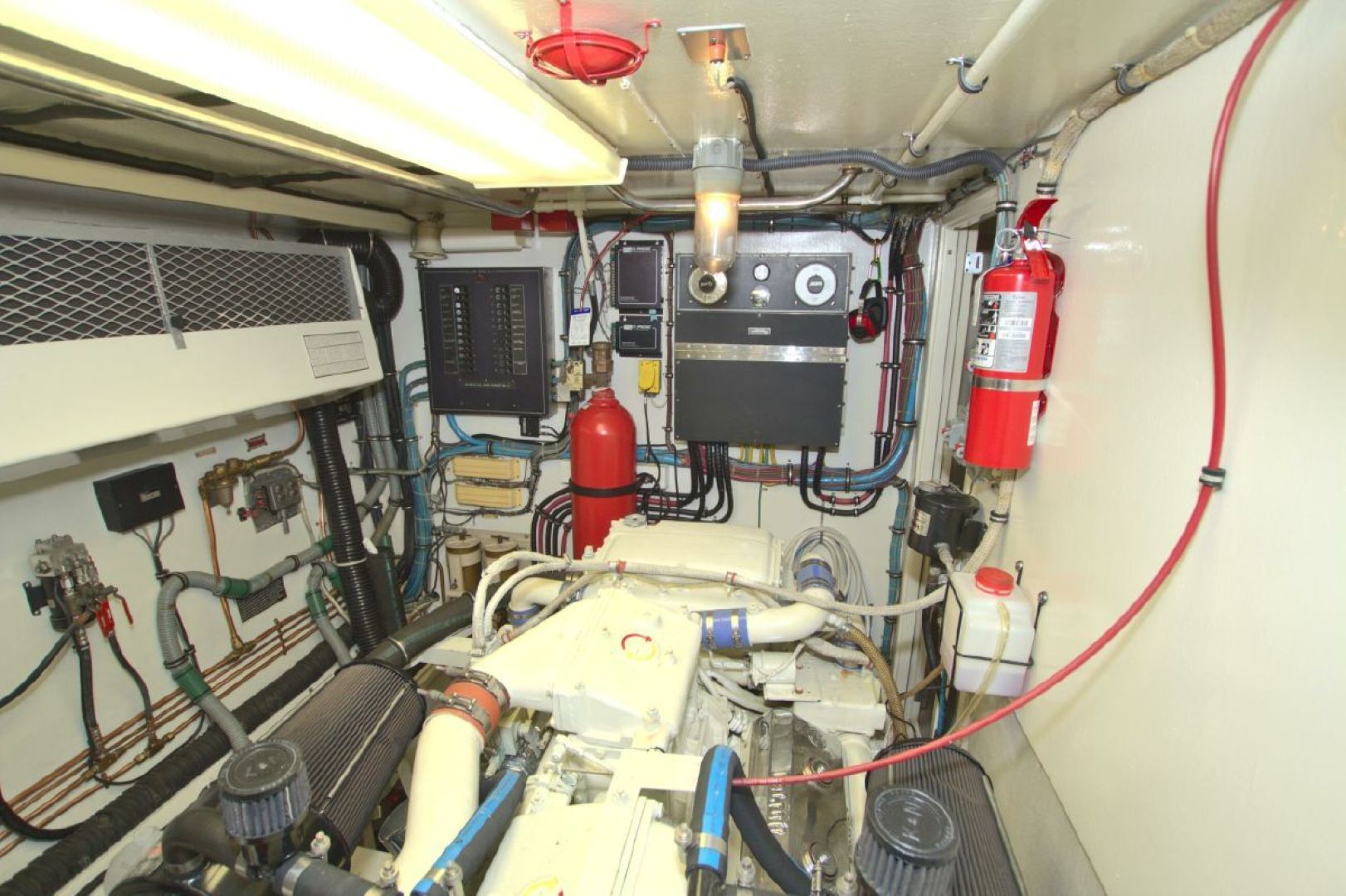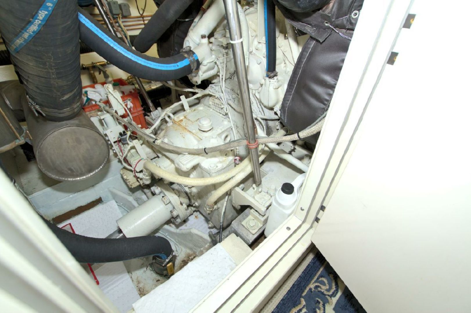 Aft of the VIP cabin are the twin engine rooms housing the spotless Detroit Diesel 12V-71 engines that produce 650HP each. Located outboard at the front of each engine room you will find a thick, plexiglass cover over each of the stabilizer actuators and related sensors. The starboard side engine room houses the hot water tank, ships tool box and common tools mounted on a magnetic bulk head. These rooms are illuminated by both AC and DC lighting systems. You will not find a more organized, cleaner engine room on any Hatteras of this vintage!!