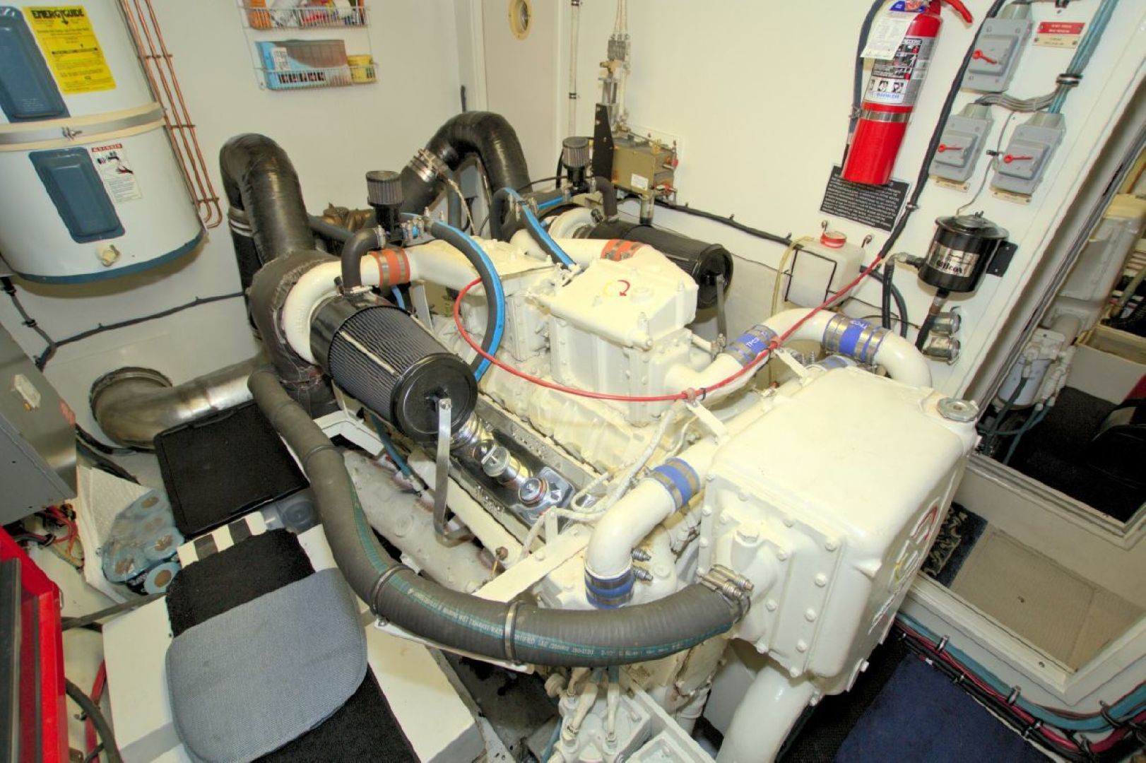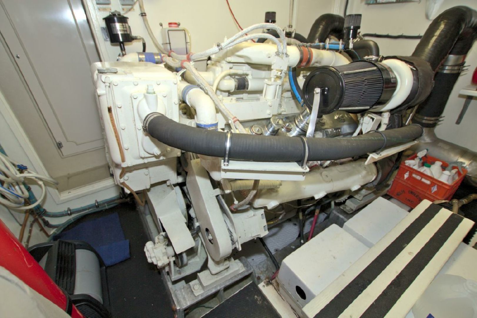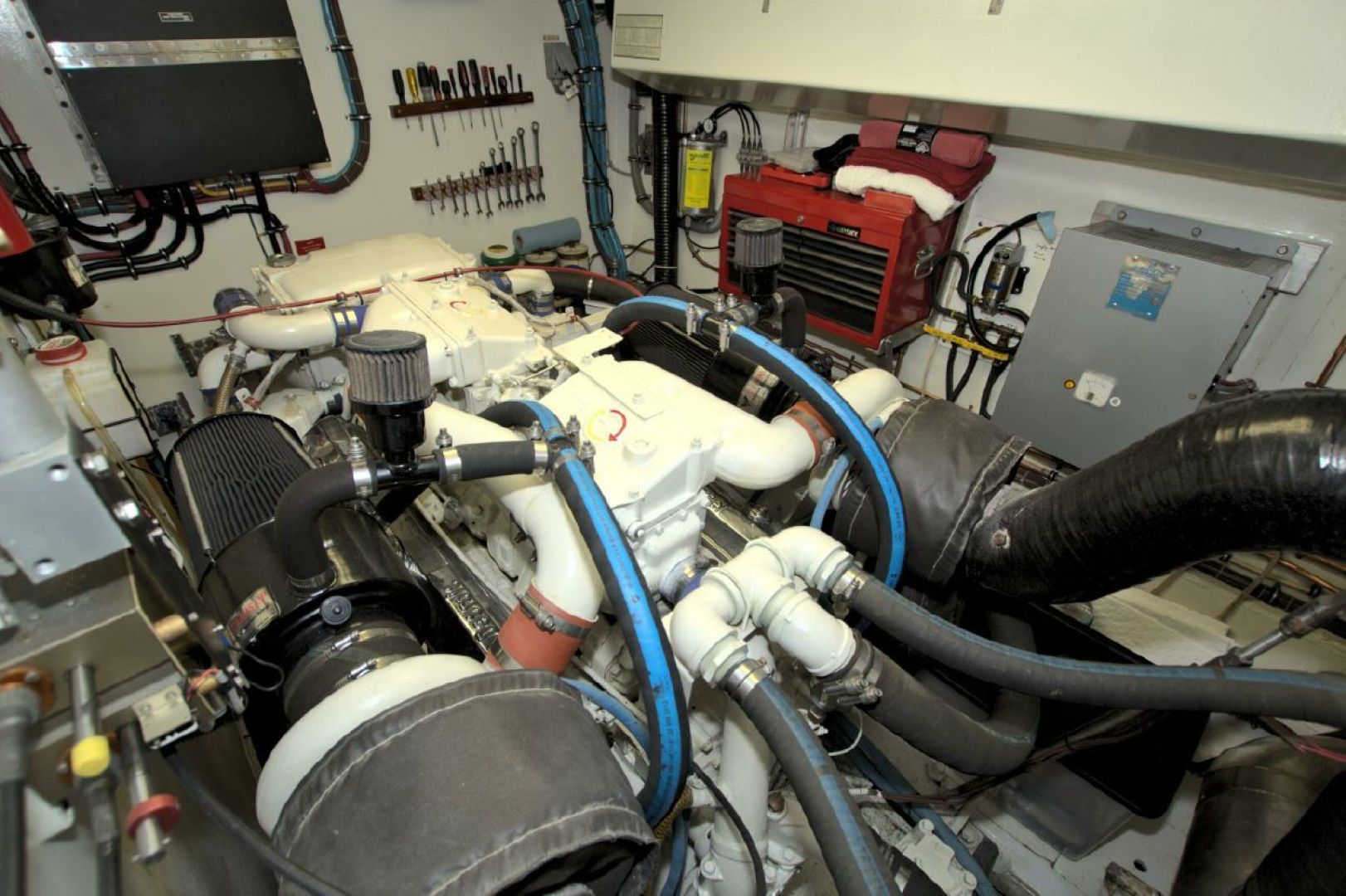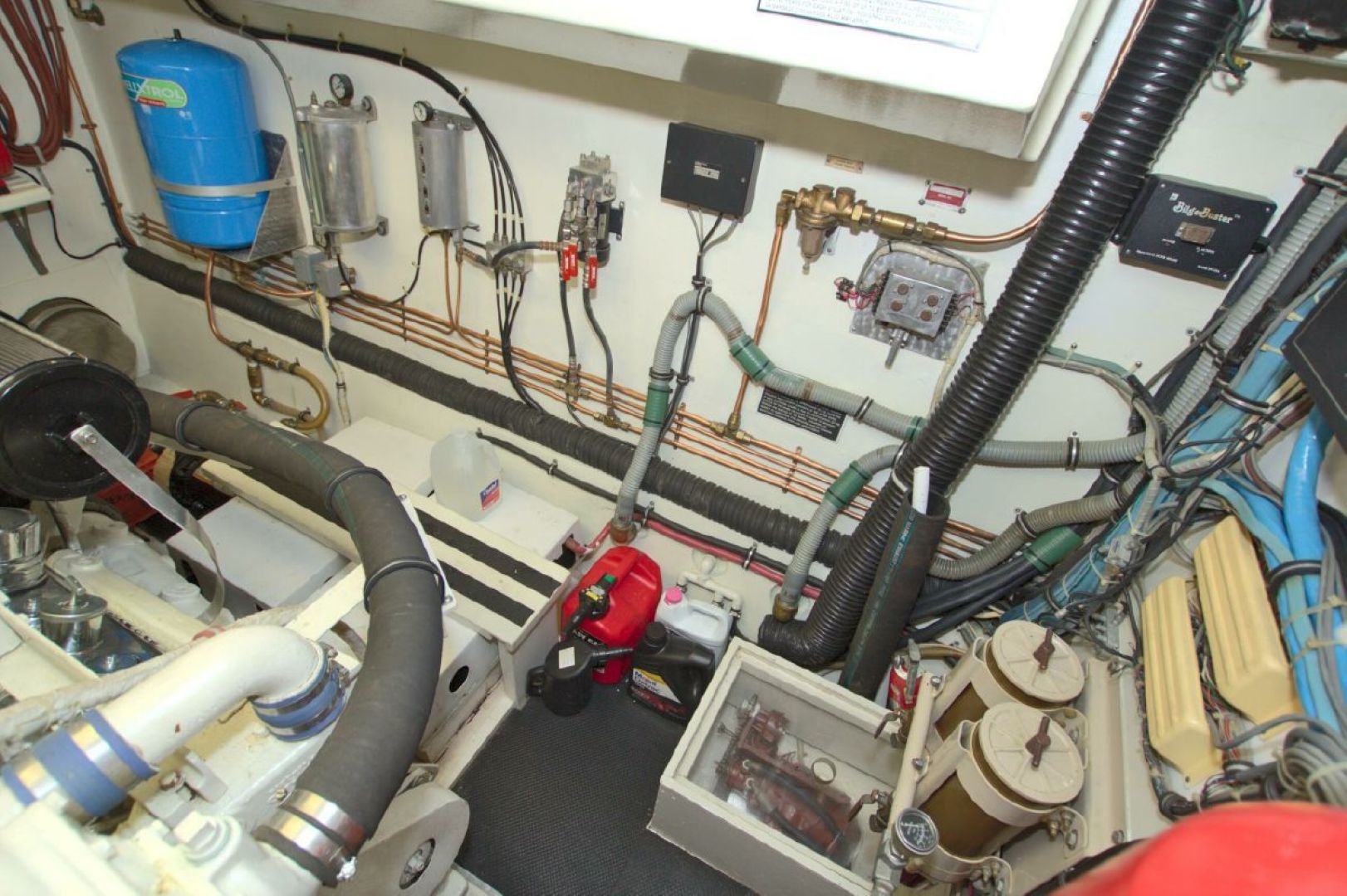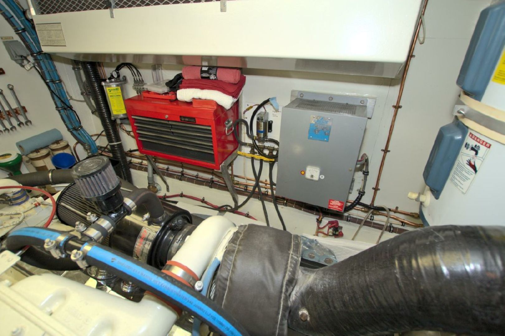 Aft of the VIP cabin are the twin engine rooms housing the spotless Detroit Diesel 12V-71 engines that produce 650HP each. Located outboard at the front of each engine room you will find a thick, plexiglass cover over each of the stabilizer actuators and related sensors. The starboard side engine room houses the hot water tank, ships tool box and common tools mounted on a magnetic bulk head. These rooms are illuminated by both AC and DC lighting systems. You will not find a more organized, cleaner engine room on any Hatteras of this vintage!!