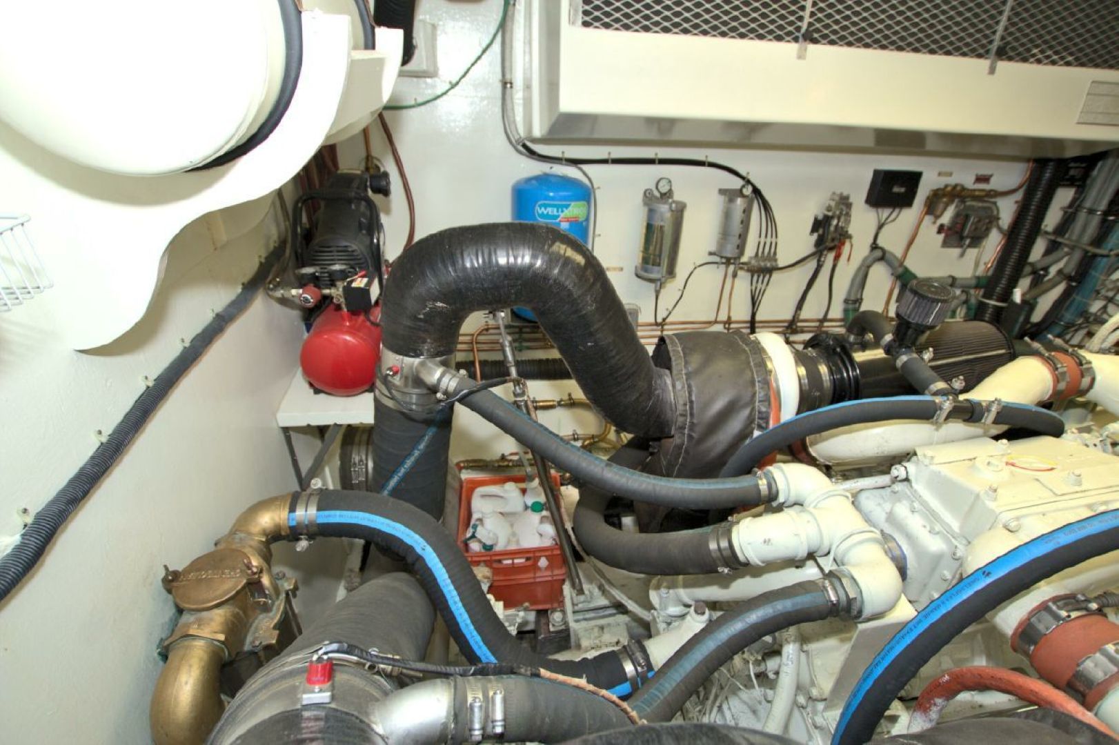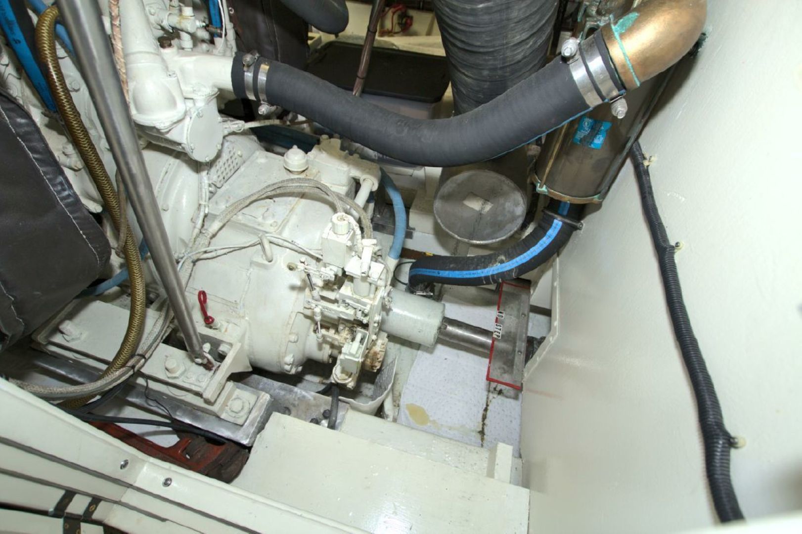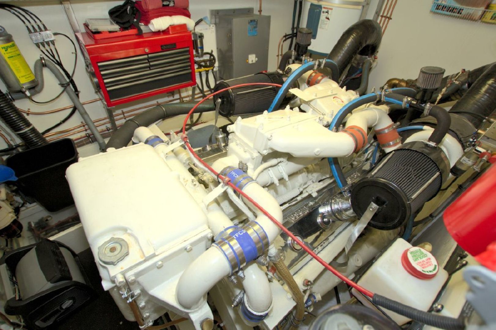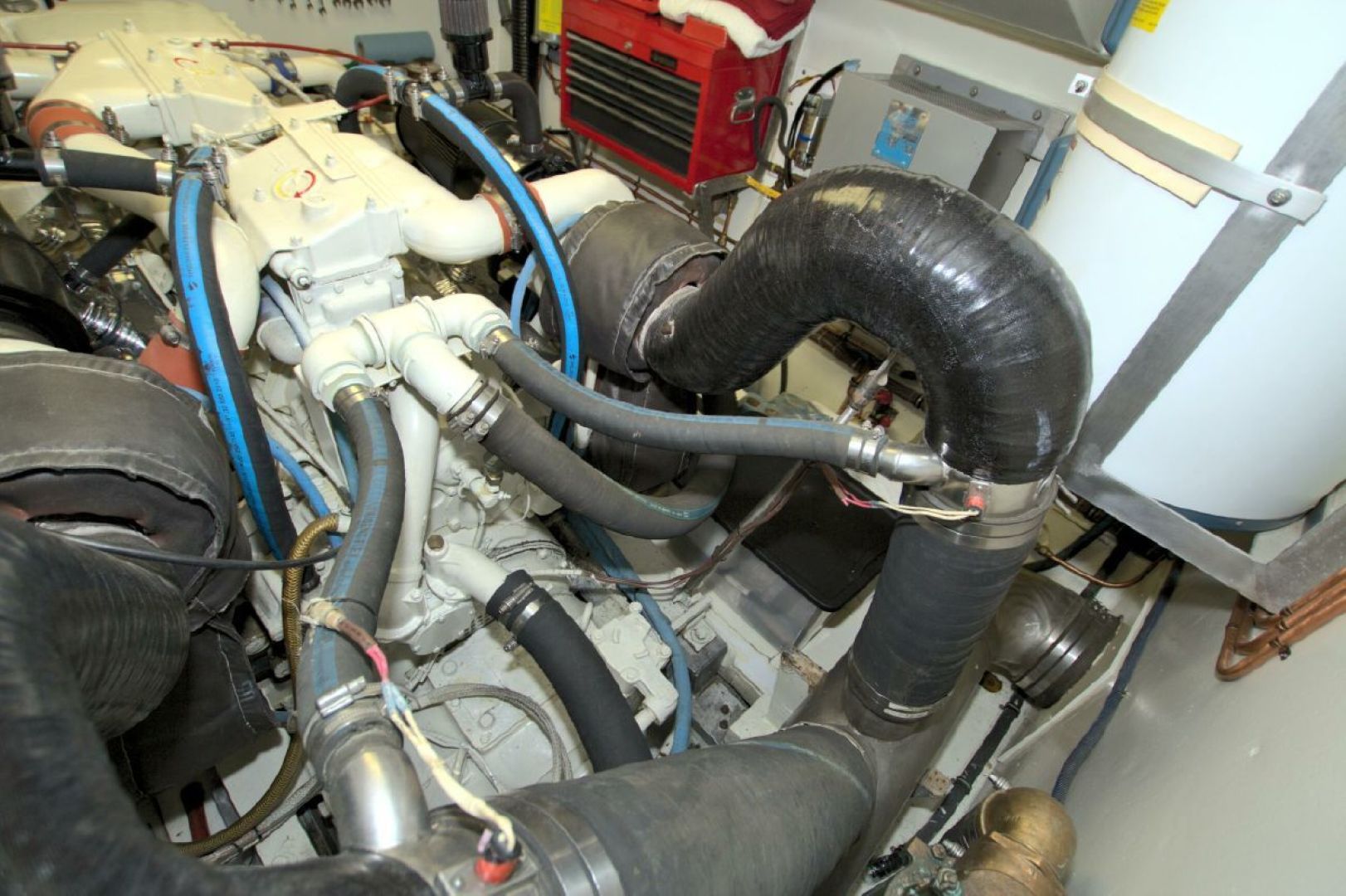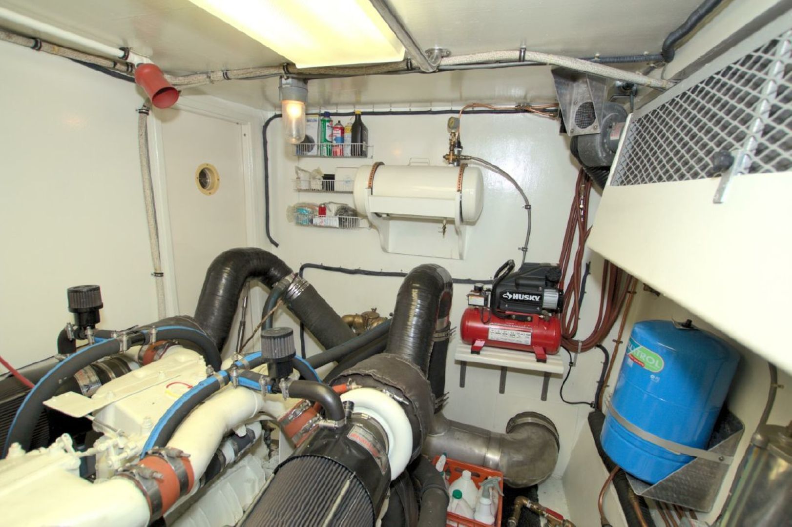 Aft of the VIP cabin are the twin engine rooms housing the spotless Detroit Diesel 12V-71 engines that produce 650HP each. Located outboard at the front of each engine room you will find a thick, plexiglass cover over each of the stabilizer actuators and related sensors. The starboard side engine room houses the hot water tank, ships tool box and common tools mounted on a magnetic bulk head. These rooms are illuminated by both AC and DC lighting systems. You will not find a more organized, cleaner engine room on any Hatteras of this vintage!!