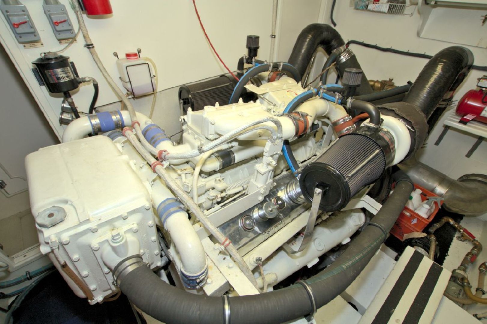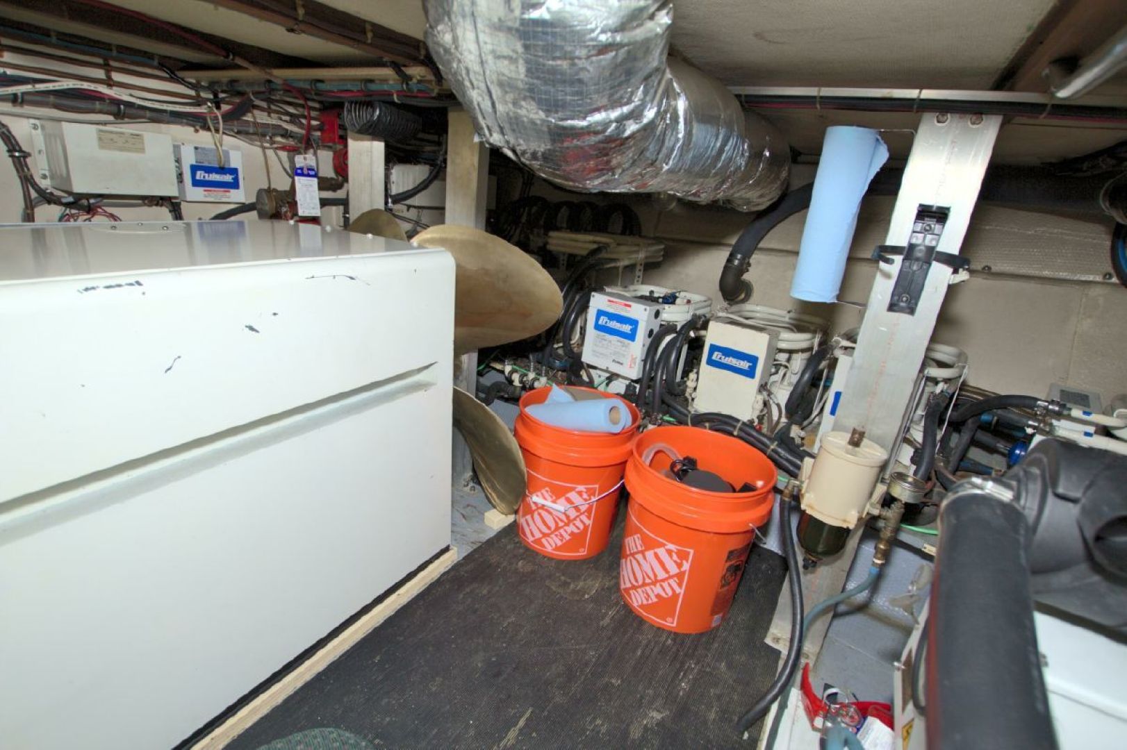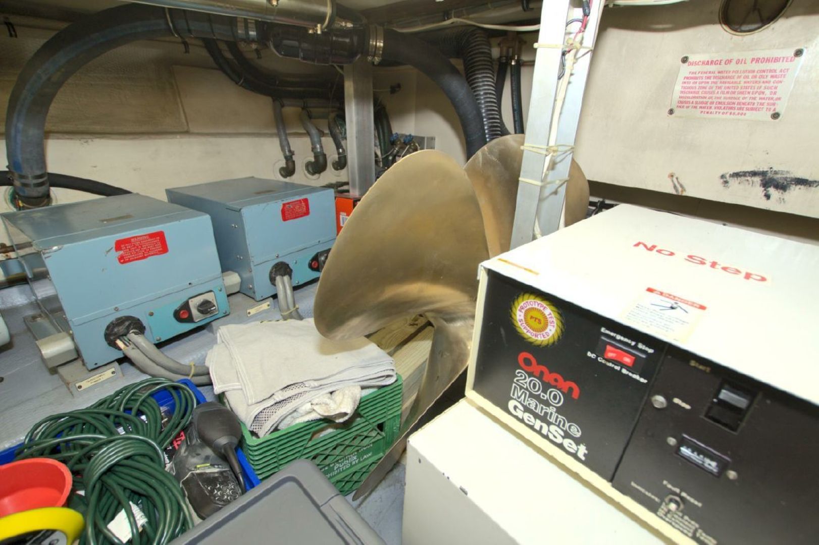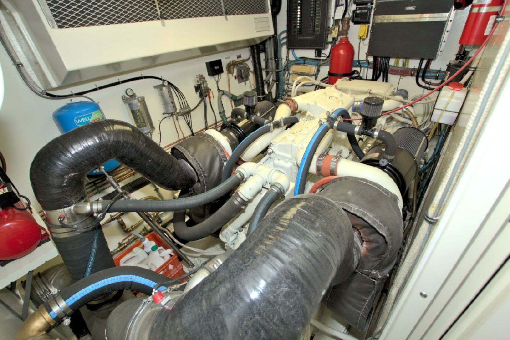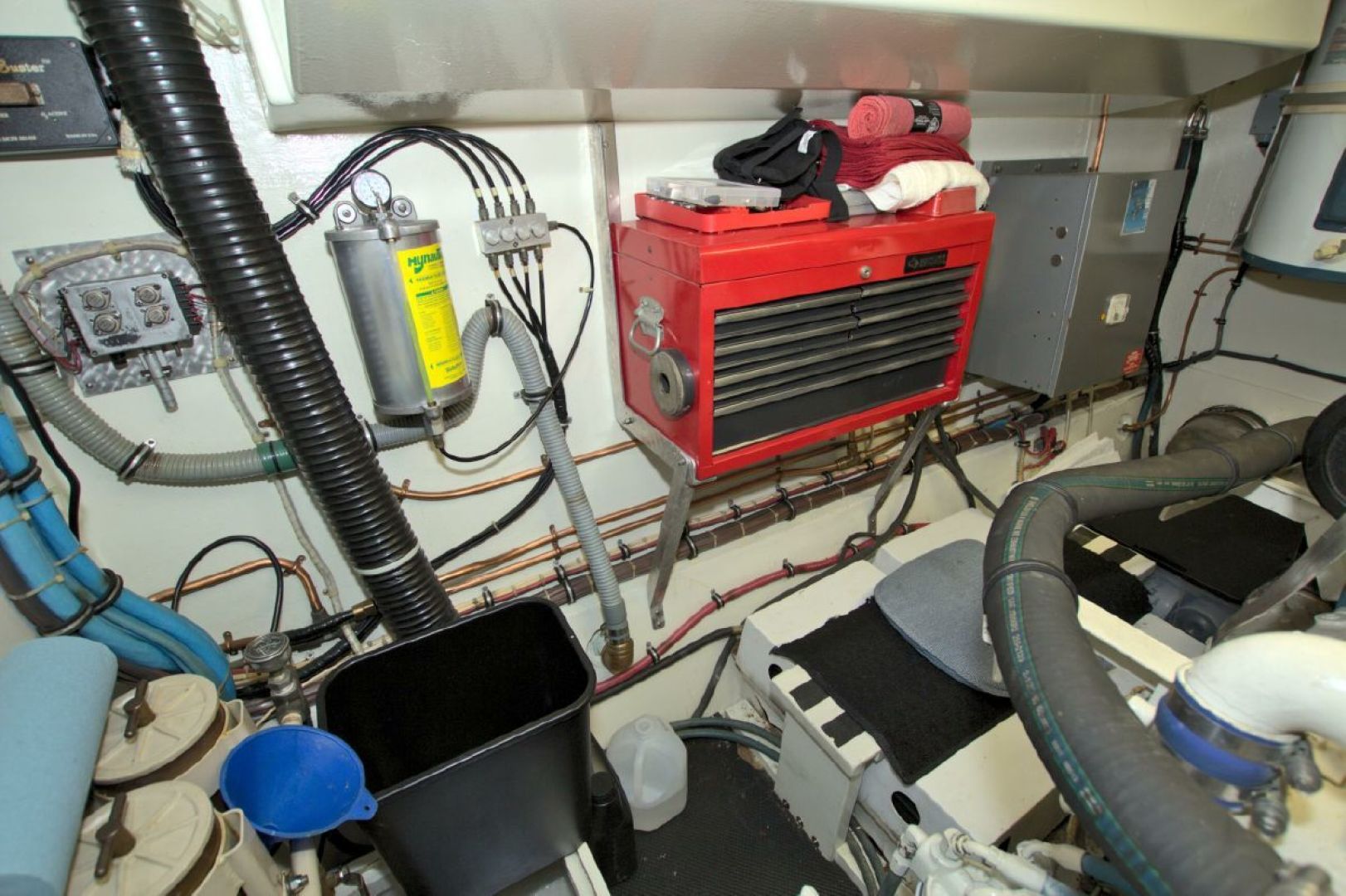 Aft of the VIP cabin are the twin engine rooms housing the spotless Detroit Diesel 12V-71 engines that produce 650HP each. Located outboard at the front of each engine room you will find a thick, plexiglass cover over each of the stabilizer actuators and related sensors. The starboard side engine room houses the hot water tank, ships tool box and common tools mounted on a magnetic bulk head. These rooms are illuminated by both AC and DC lighting systems. You will not find a more organized, cleaner engine room on any Hatteras of this vintage!!