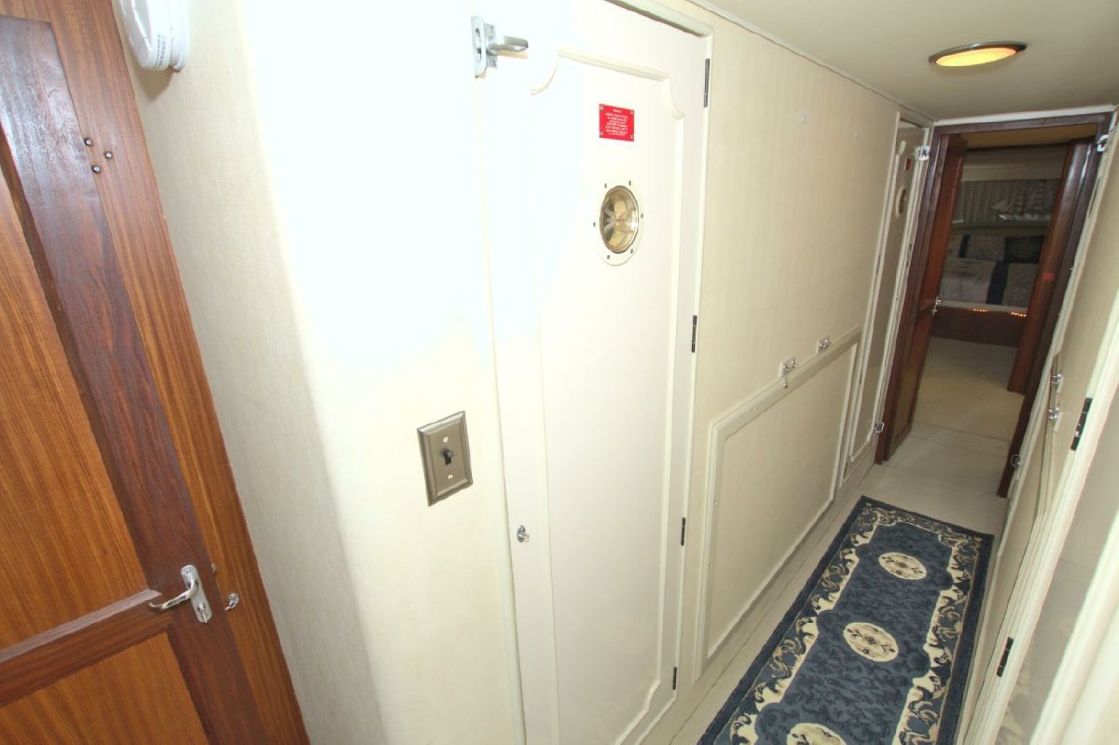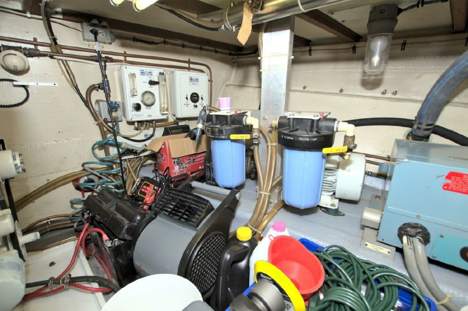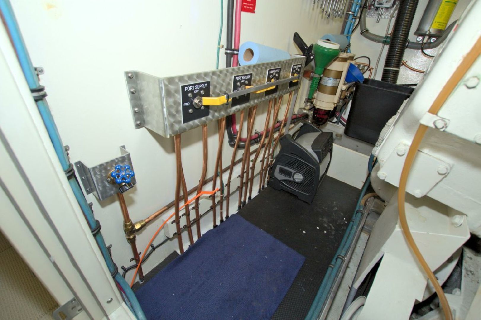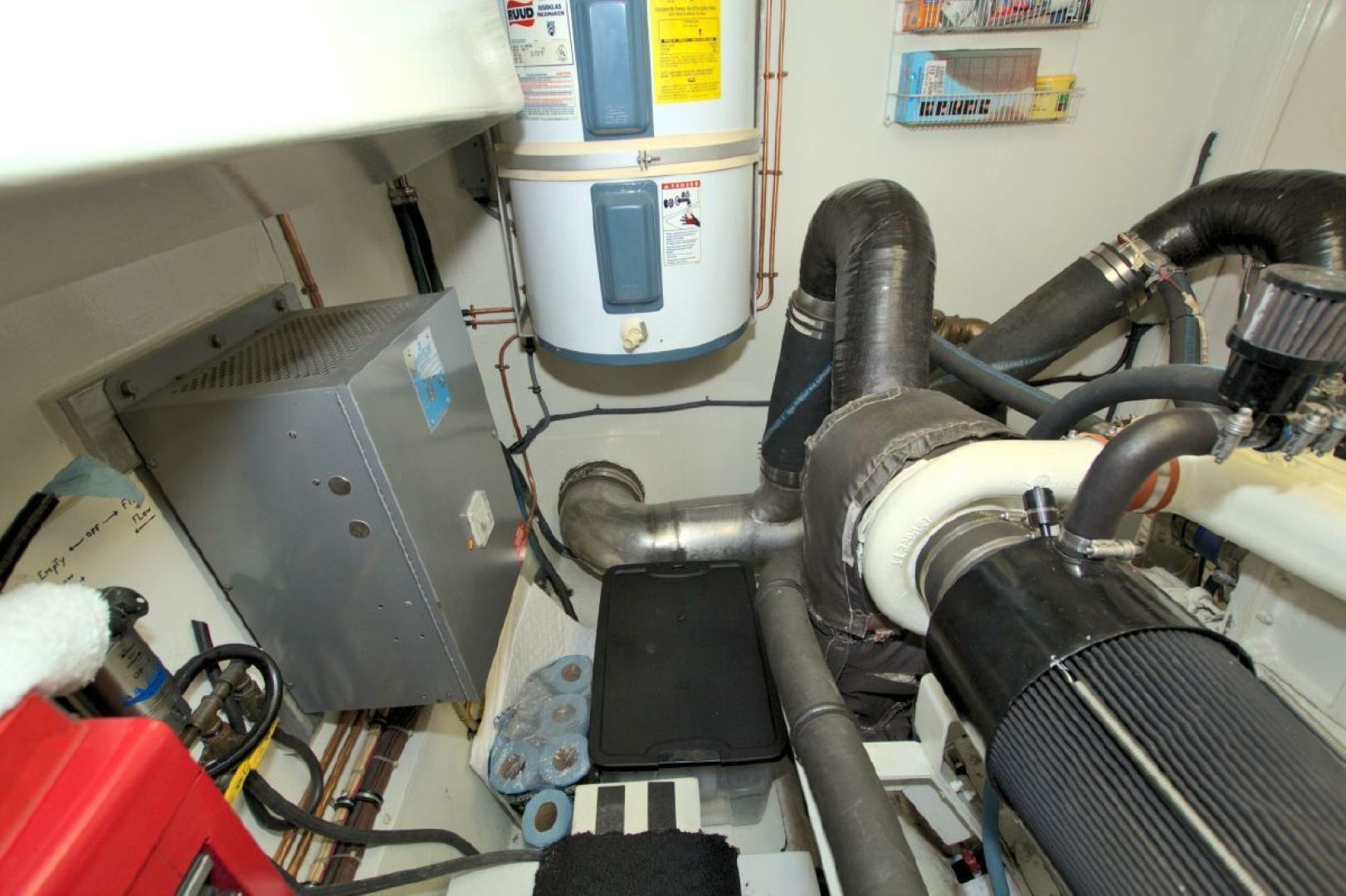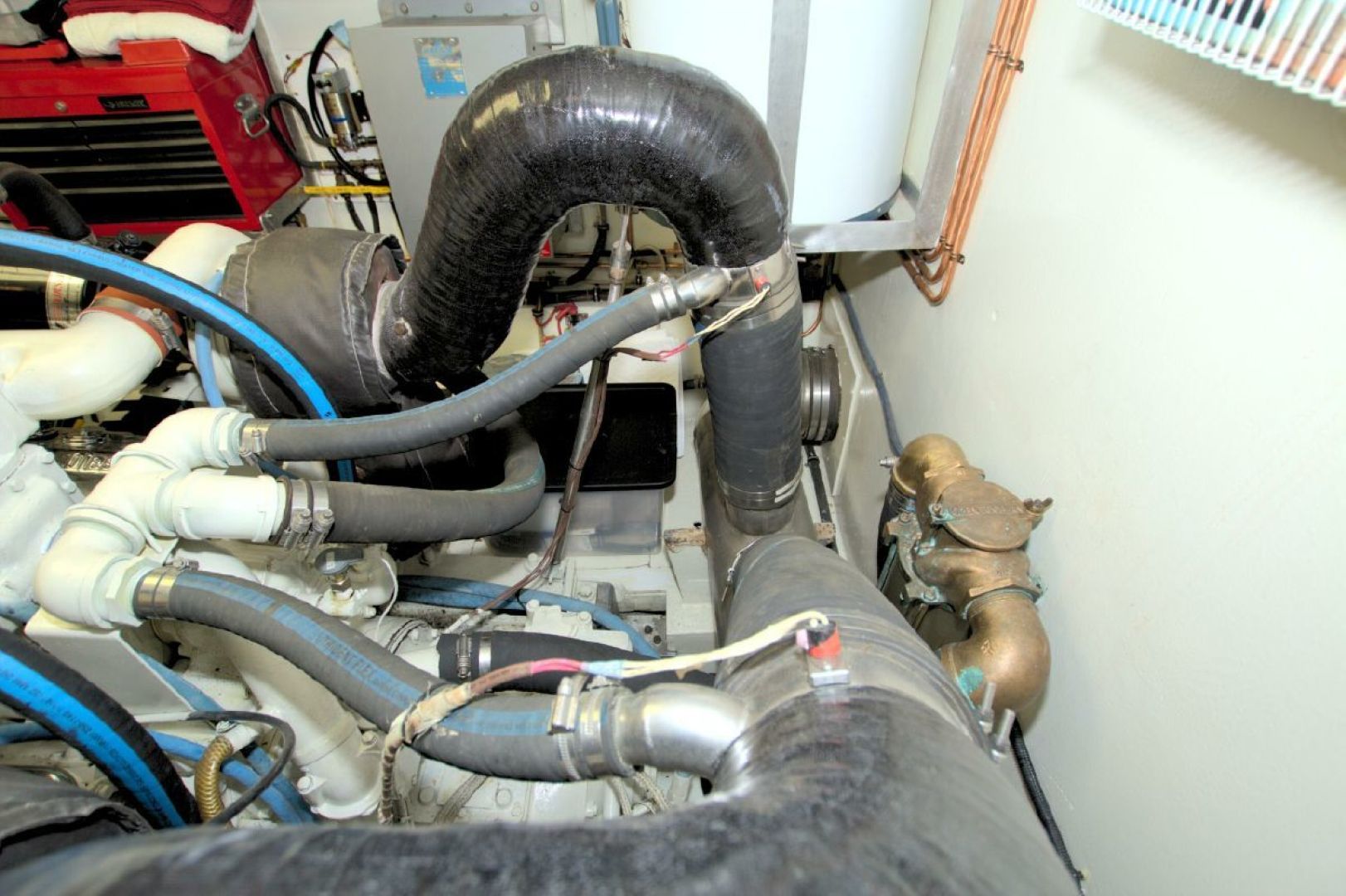 Aft of the VIP cabin are the twin engine rooms housing the spotless Detroit Diesel 12V-71 engines that produce 650HP each. Located outboard at the front of each engine room you will find a thick, plexiglass cover over each of the stabilizer actuators and related sensors. The starboard side engine room houses the hot water tank, ships tool box and common tools mounted on a magnetic bulk head. These rooms are illuminated by both AC and DC lighting systems. You will not find a more organized, cleaner engine room on any Hatteras of this vintage!!