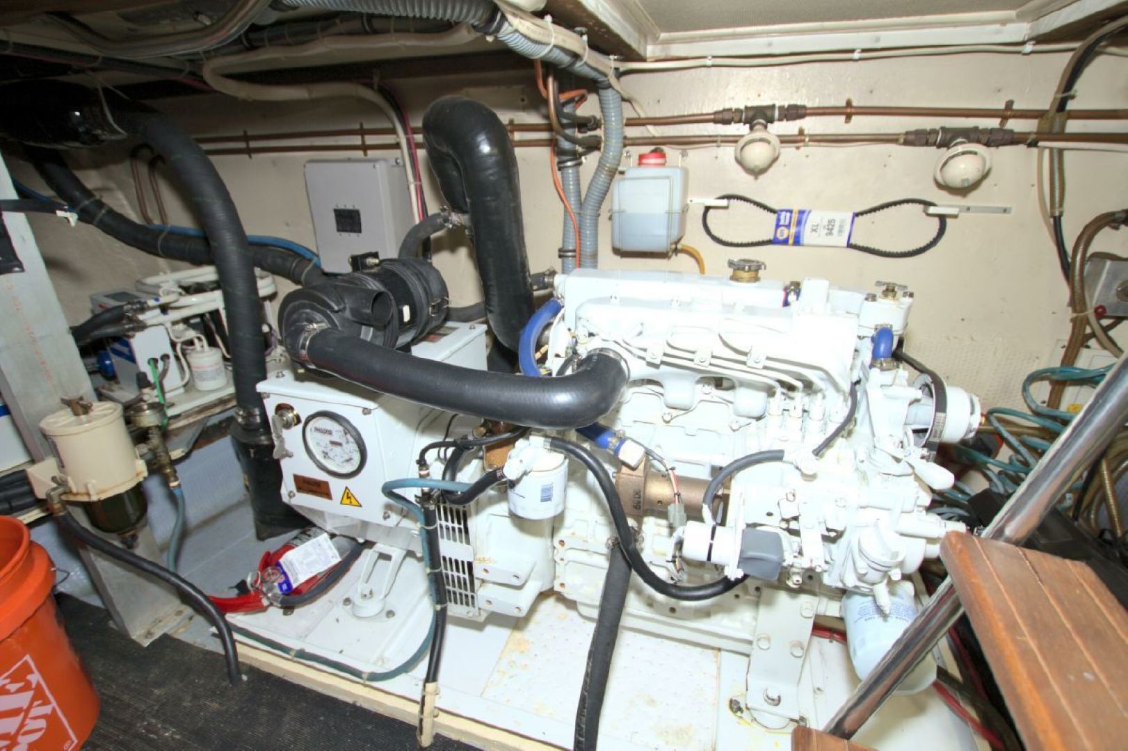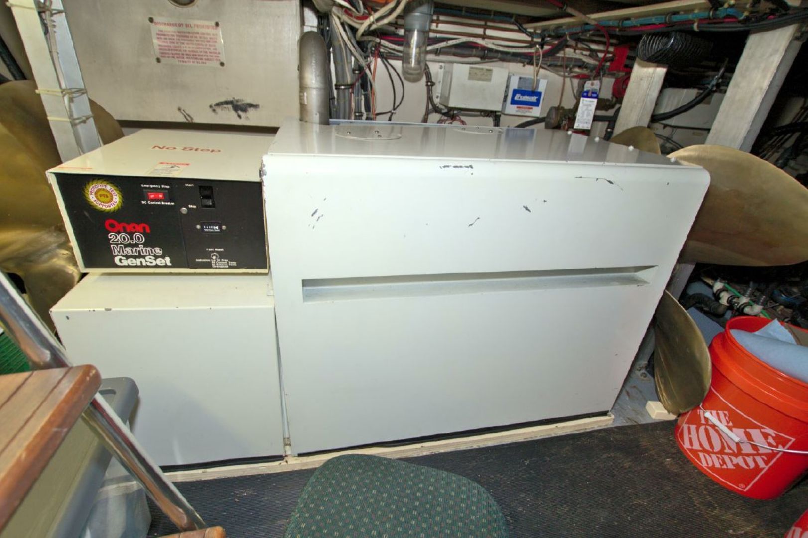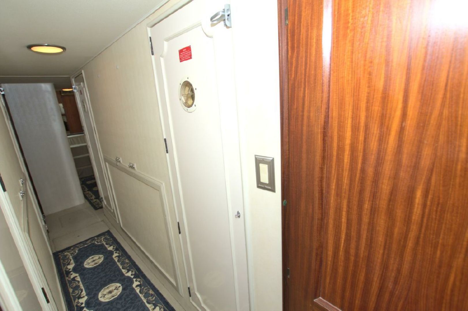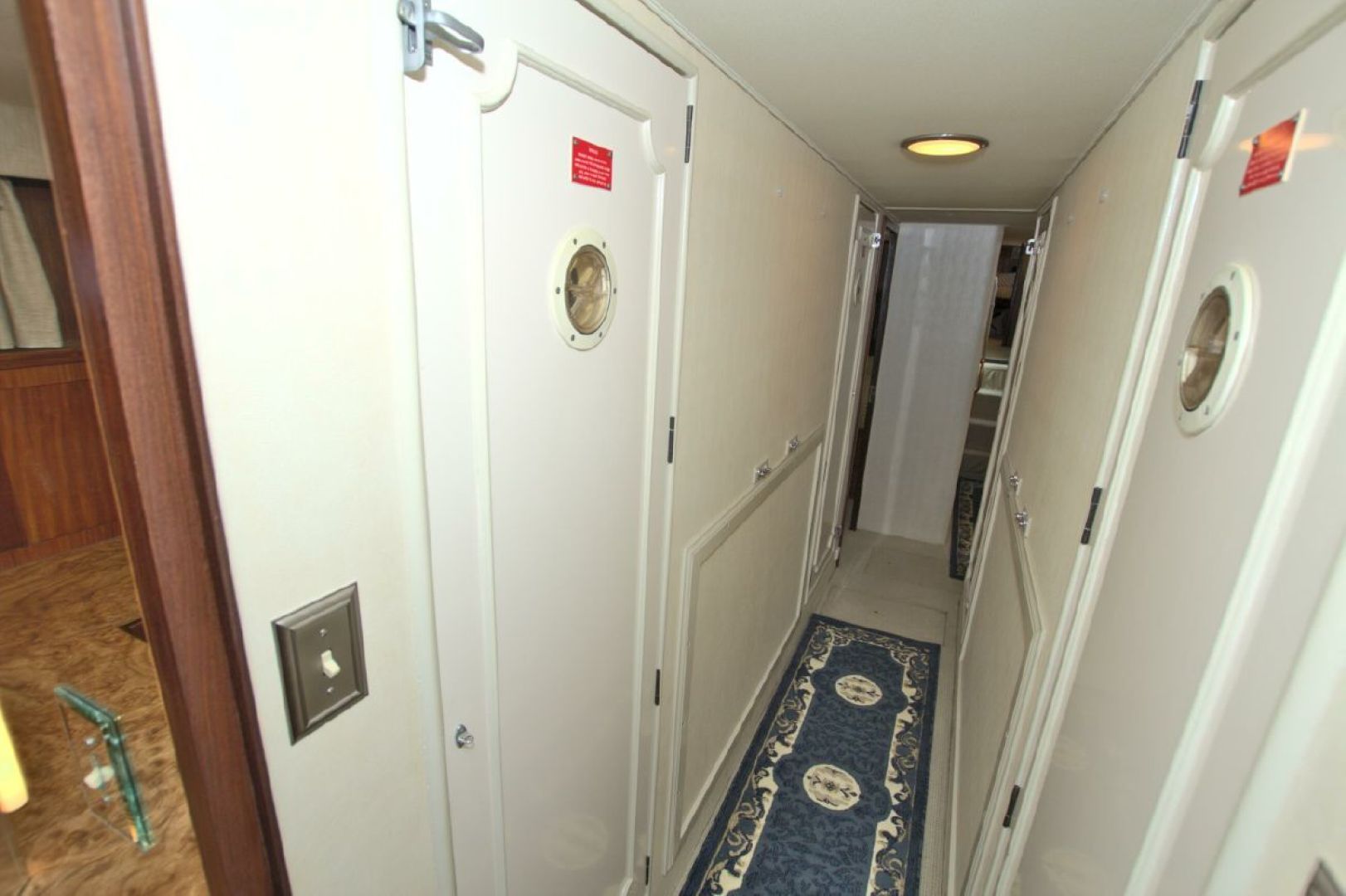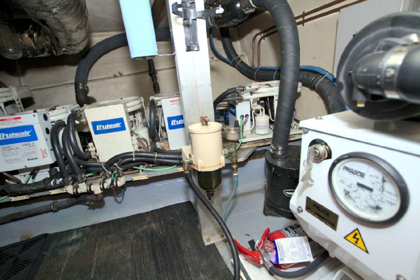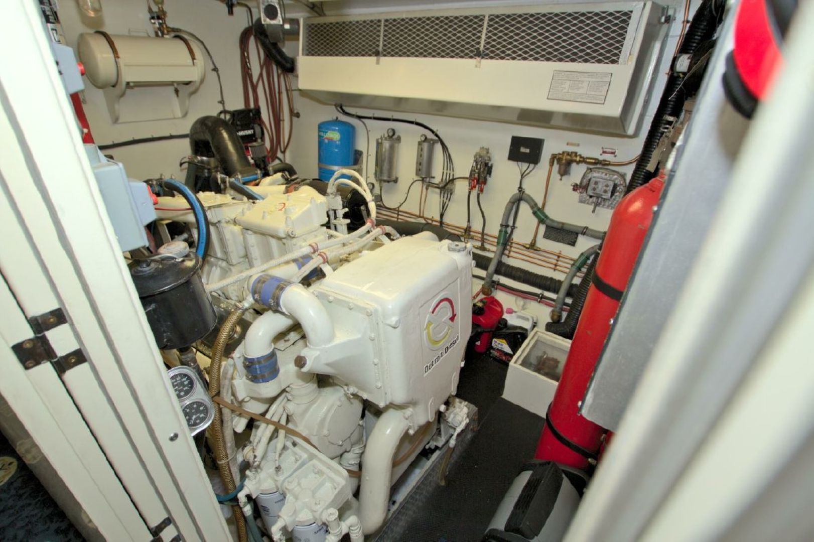 Aft of the VIP cabin are the twin engine rooms housing the spotless Detroit Diesel 12V-71 engines that produce 650HP each. Located outboard at the front of each engine room you will find a thick, plexiglass cover over each of the stabilizer actuators and related sensors. The starboard side engine room houses the hot water tank, ships tool box and common tools mounted on a magnetic bulk head. These rooms are illuminated by both AC and DC lighting systems. You will not find a more organized, cleaner engine room on any Hatteras of this vintage!!