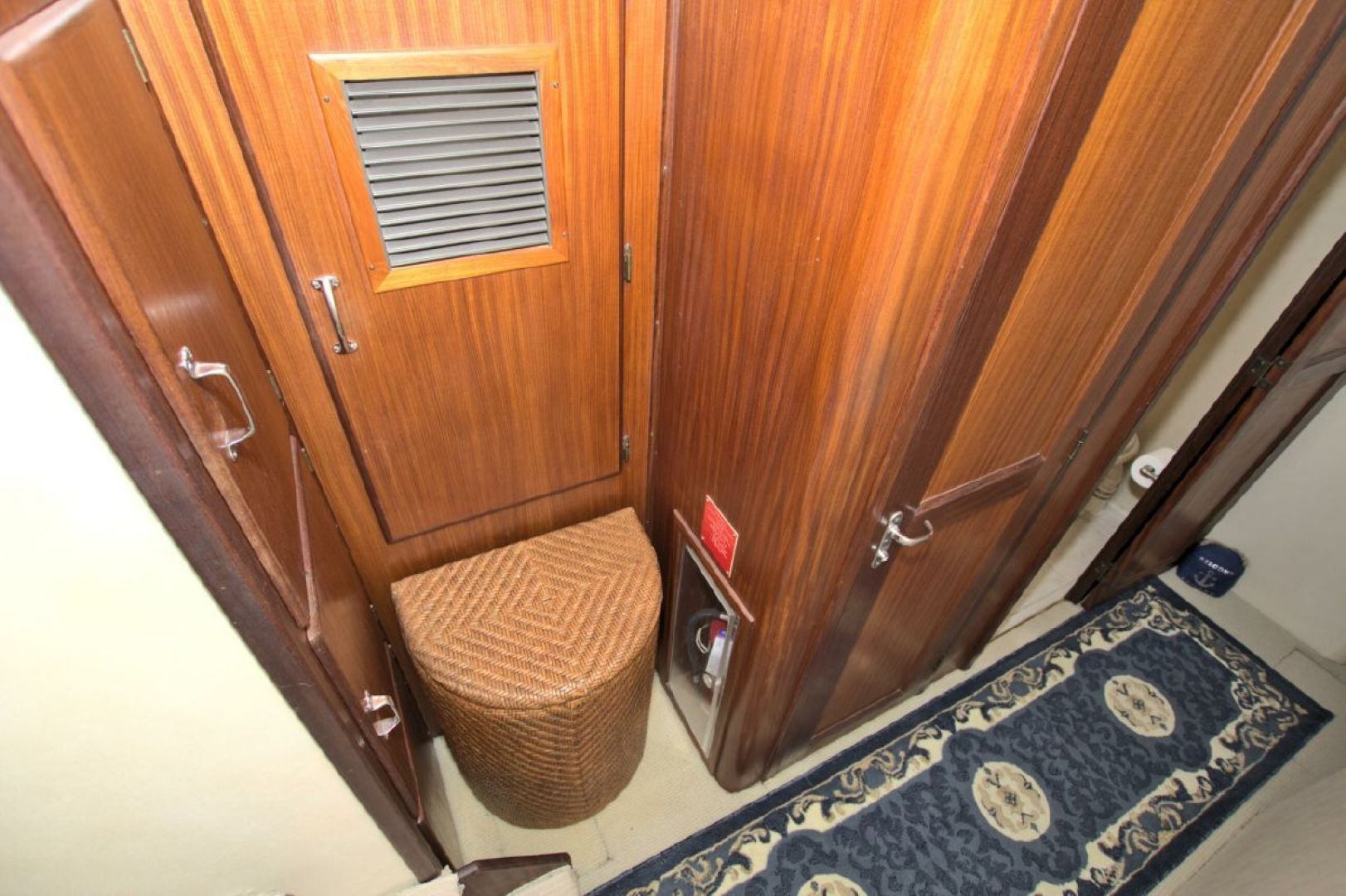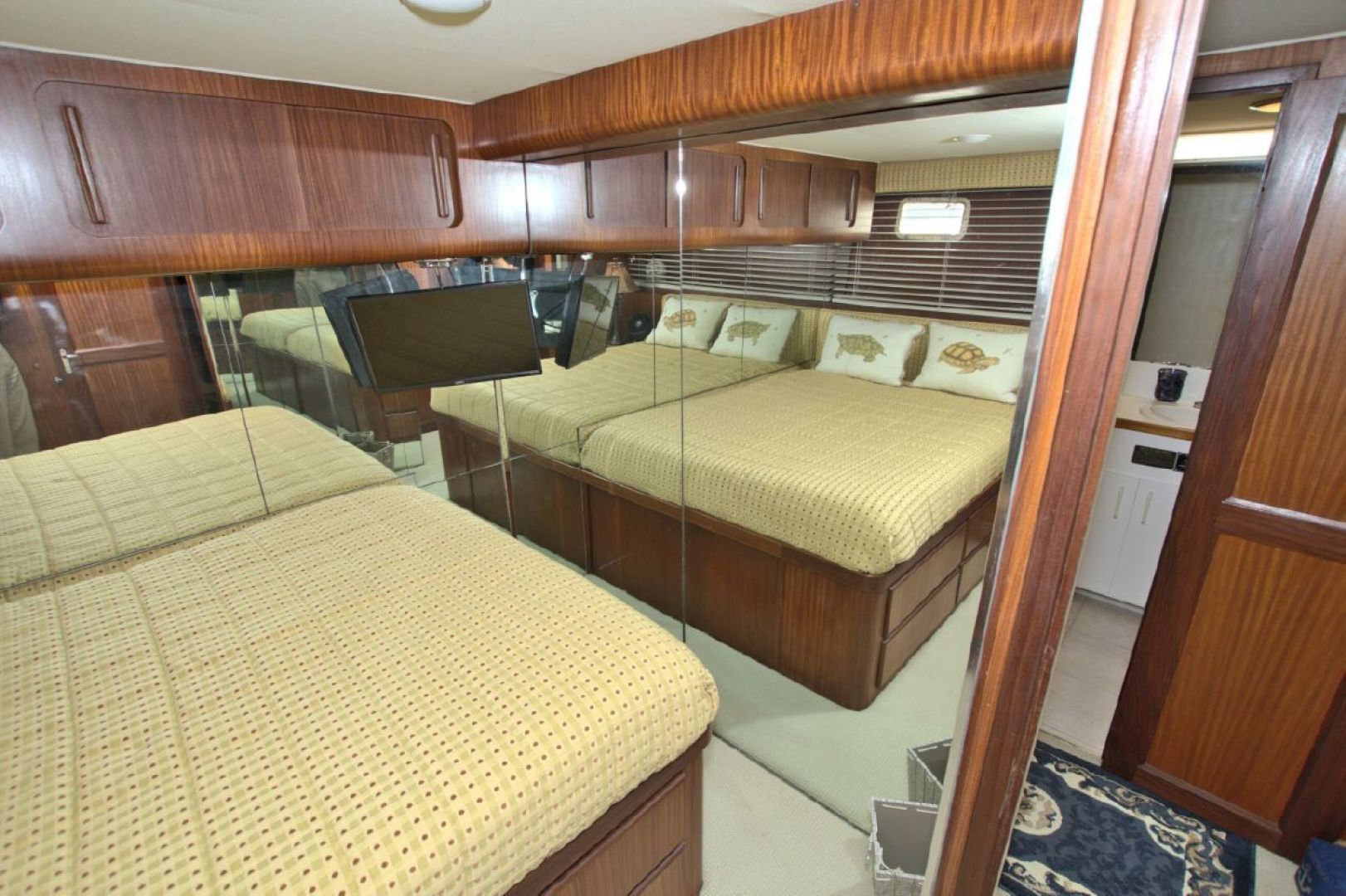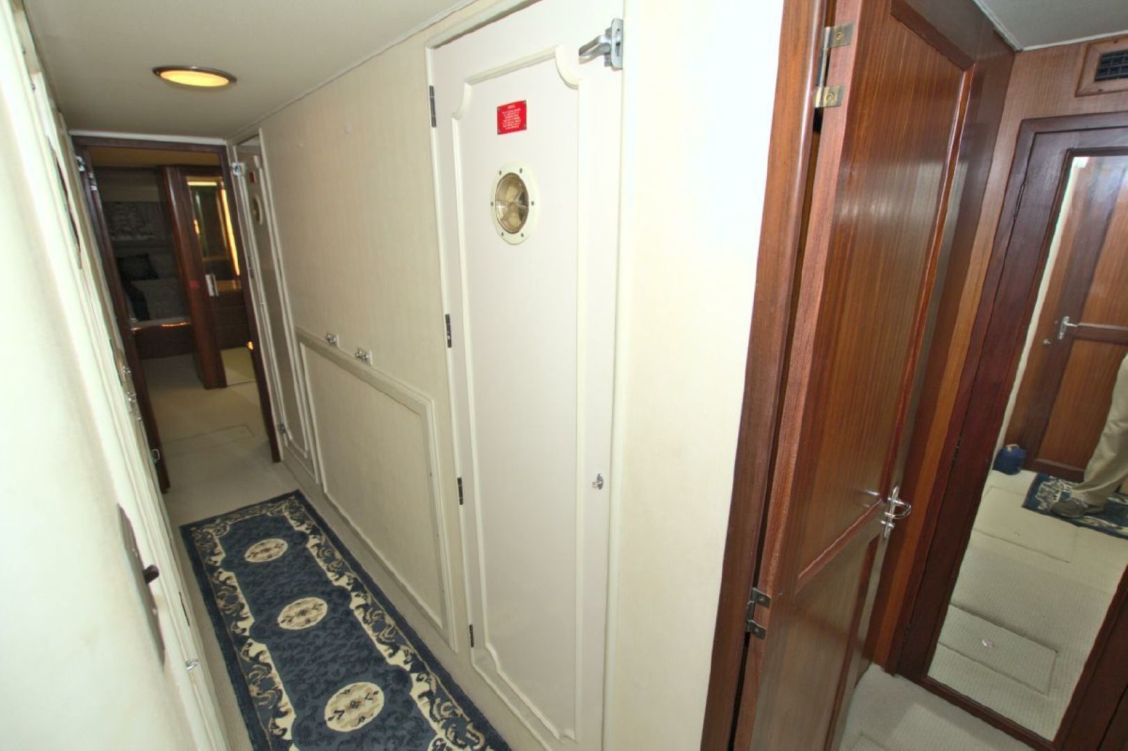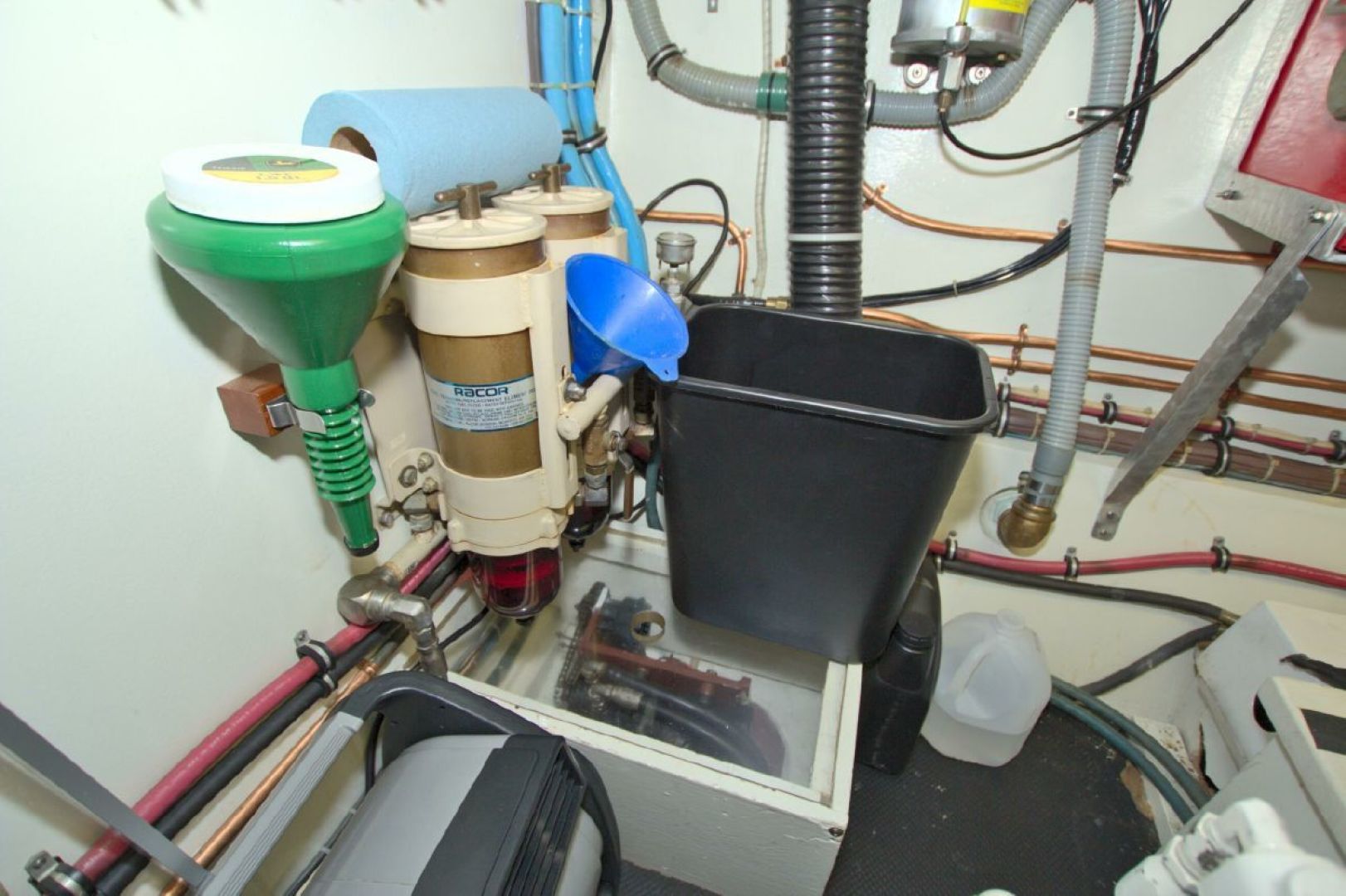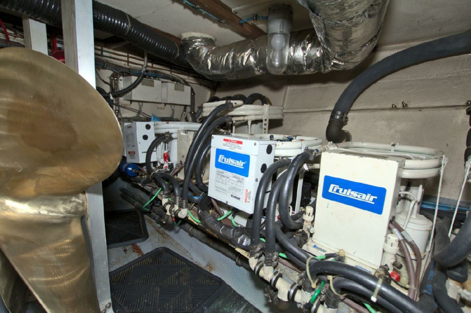 Aft of the VIP cabin are the twin engine rooms housing the spotless Detroit Diesel 12V-71 engines that produce 650HP each. Located outboard at the front of each engine room you will find a thick, plexiglass cover over each of the stabilizer actuators and related sensors. The starboard side engine room houses the hot water tank, ships tool box and common tools mounted on a magnetic bulk head. These rooms are illuminated by both AC and DC lighting systems. You will not find a more organized, cleaner engine room on any Hatteras of this vintage!!