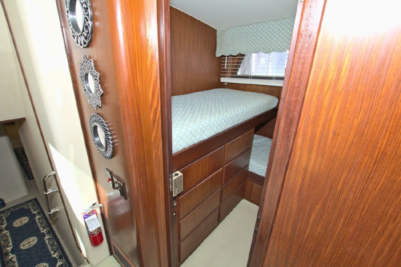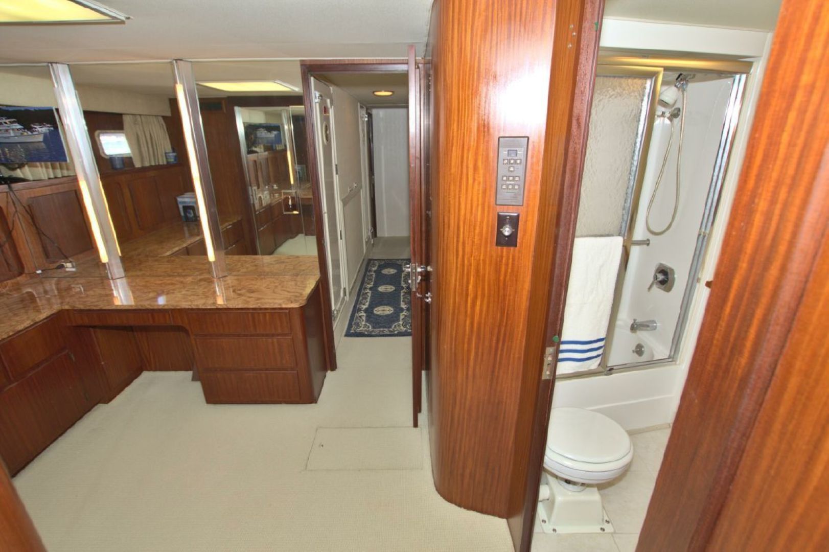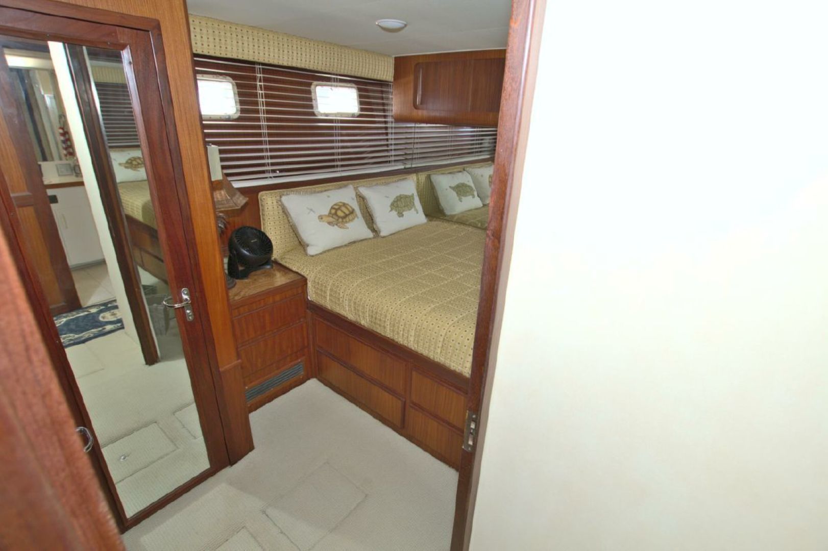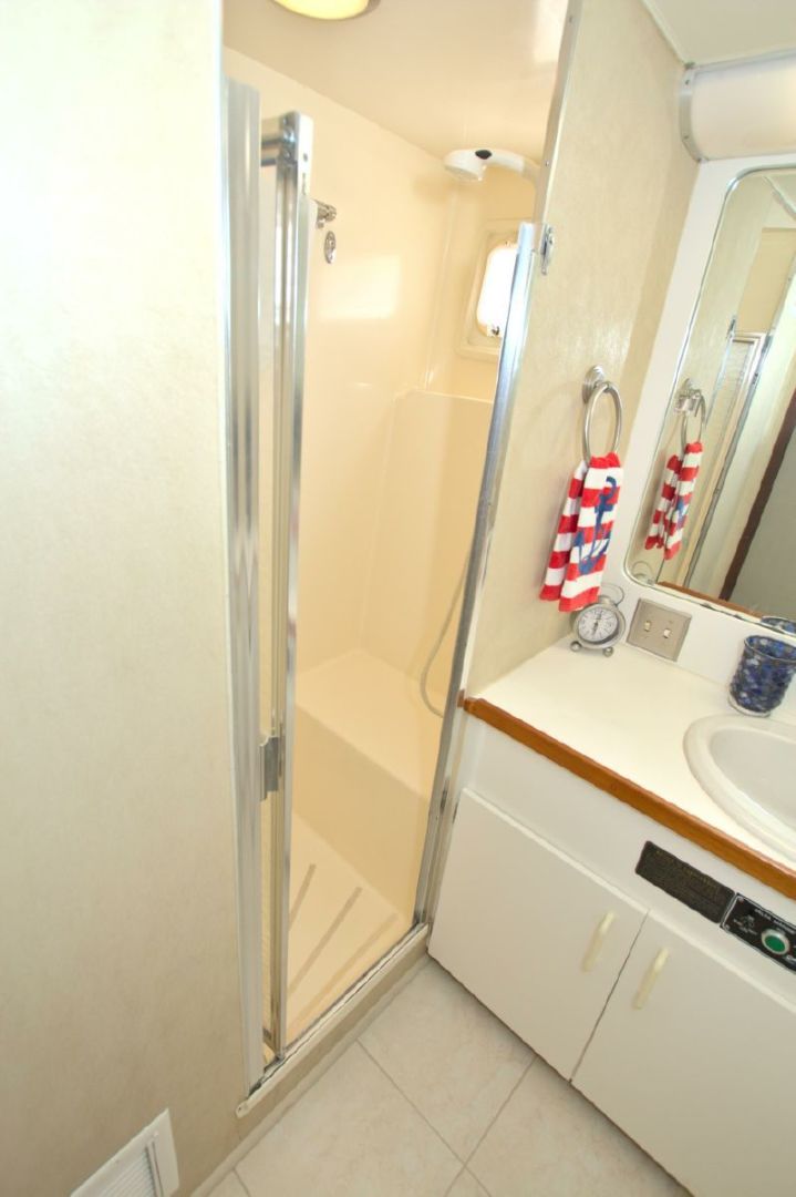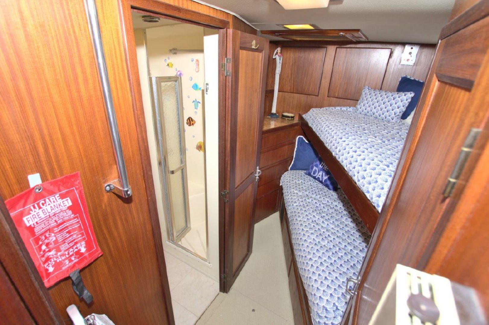 Aft of the VIP cabin are the twin engine rooms housing the spotless Detroit Diesel 12V-71 engines that produce 650HP each. Located outboard at the front of each engine room you will find a thick, plexiglass cover over each of the stabilizer actuators and related sensors. The starboard side engine room houses the hot water tank, ships tool box and common tools mounted on a magnetic bulk head. These rooms are illuminated by both AC and DC lighting systems. You will not find a more organized, cleaner engine room on any Hatteras of this vintage!!