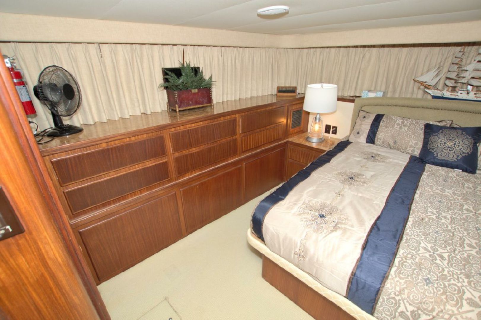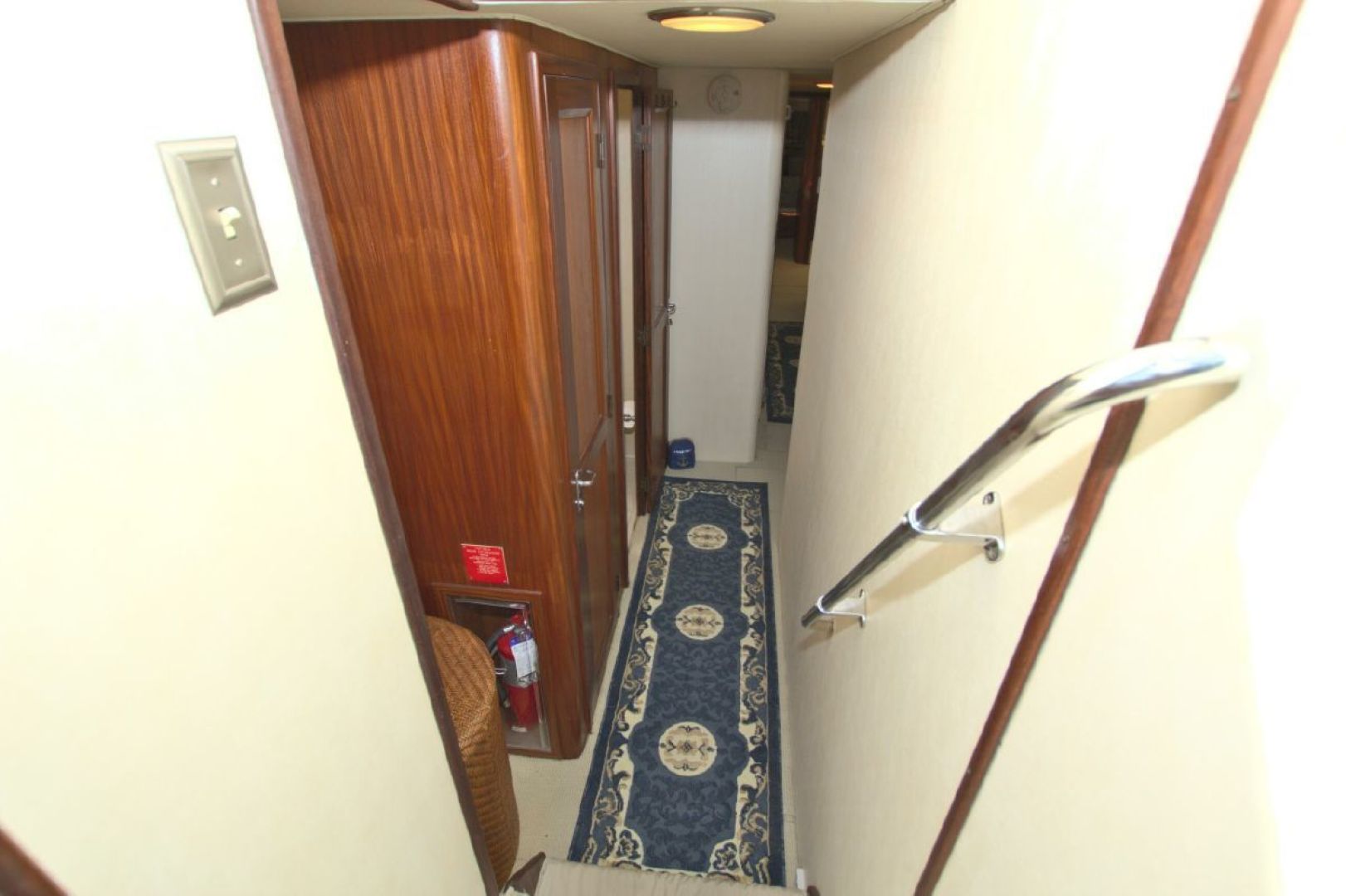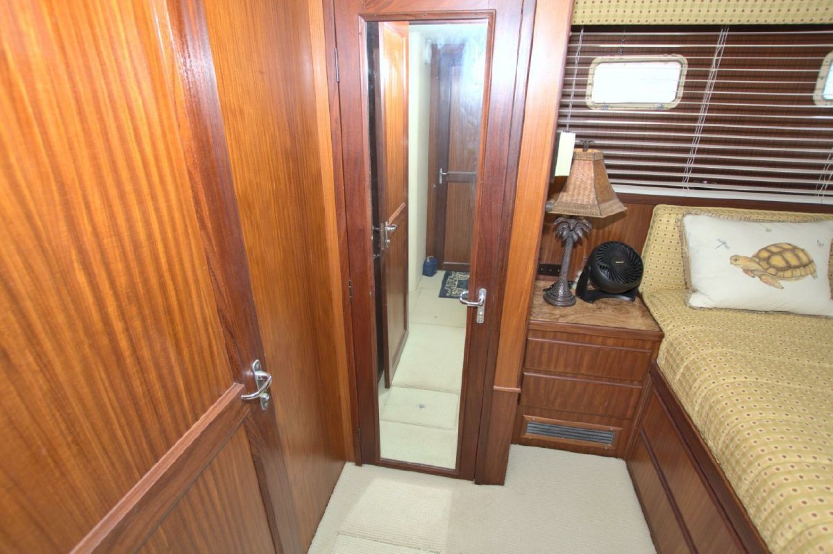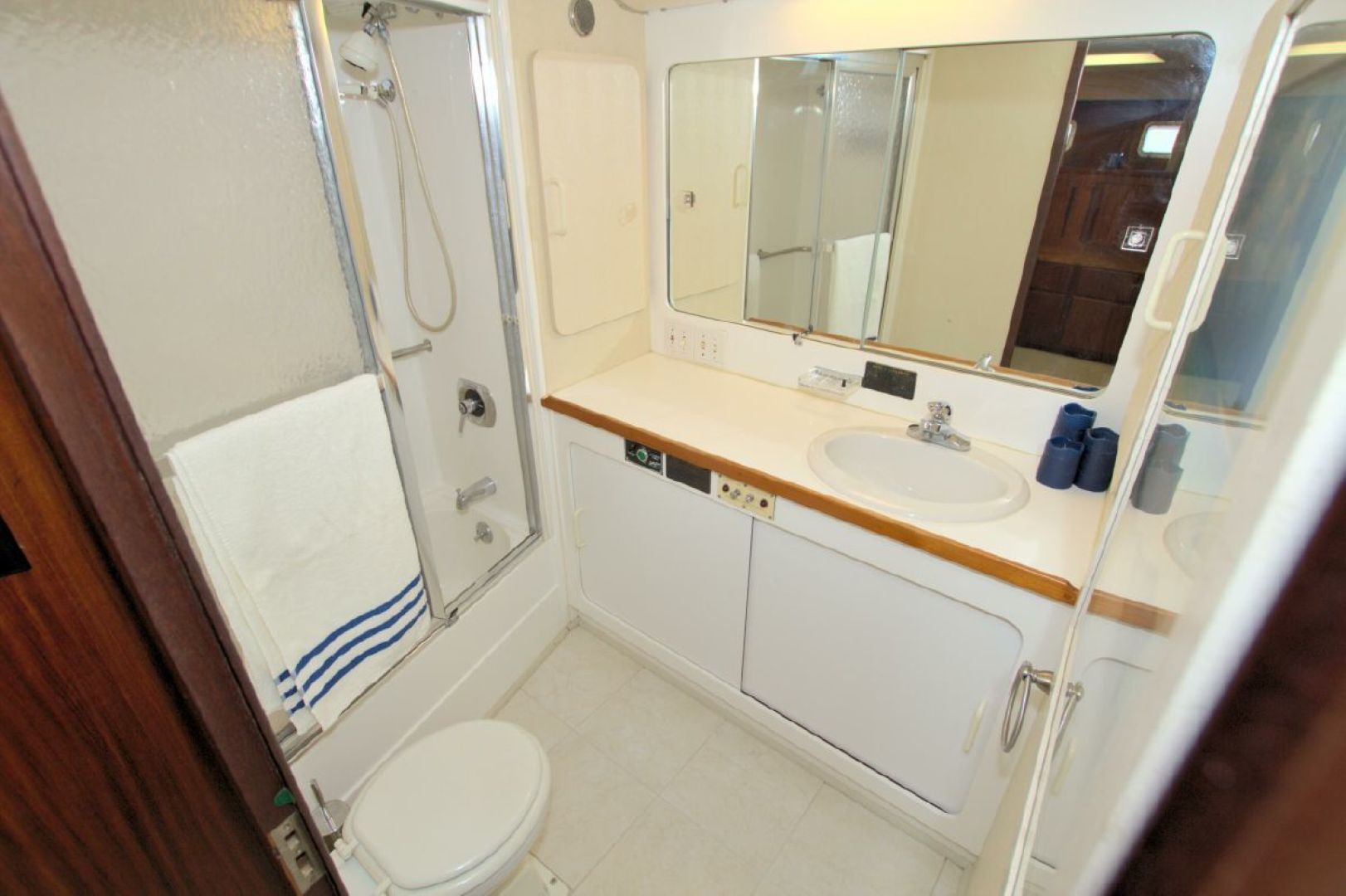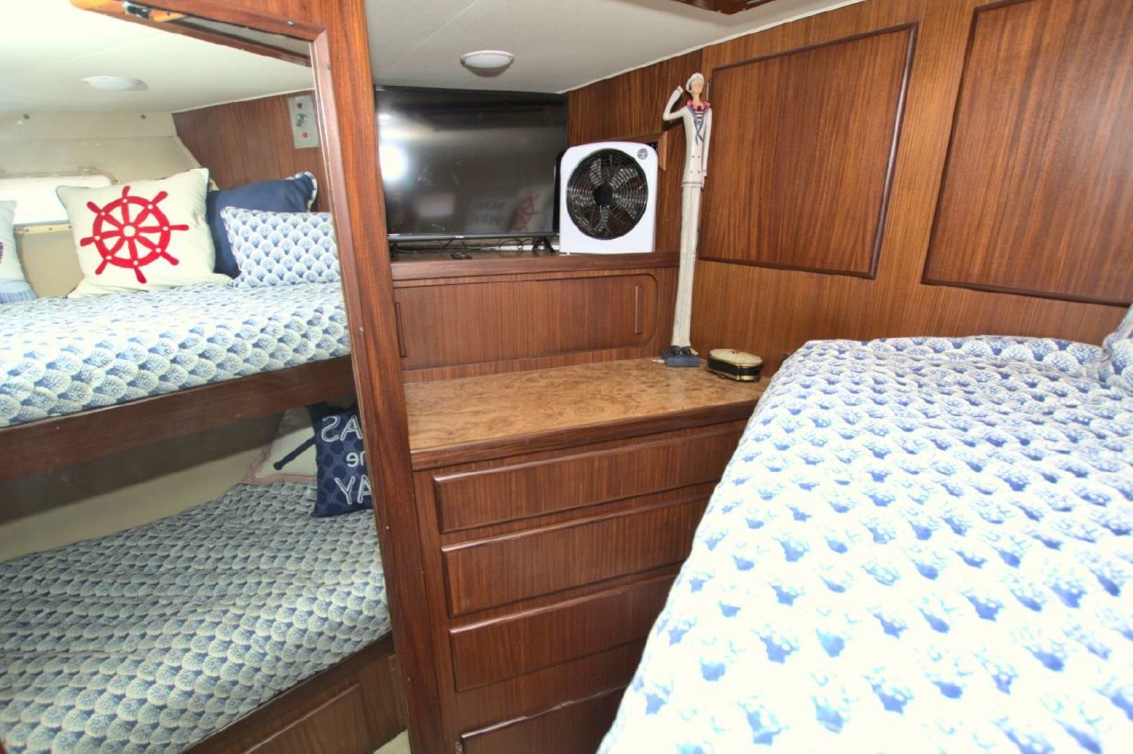 Aft of the VIP cabin are the twin engine rooms housing the spotless Detroit Diesel 12V-71 engines that produce 650HP each. Located outboard at the front of each engine room you will find a thick, plexiglass cover over each of the stabilizer actuators and related sensors. The starboard side engine room houses the hot water tank, ships tool box and common tools mounted on a magnetic bulk head. These rooms are illuminated by both AC and DC lighting systems. You will not find a more organized, cleaner engine room on any Hatteras of this vintage!!