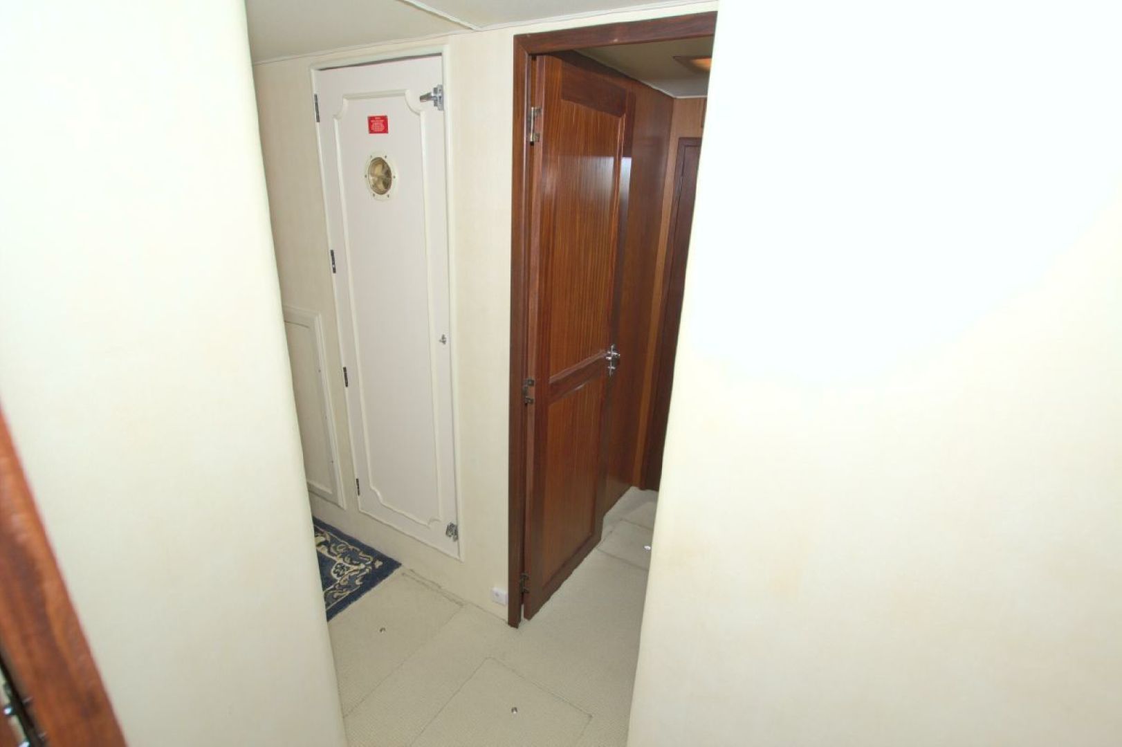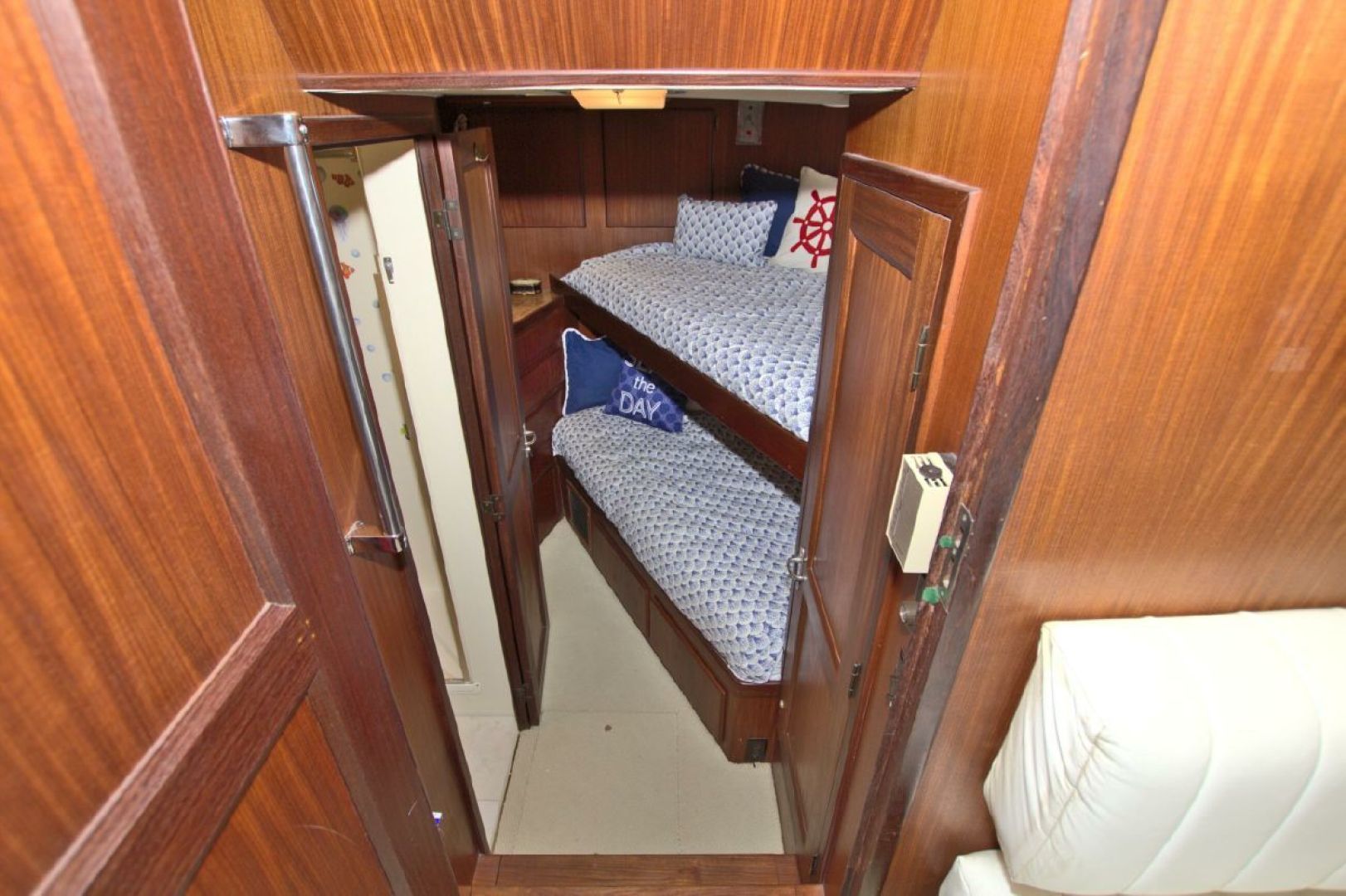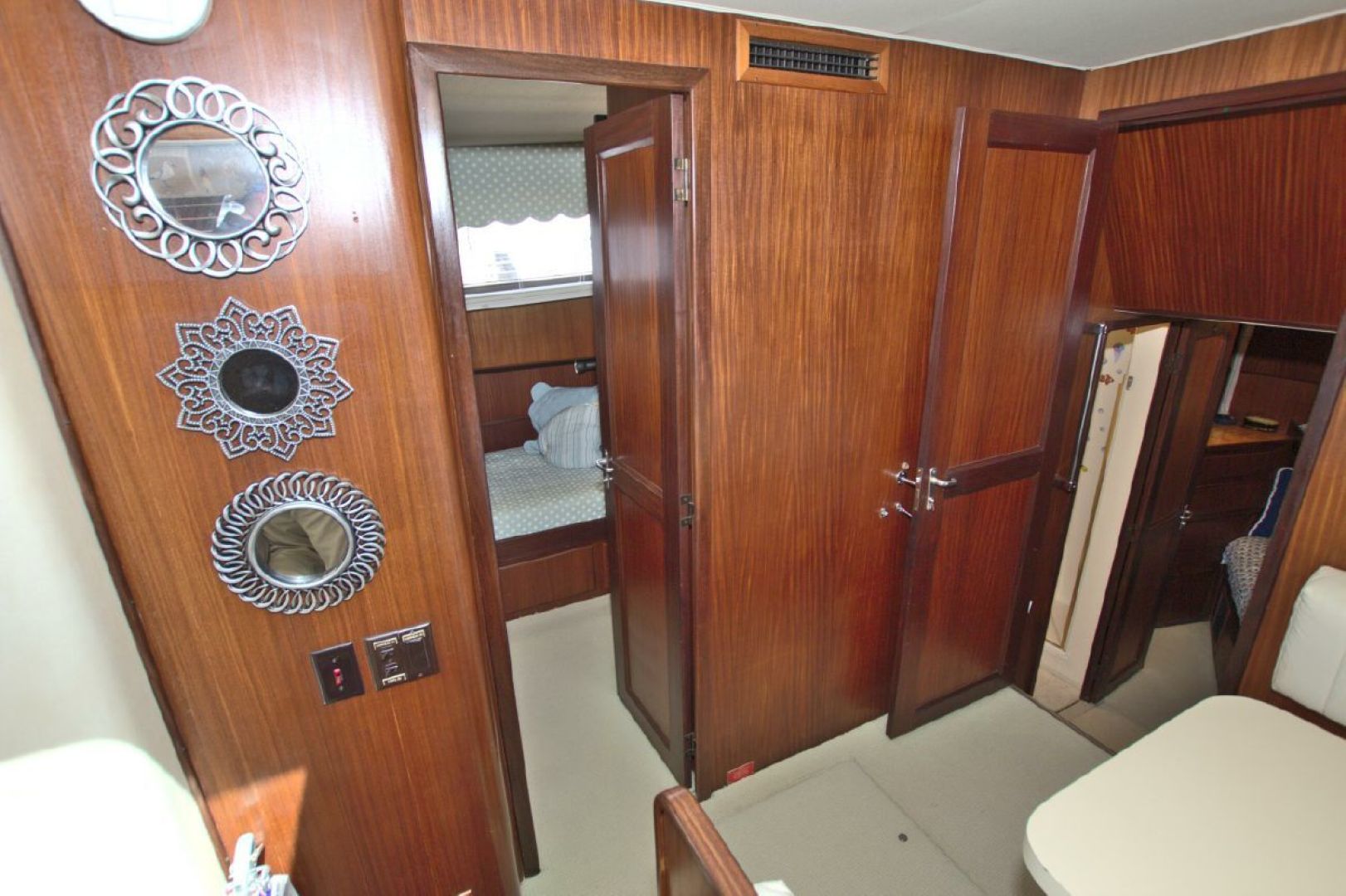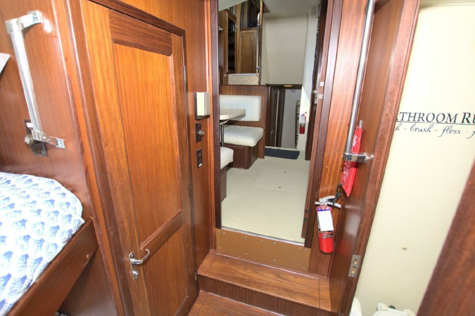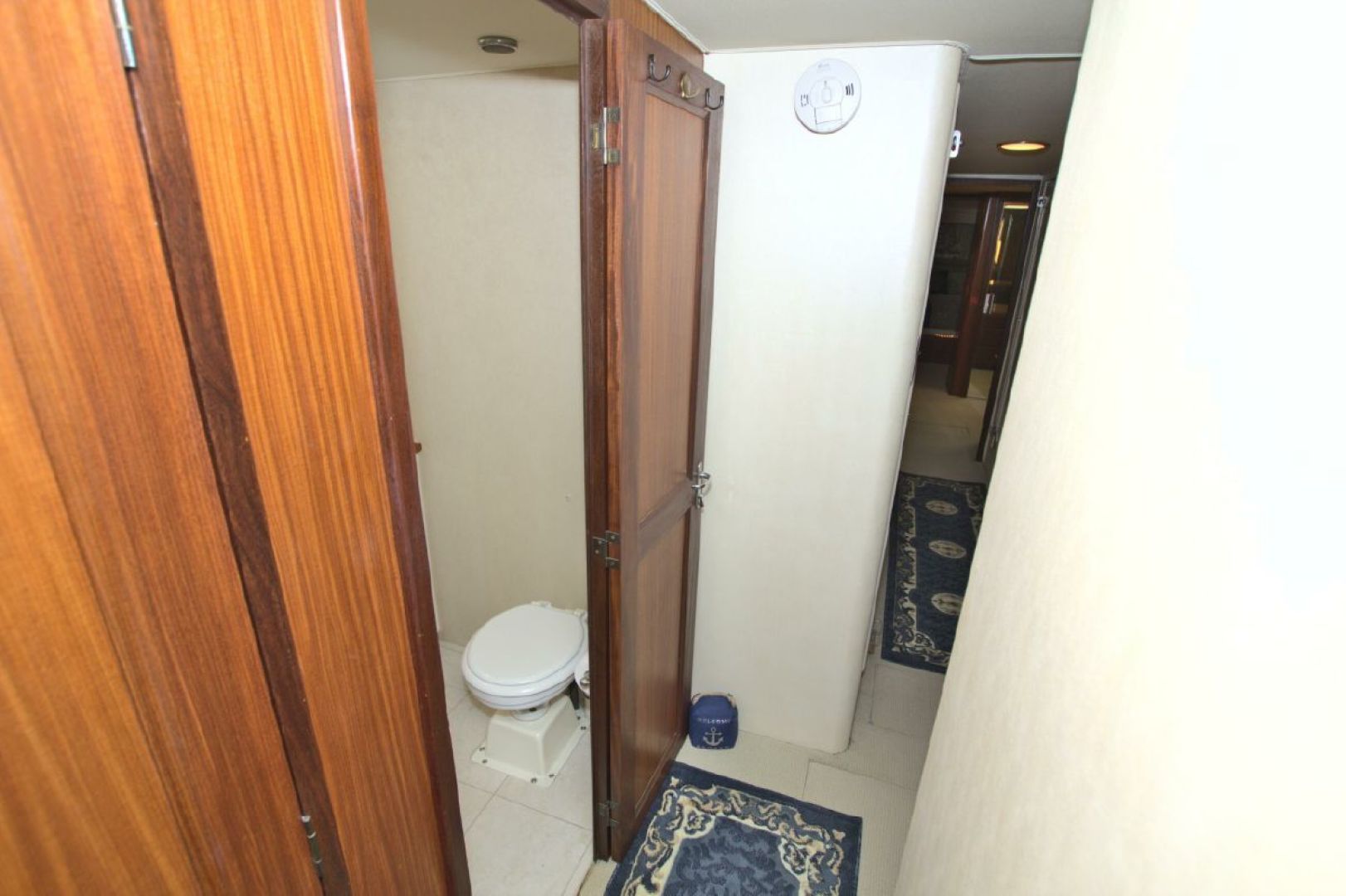 Aft of the VIP cabin are the twin engine rooms housing the spotless Detroit Diesel 12V-71 engines that produce 650HP each. Located outboard at the front of each engine room you will find a thick, plexiglass cover over each of the stabilizer actuators and related sensors. The starboard side engine room houses the hot water tank, ships tool box and common tools mounted on a magnetic bulk head. These rooms are illuminated by both AC and DC lighting systems. You will not find a more organized, cleaner engine room on any Hatteras of this vintage!!