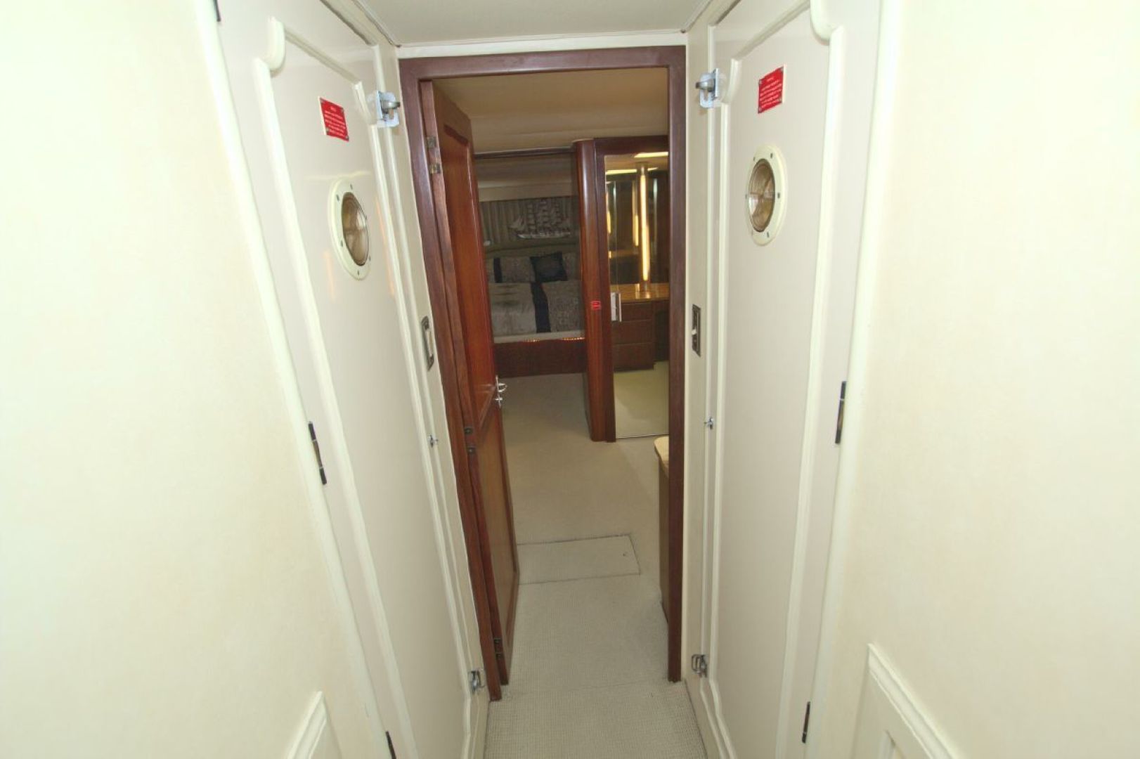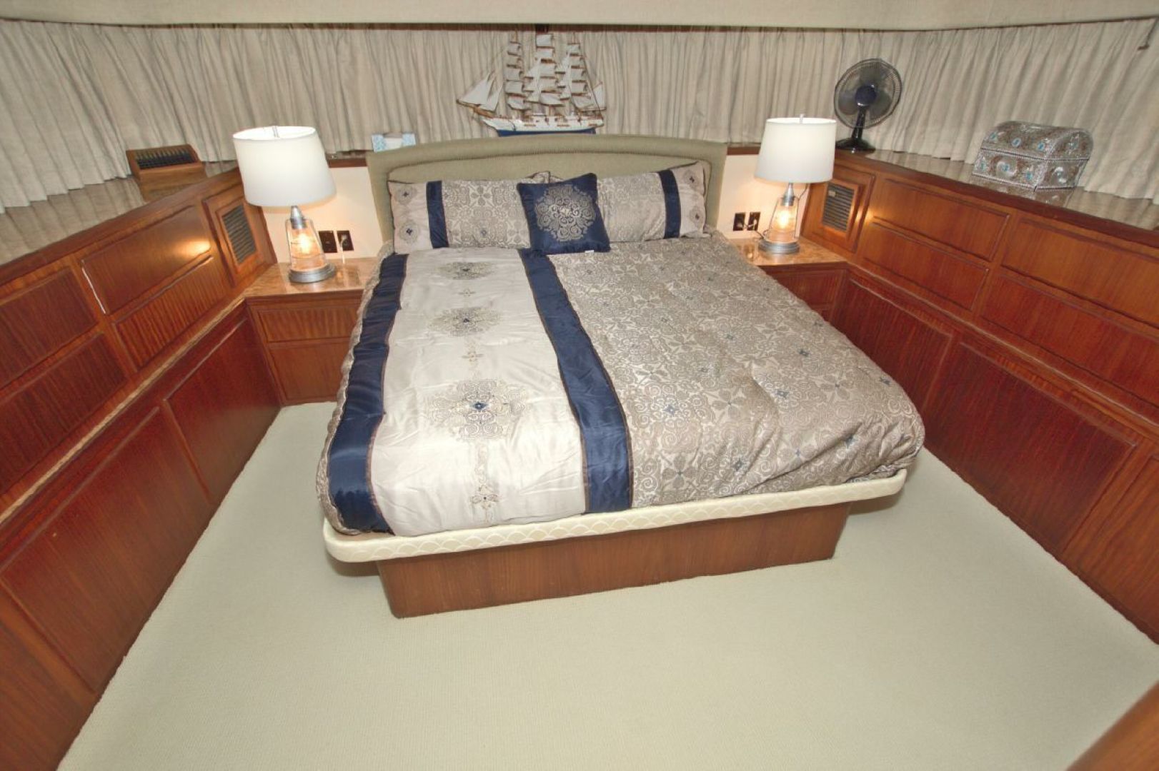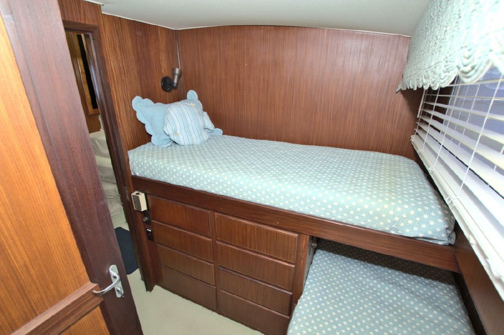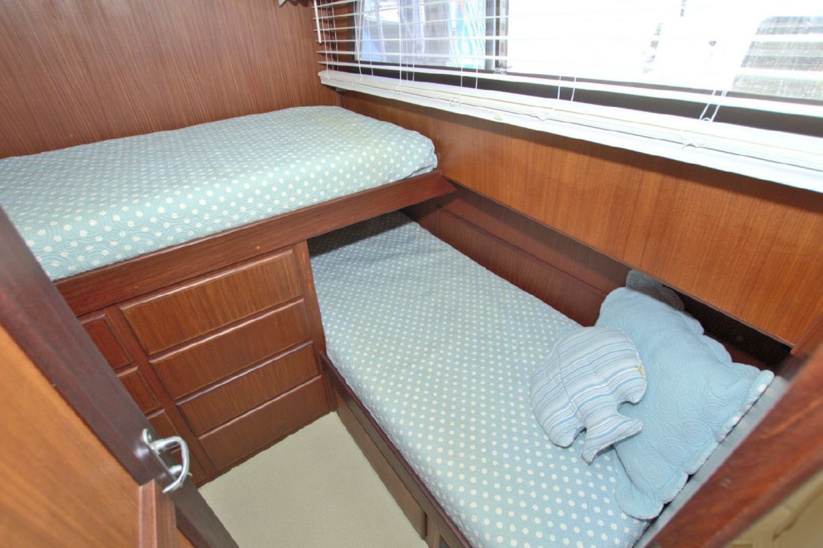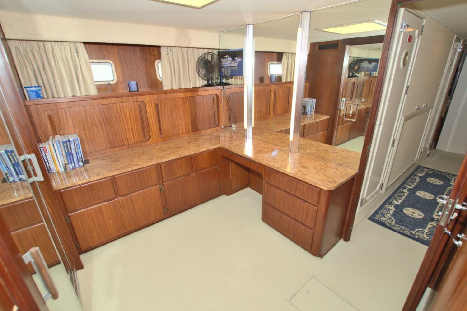 Aft of the VIP cabin are the twin engine rooms housing the spotless Detroit Diesel 12V-71 engines that produce 650HP each. Located outboard at the front of each engine room you will find a thick, plexiglass cover over each of the stabilizer actuators and related sensors. The starboard side engine room houses the hot water tank, ships tool box and common tools mounted on a magnetic bulk head. These rooms are illuminated by both AC and DC lighting systems. You will not find a more organized, cleaner engine room on any Hatteras of this vintage!!