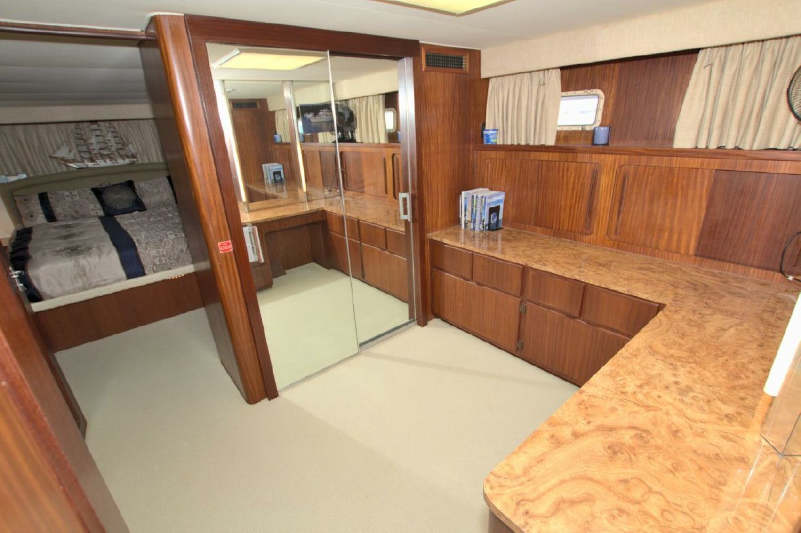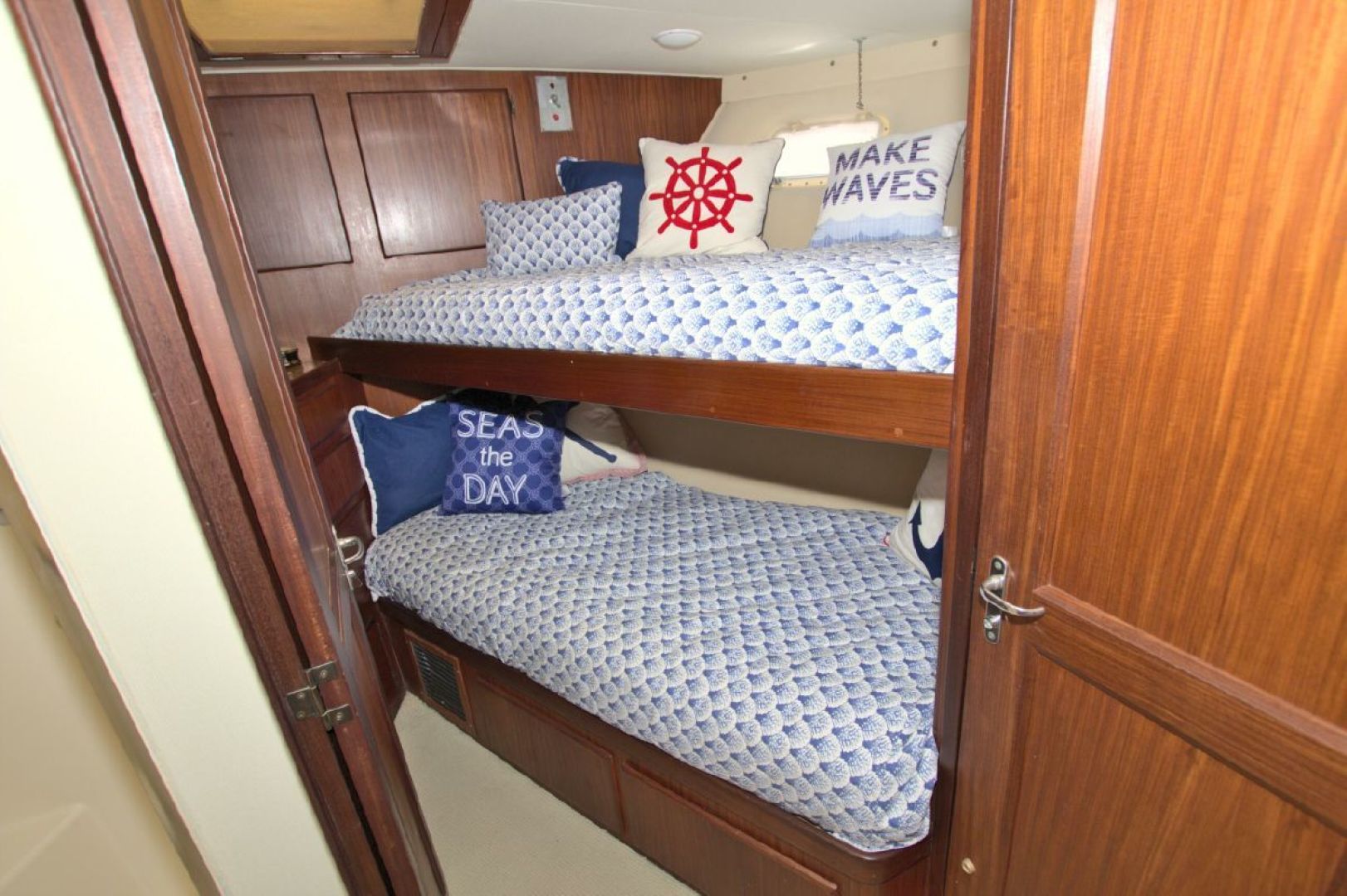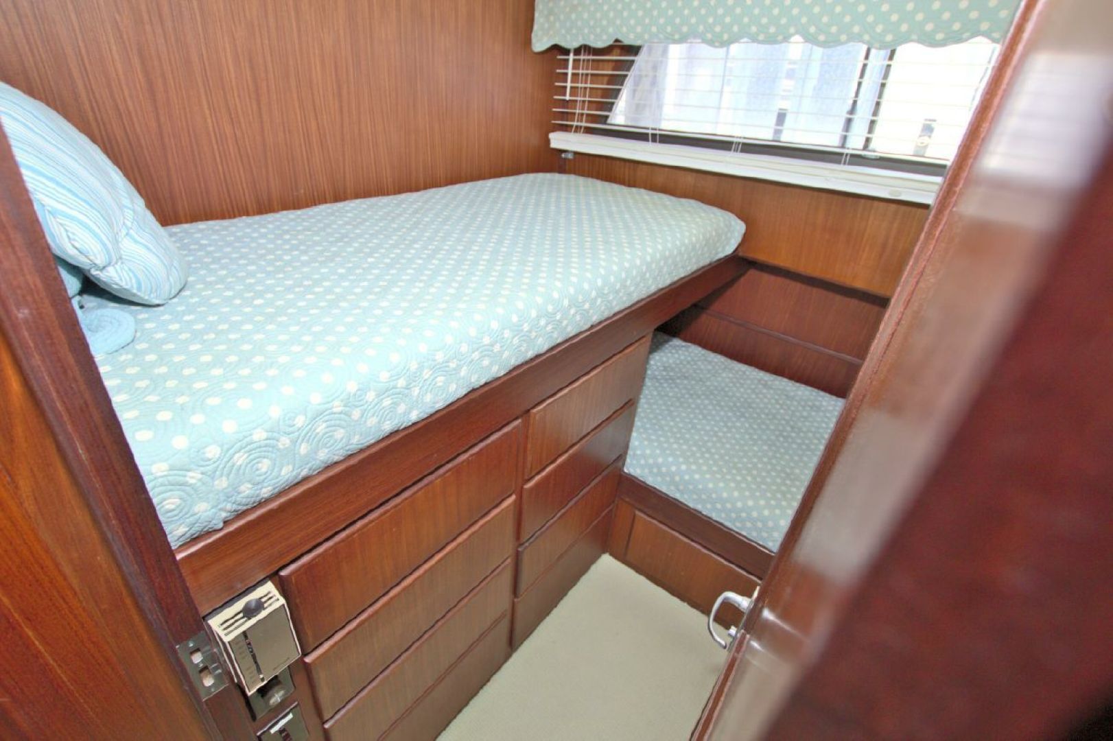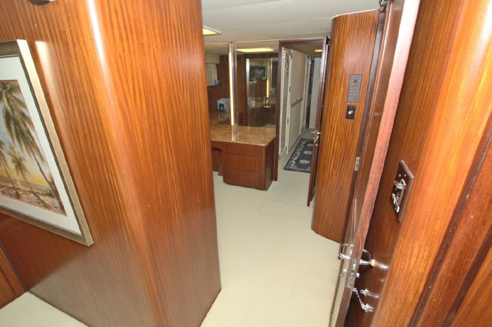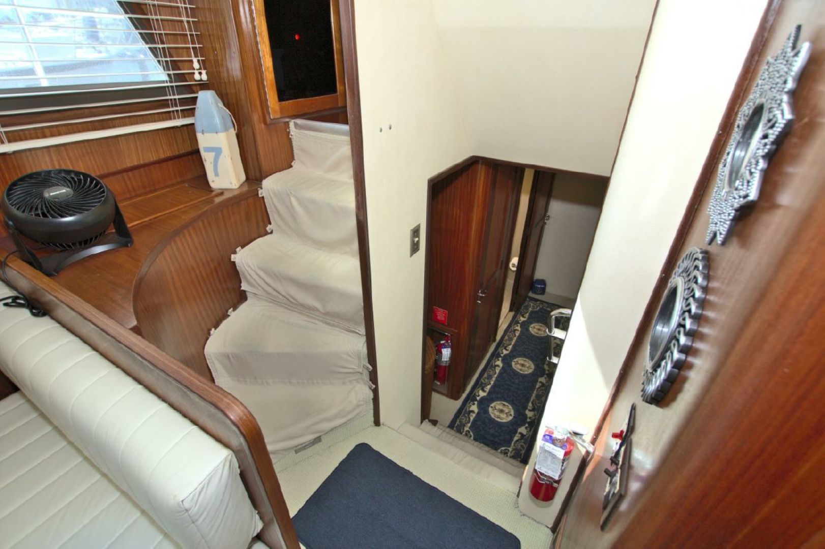 Aft of the VIP cabin are the twin engine rooms housing the spotless Detroit Diesel 12V-71 engines that produce 650HP each. Located outboard at the front of each engine room you will find a thick, plexiglass cover over each of the stabilizer actuators and related sensors. The starboard side engine room houses the hot water tank, ships tool box and common tools mounted on a magnetic bulk head. These rooms are illuminated by both AC and DC lighting systems. You will not find a more organized, cleaner engine room on any Hatteras of this vintage!!