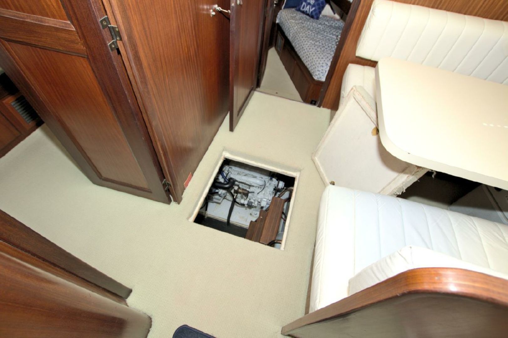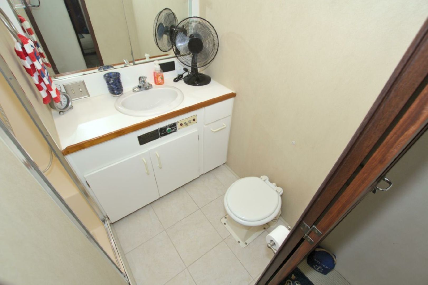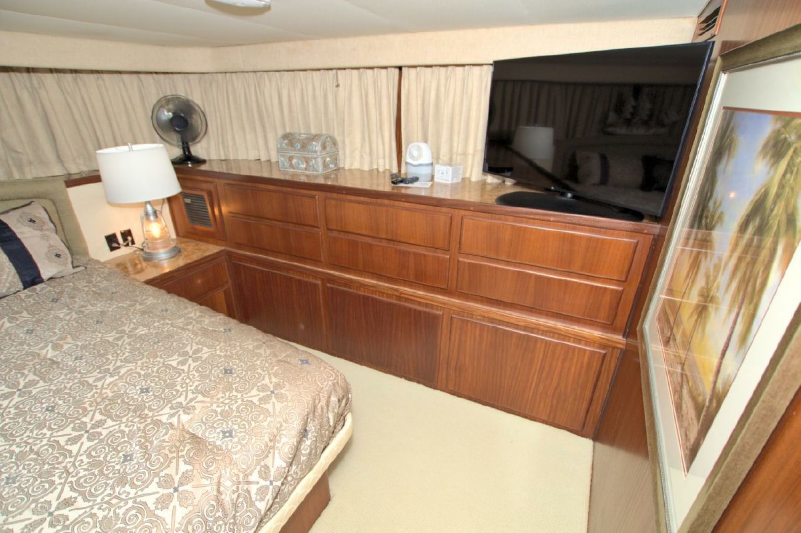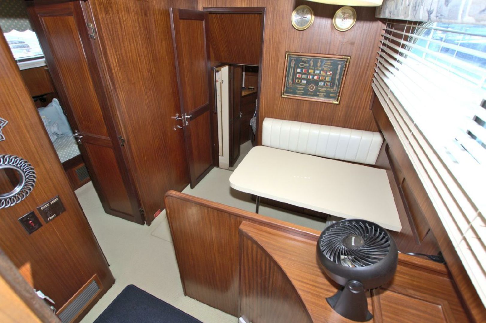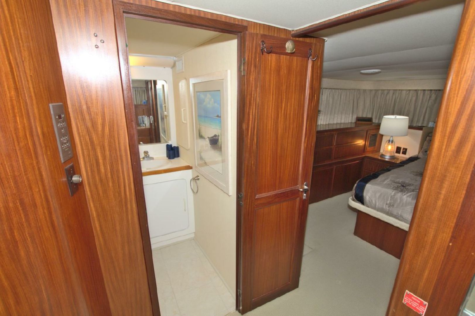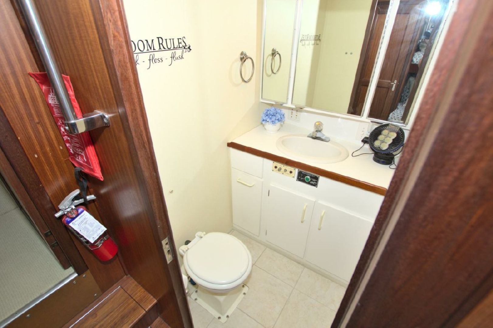Aft of the VIP cabin are the twin engine rooms housing the spotless Detroit Diesel 12V-71 engines that produce 650HP each. Located outboard at the front of each engine room you will find a thick, plexiglass cover over each of the stabilizer actuators and related sensors. The starboard side engine room houses the hot water tank, ships tool box and common tools mounted on a magnetic bulk head. These rooms are illuminated by both AC and DC lighting systems. You will not find a more organized, cleaner engine room on any Hatteras of this vintage!!