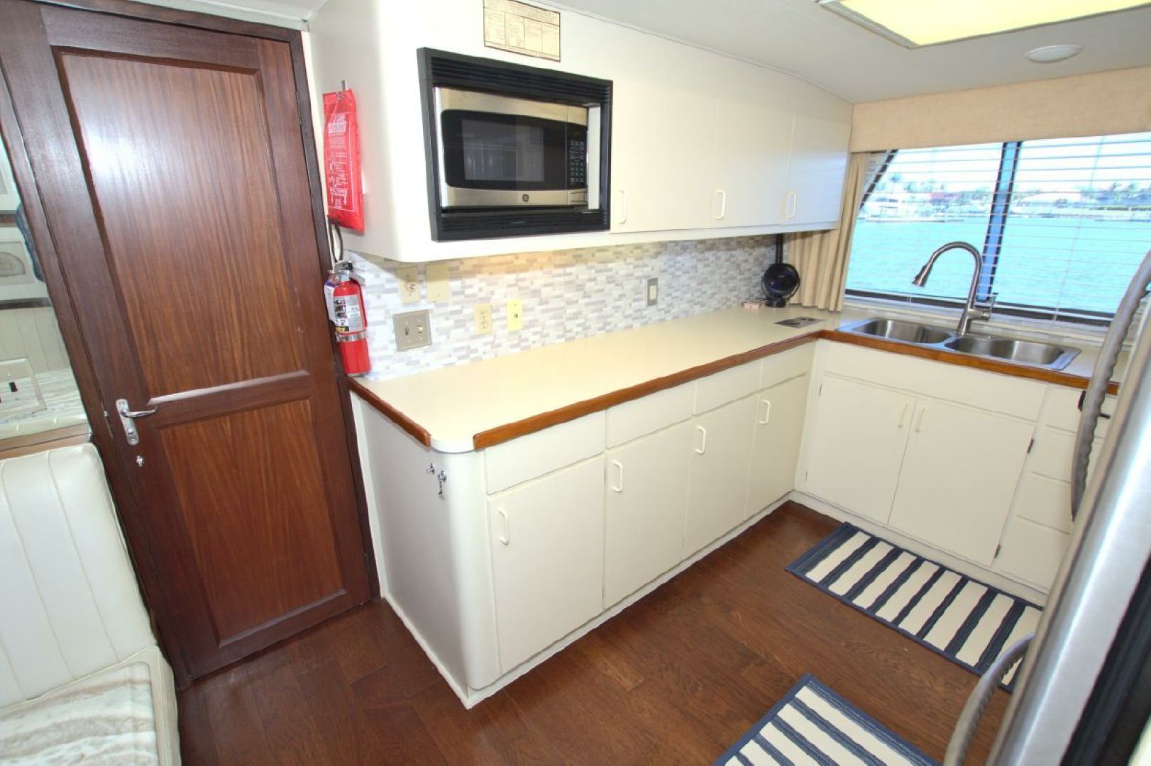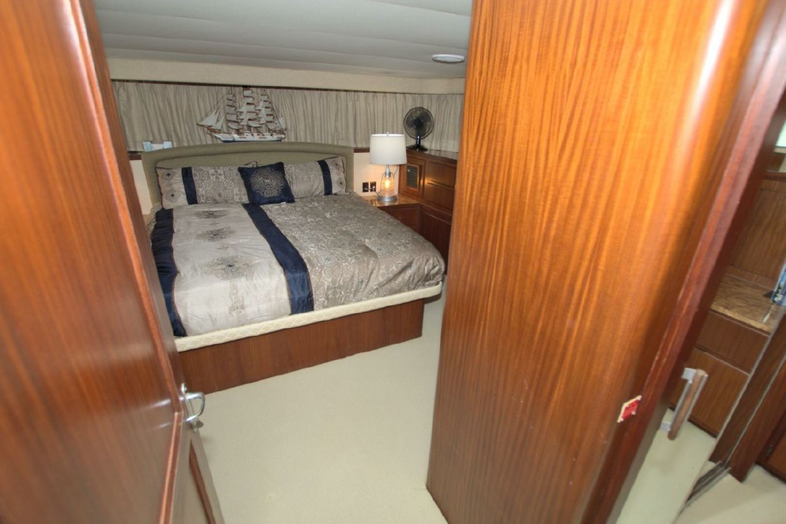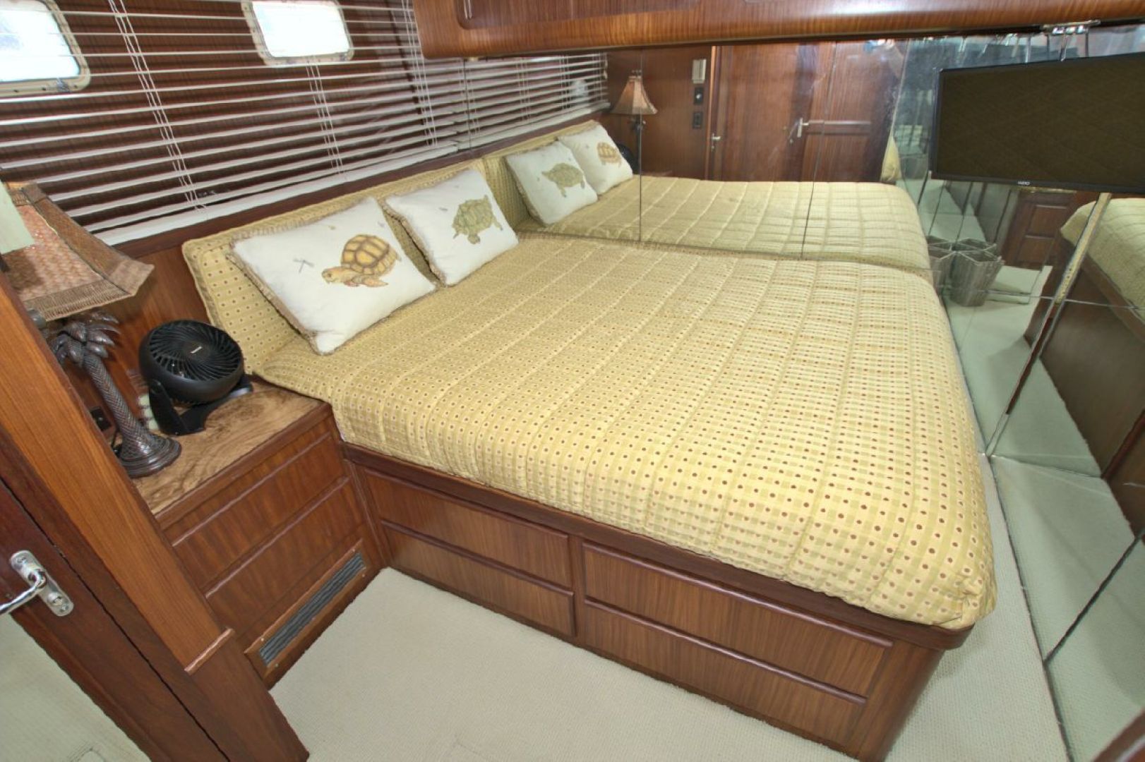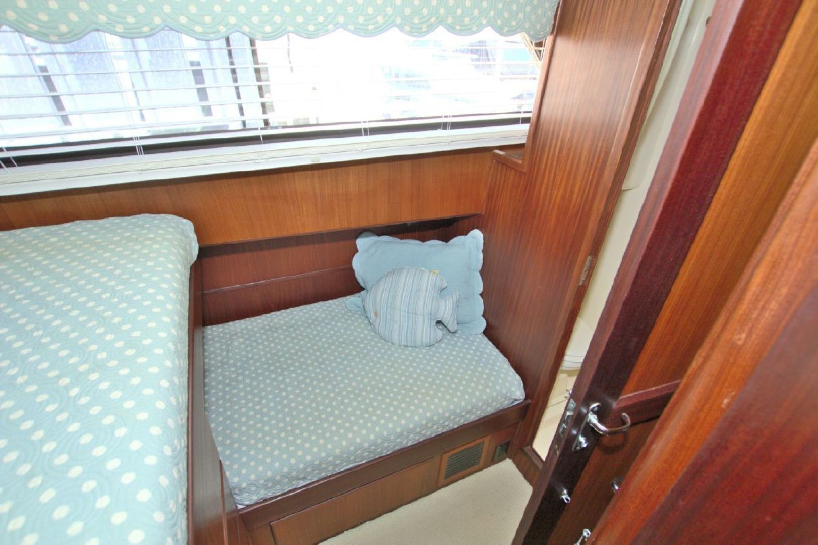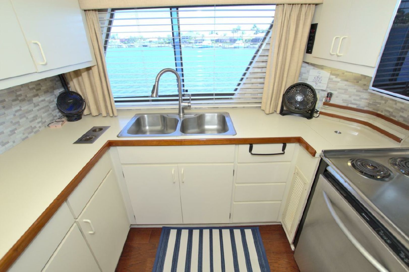 Aft of the VIP cabin are the twin engine rooms housing the spotless Detroit Diesel 12V-71 engines that produce 650HP each. Located outboard at the front of each engine room you will find a thick, plexiglass cover over each of the stabilizer actuators and related sensors. The starboard side engine room houses the hot water tank, ships tool box and common tools mounted on a magnetic bulk head. These rooms are illuminated by both AC and DC lighting systems. You will not find a more organized, cleaner engine room on any Hatteras of this vintage!!