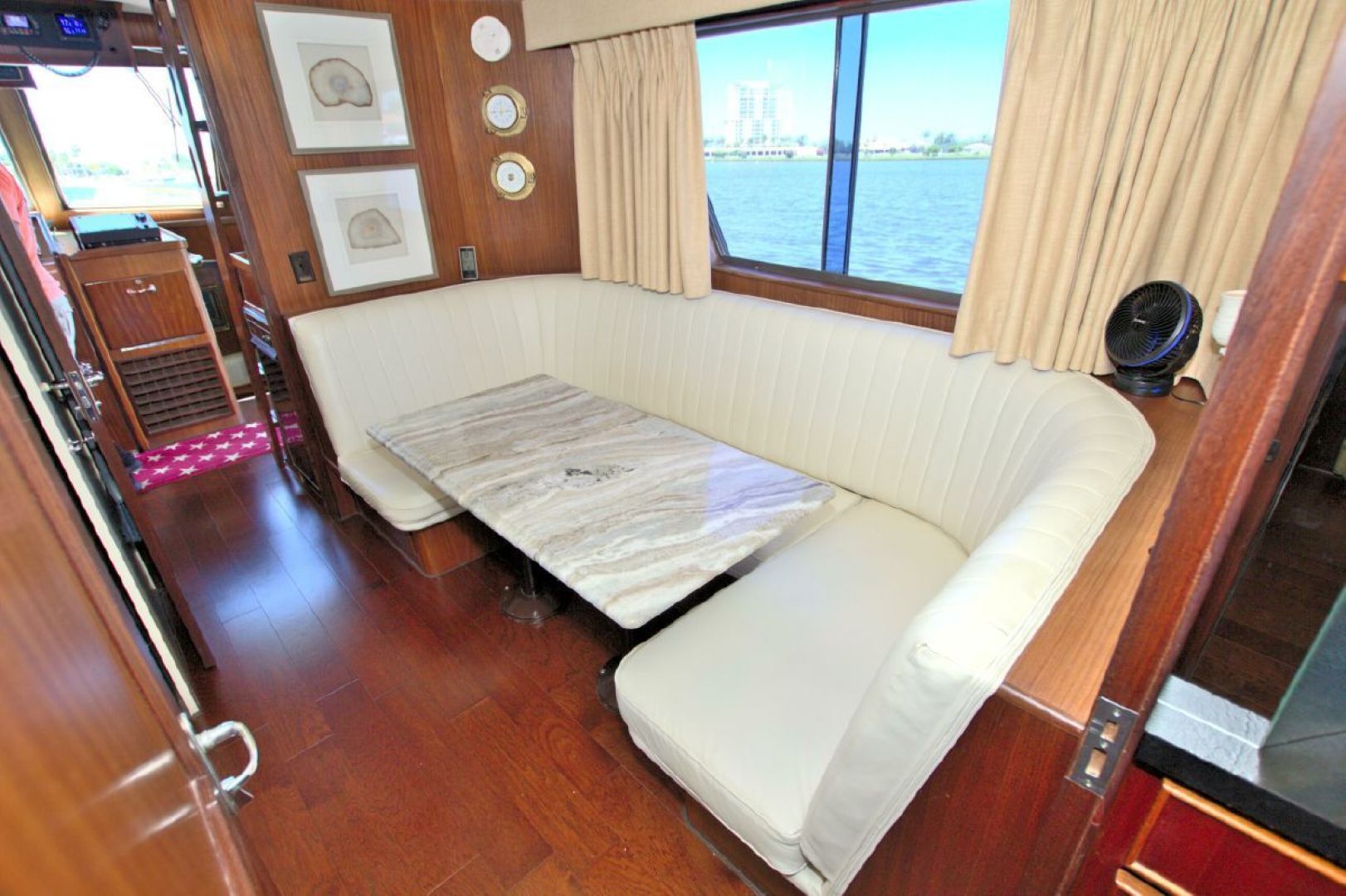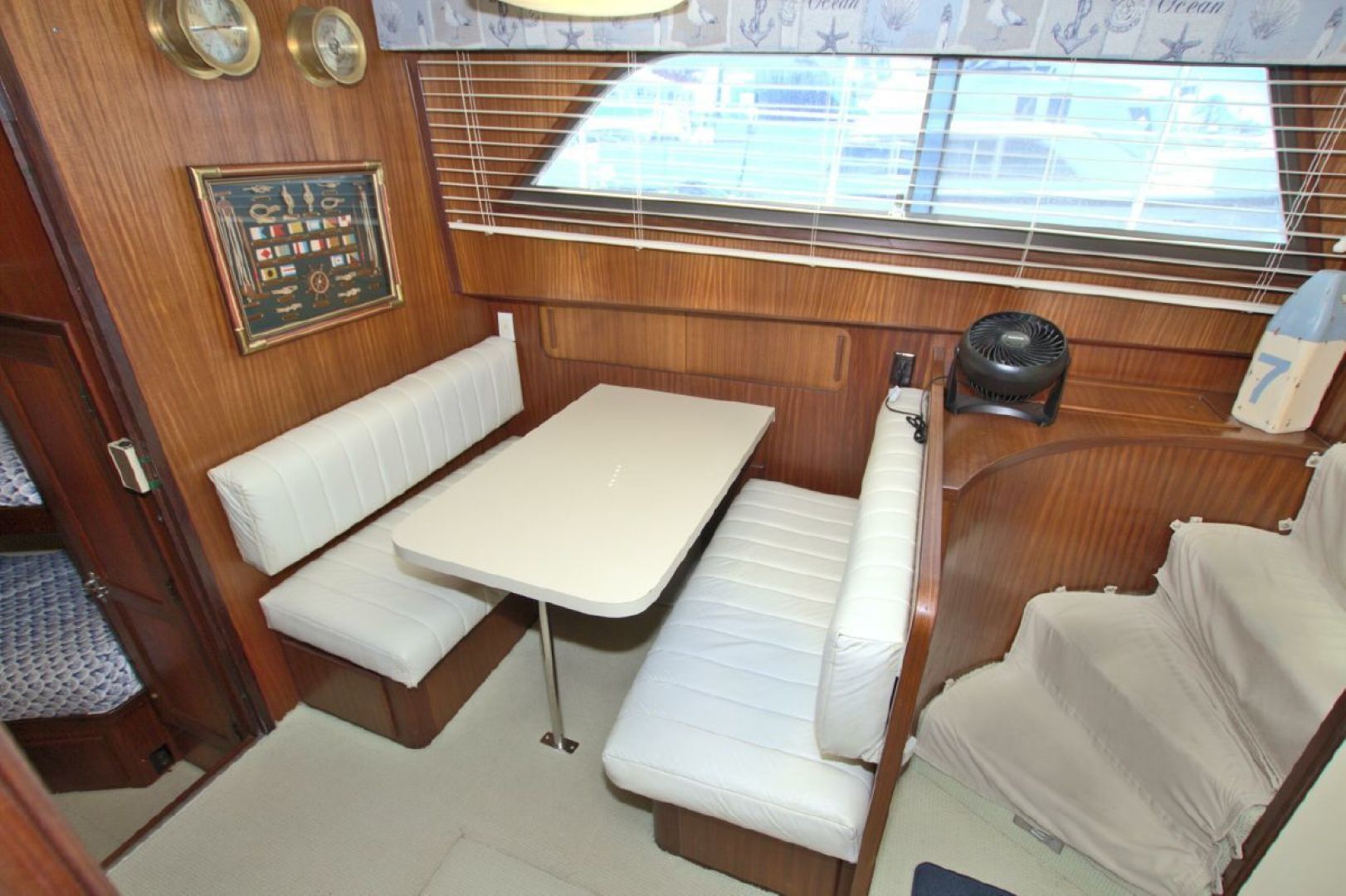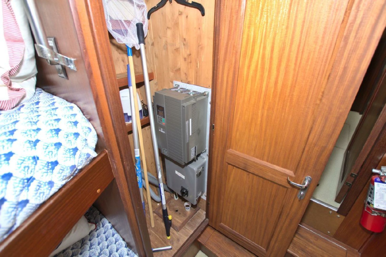 Moving forward from the lower helm area will take you down one level to an area with a dinette seating area that can be used as an activity center for games or other needs. The equipment/generators are located directly under this floor with access to the 7 Dometic AC units, two generators (20KW Onan with 2629 hours and the 21KW Phasor with 660 hours on it) as well as the Water Maker's 600 GPD water maker with 142 hours on it. There is also a spare set of fully tuned and polished spare props there as well as generator spare parts. Finally the first of two forward cabins is also accessed off of this level.