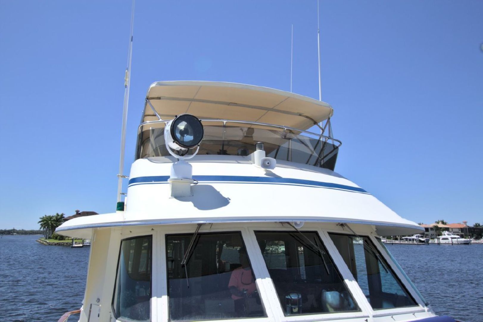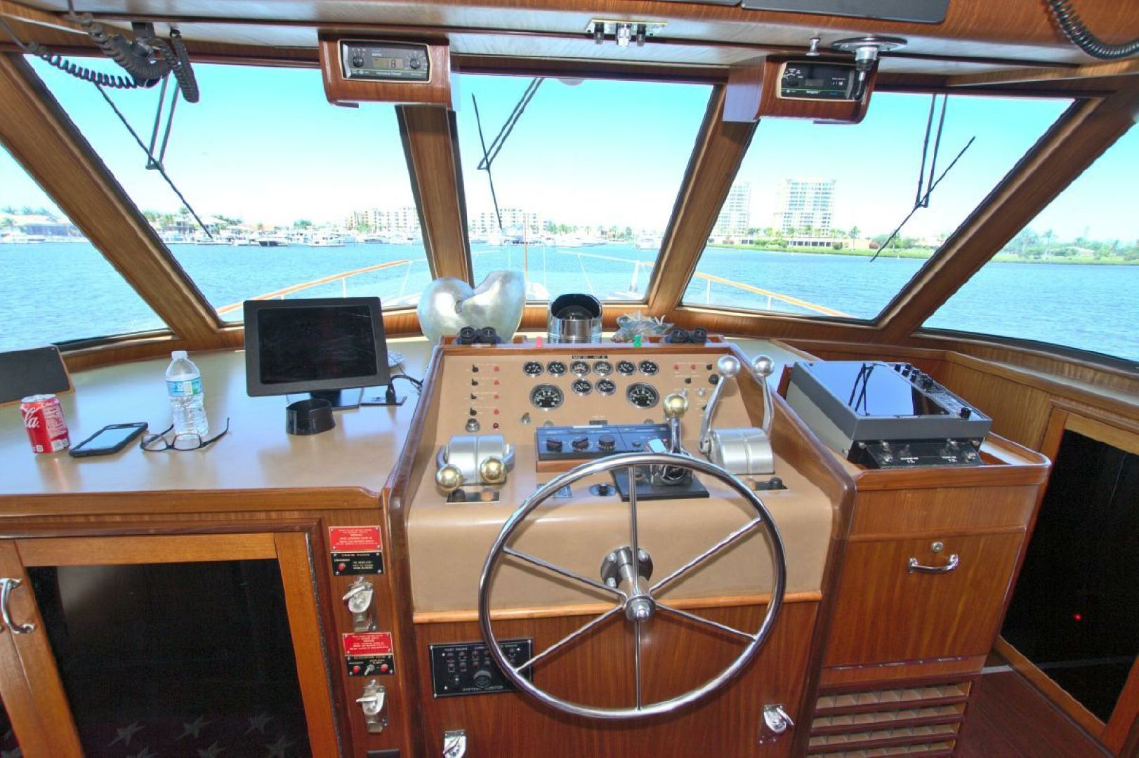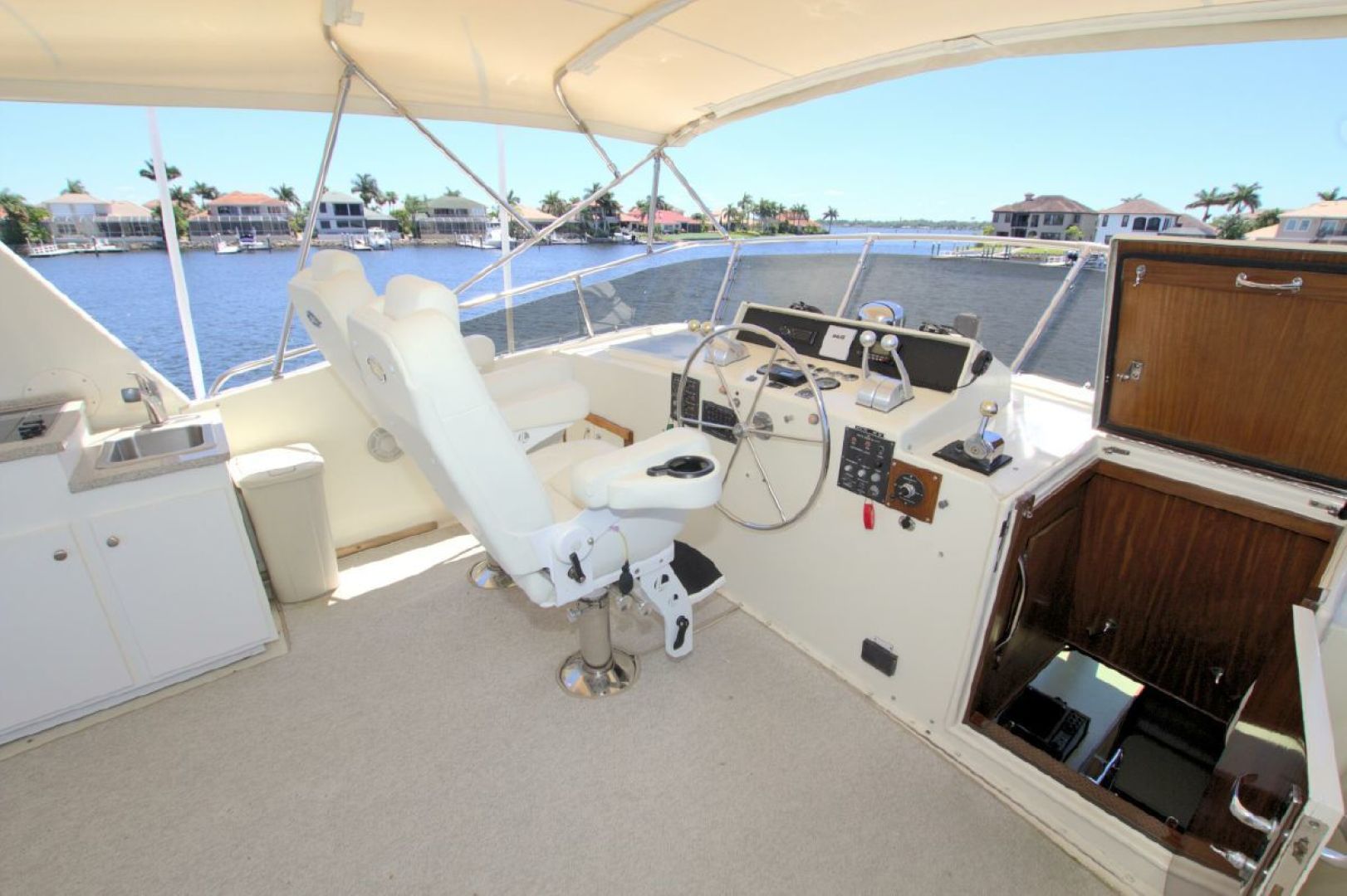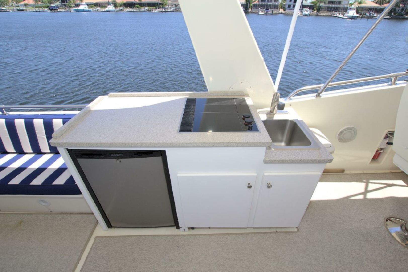 Moving up the stairs/ladder from the lower helm area takes you to the fly bridge. As you emerge onto this dock you will again be shocked by the amount of space here. There is a very large seating area aft, a space that could service as a dance floor next to the custom port side counter area that sports a built in down-draft electric grill, sink, refrigerator and storage area. At the front of the fly bridge are two high end Lebroc helm seats. Each with multiple controls and levers to allow you to customize the seating surface to fit your body perfectly. Navigation from the fly bridge is made possible with two removable 13" iPad Pro tablets that are wirelessly linked to the vessels nav system. There is also an auto pilot control, a proportional hydraulic thruster jog stick, new Standard Horizon 1850 VHF radio and B&G Triton 2 digital display unit. This entire area is covered with a new 2 piece Bimini top.