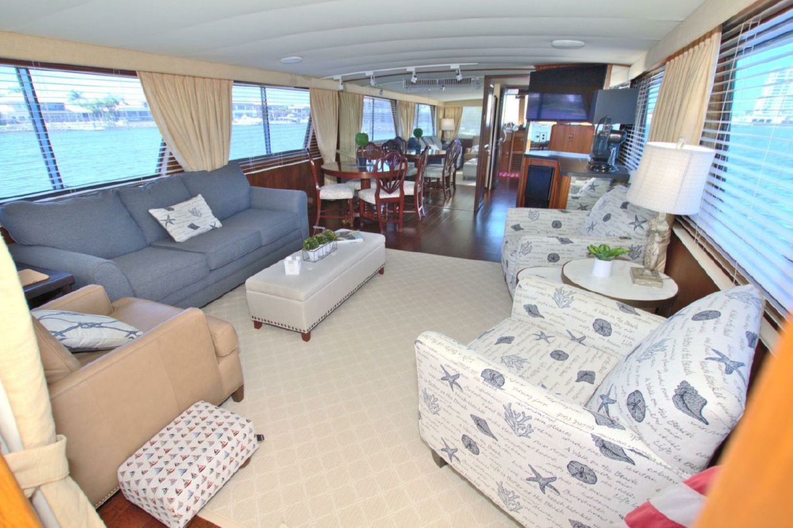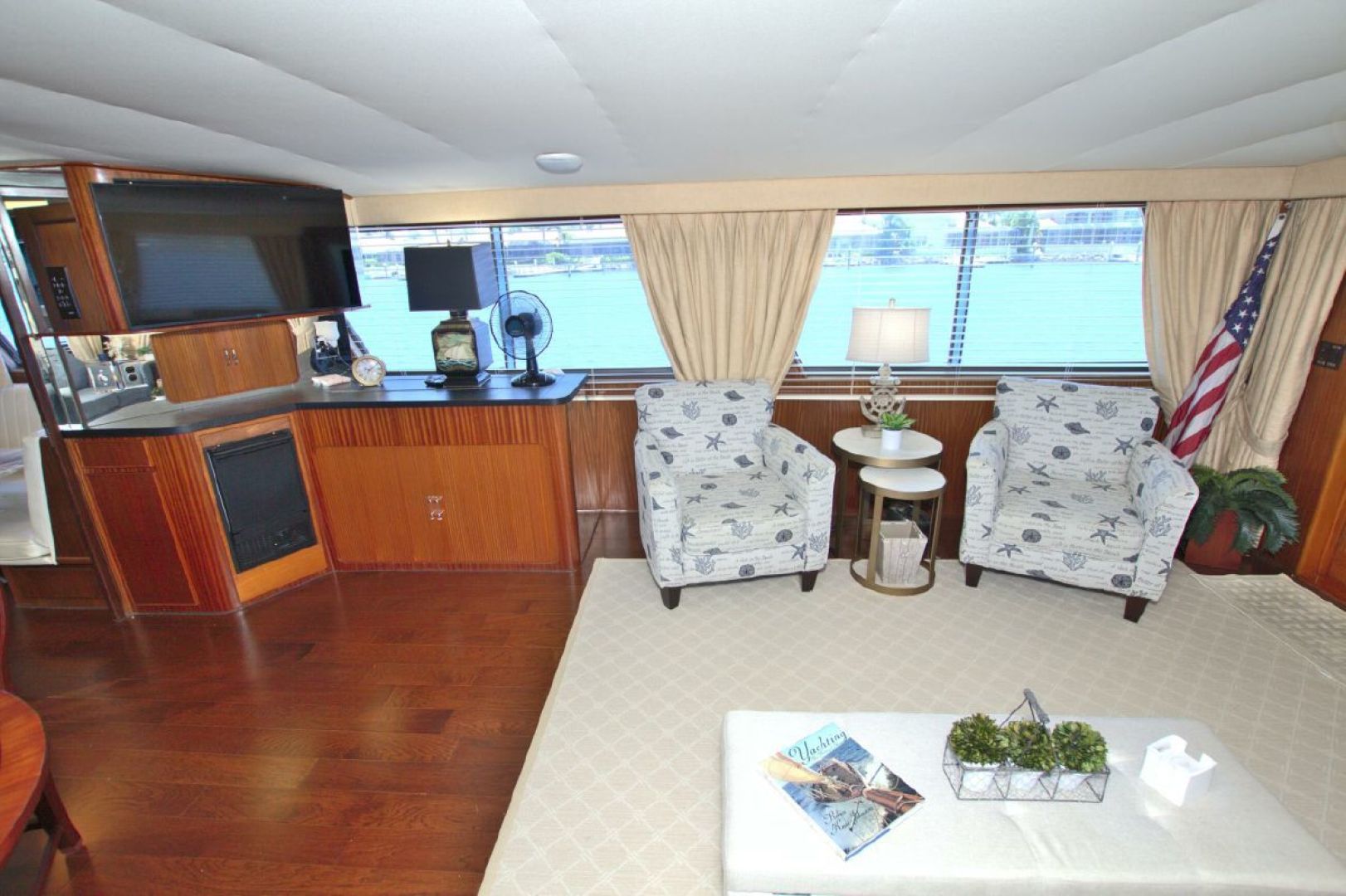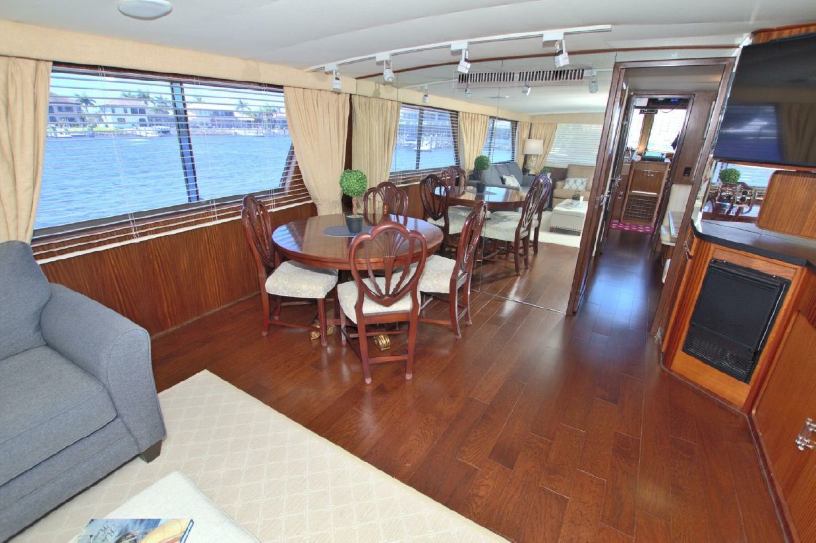 On the main level, travelling aft from the lower helm area, through a sliding door, will take you into the spacious, bright galley area. This provides ample space for your chef to create meals to be remembered! There is a large, modern double door stainless refrigerator freezer, microwave oven, 4 burner electric cook top, dish washer, and a custom, granite table/seating area. Aft of the galley, through another door you will enter the dining salon area. As this is a wide body yacht you will first be in awe of the available space and how it is used! There is a dining table that seats 6, a wet bar with bottle and glass storage, and entertainment center with TV and a very large seating area aft of the dining area.