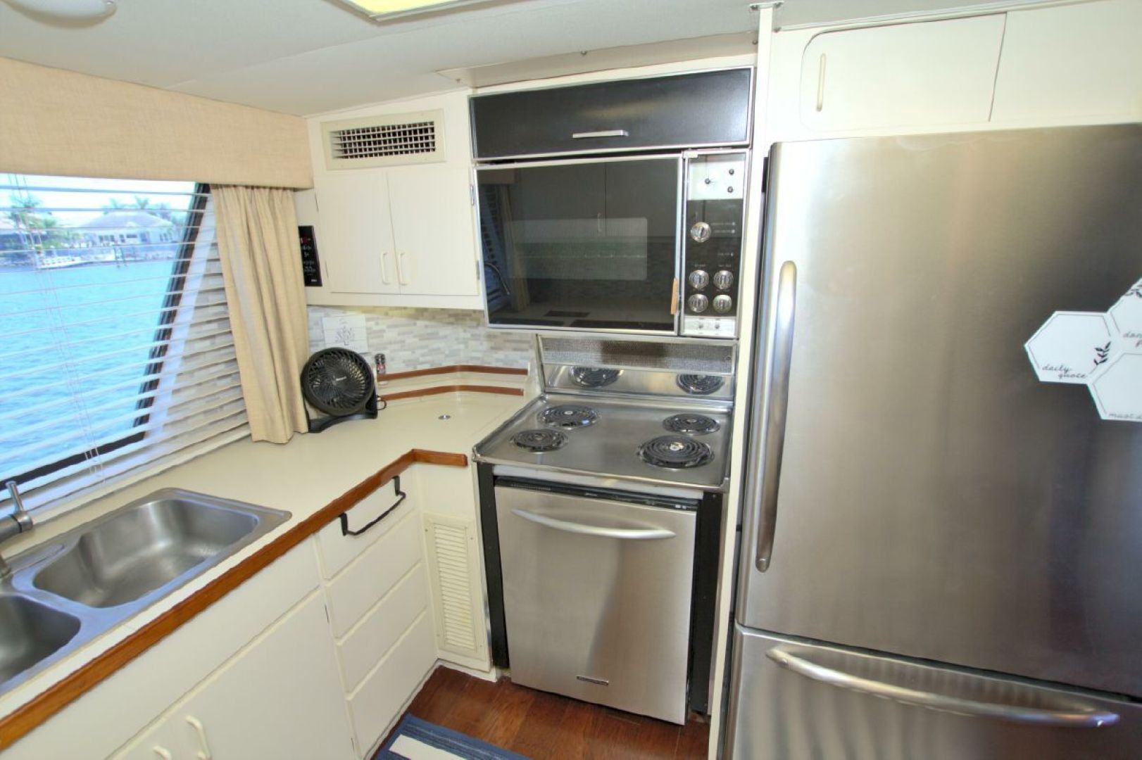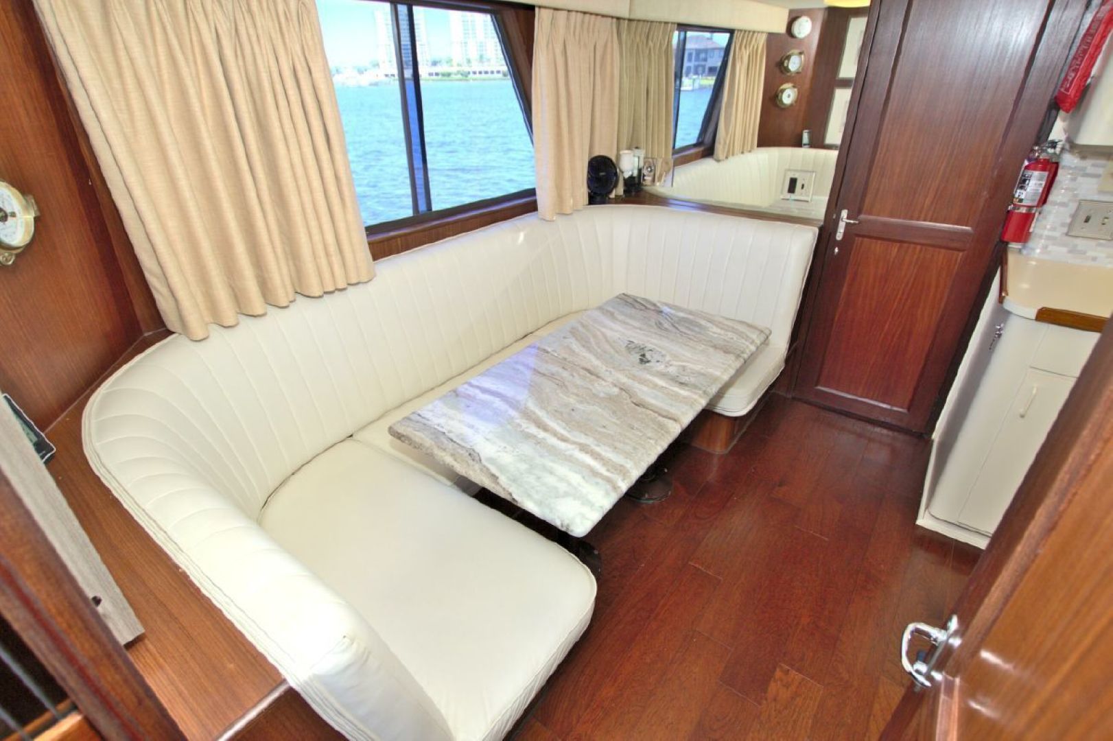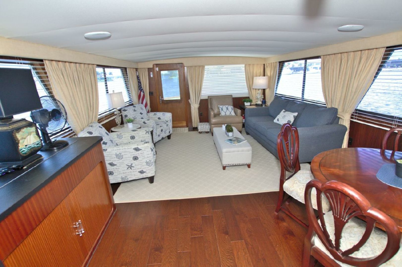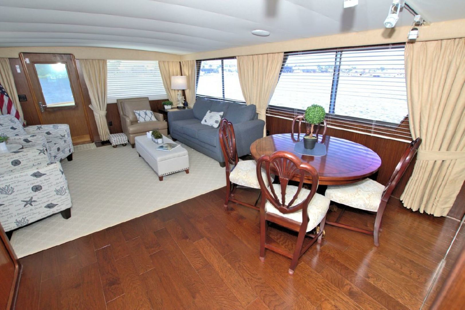 On the main level, travelling aft from the lower helm area, through a sliding door, will take you into the spacious, bright galley area. This provides ample space for your chef to create meals to be remembered! There is a large, modern double door stainless refrigerator freezer, microwave oven, 4 burner electric cook top, dish washer, and a custom, granite table/seating area. Aft of the galley, through another door you will enter the dining salon area. As this is a wide body yacht you will first be in awe of the available space and how it is used! There is a dining table that seats 6, a wet bar with bottle and glass storage, and entertainment center with TV and a very large seating area aft of the dining area.
