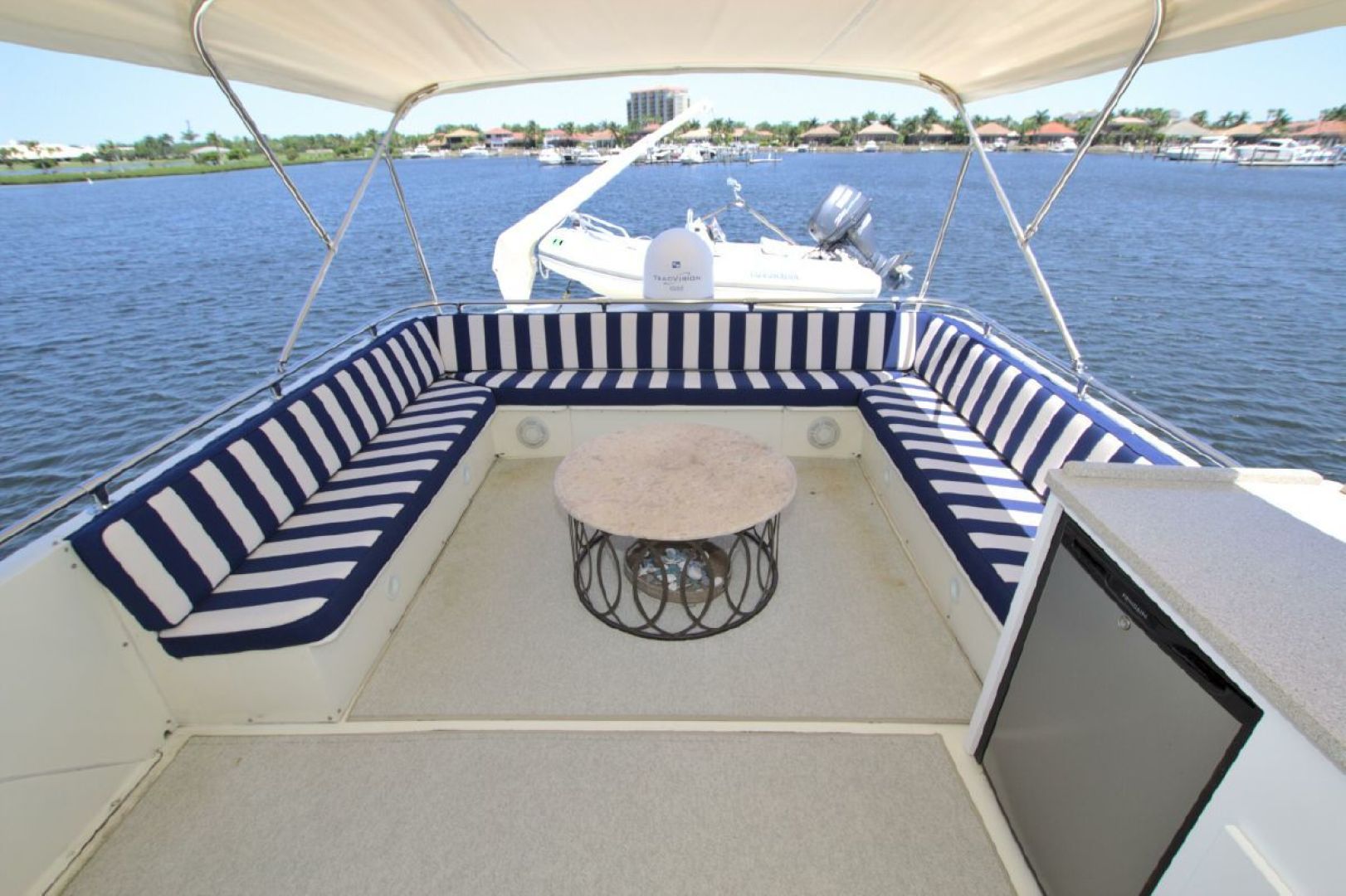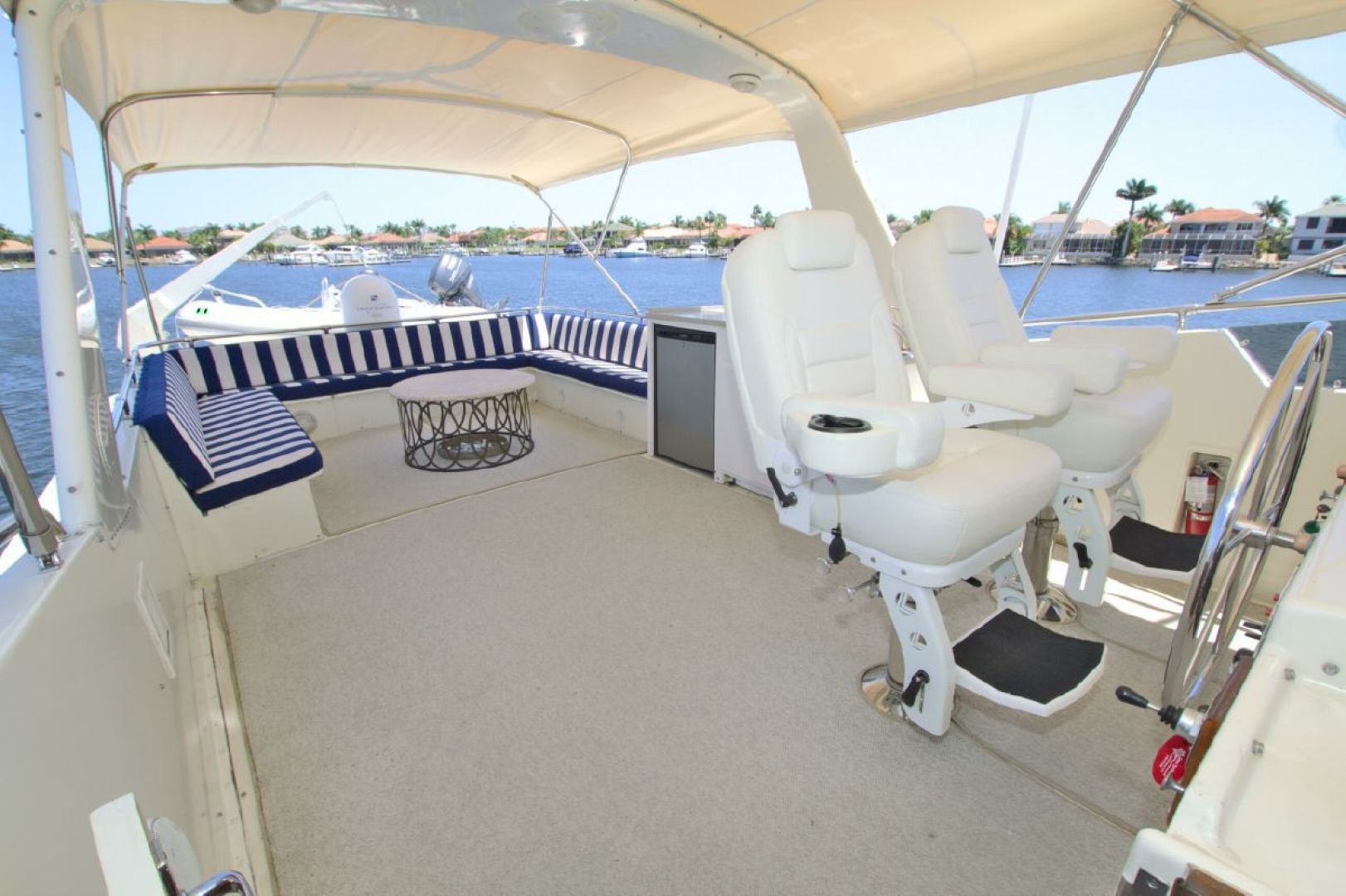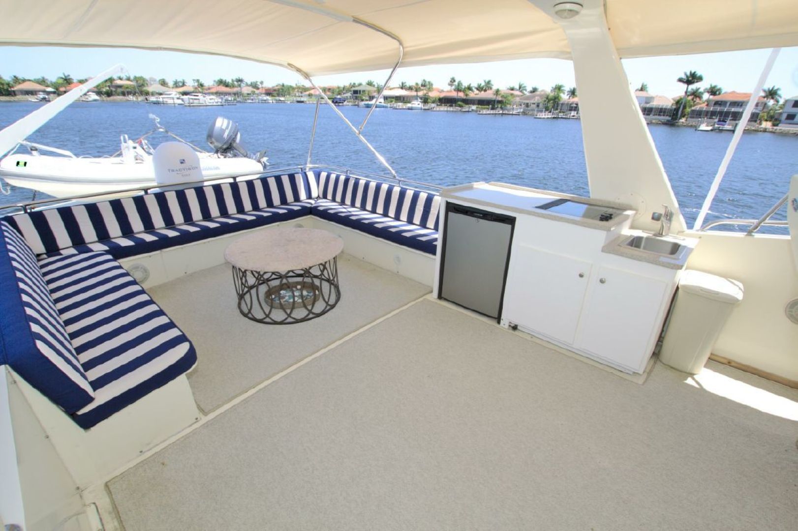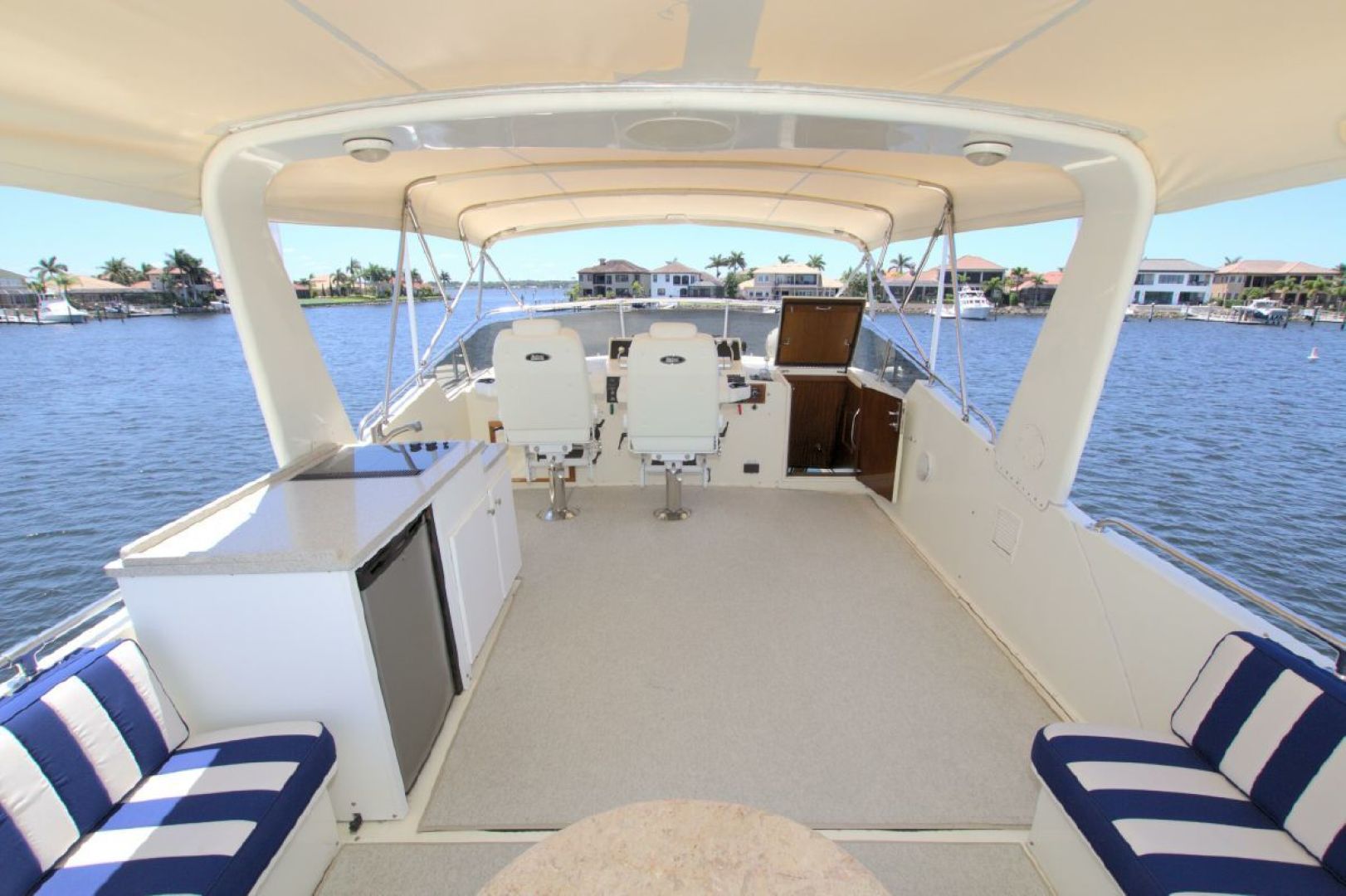 Finally aft of the salon, you will pass through another door taking you to the aft deck of the yacht which is protected from the elements by the fully extended fly bridge. There is ample room here for several nice chairs that you can then enjoy for morning coffee or sun downers as your day transitions into evening. This is also where you will handle your stern lines and gives direct access to the swim platform.