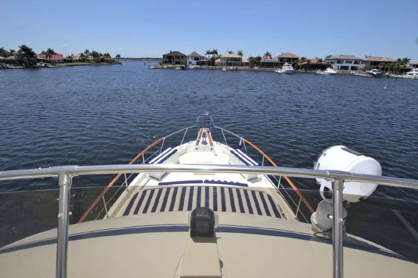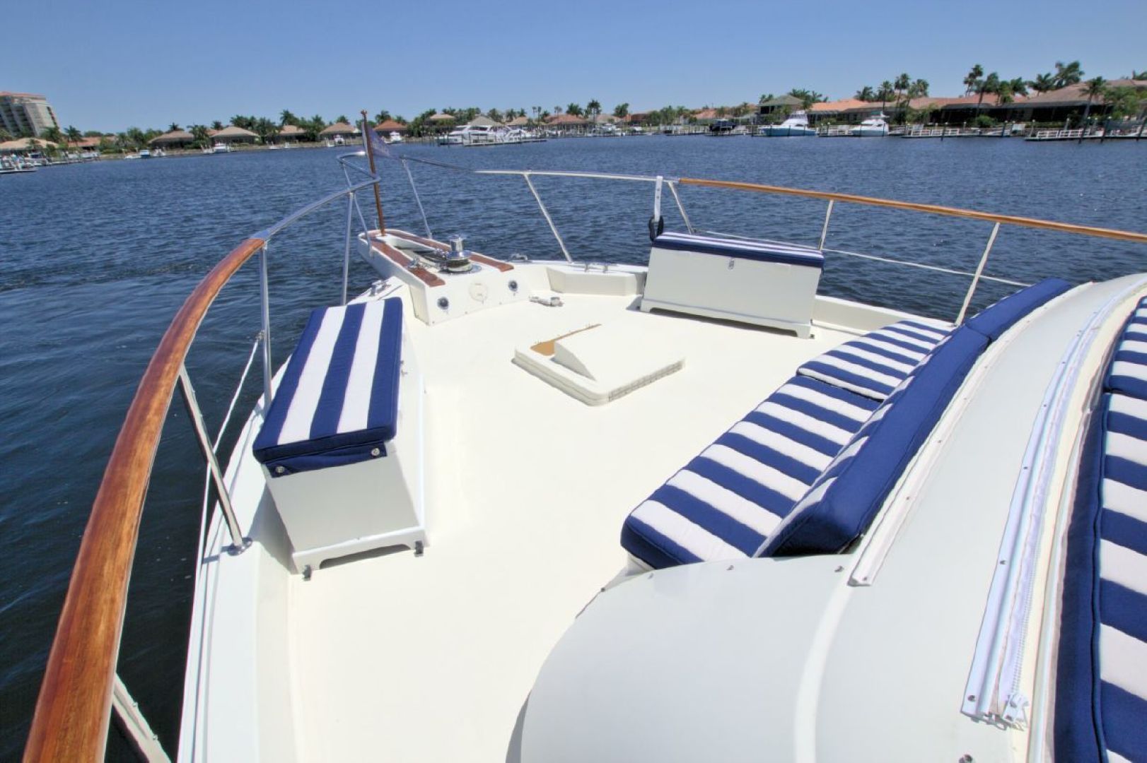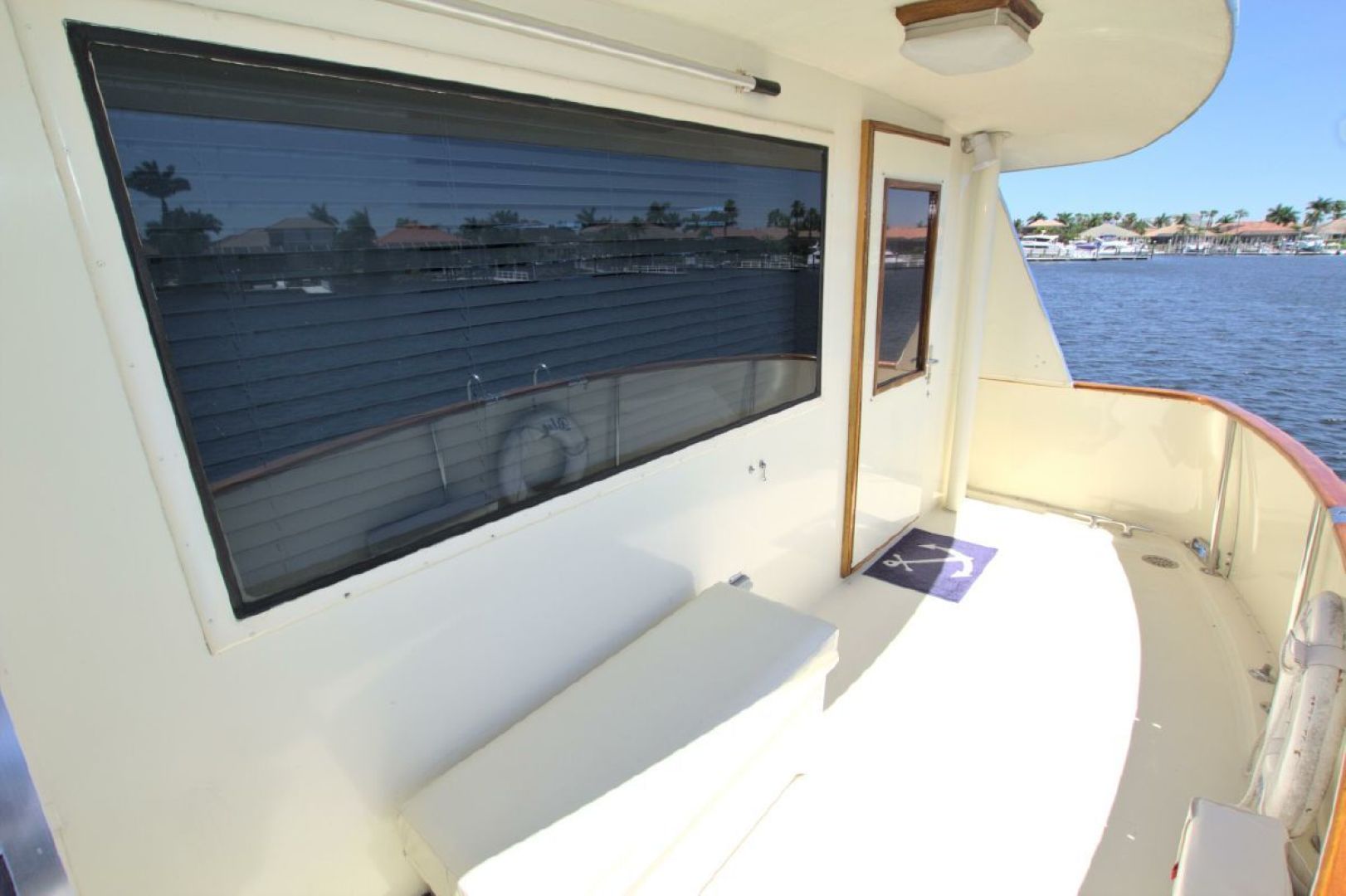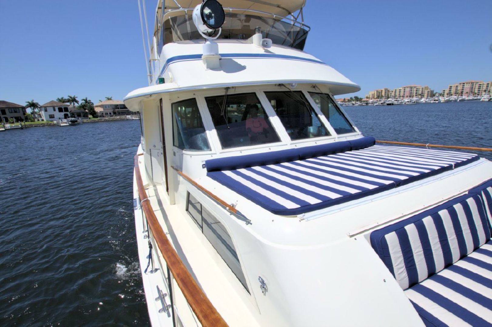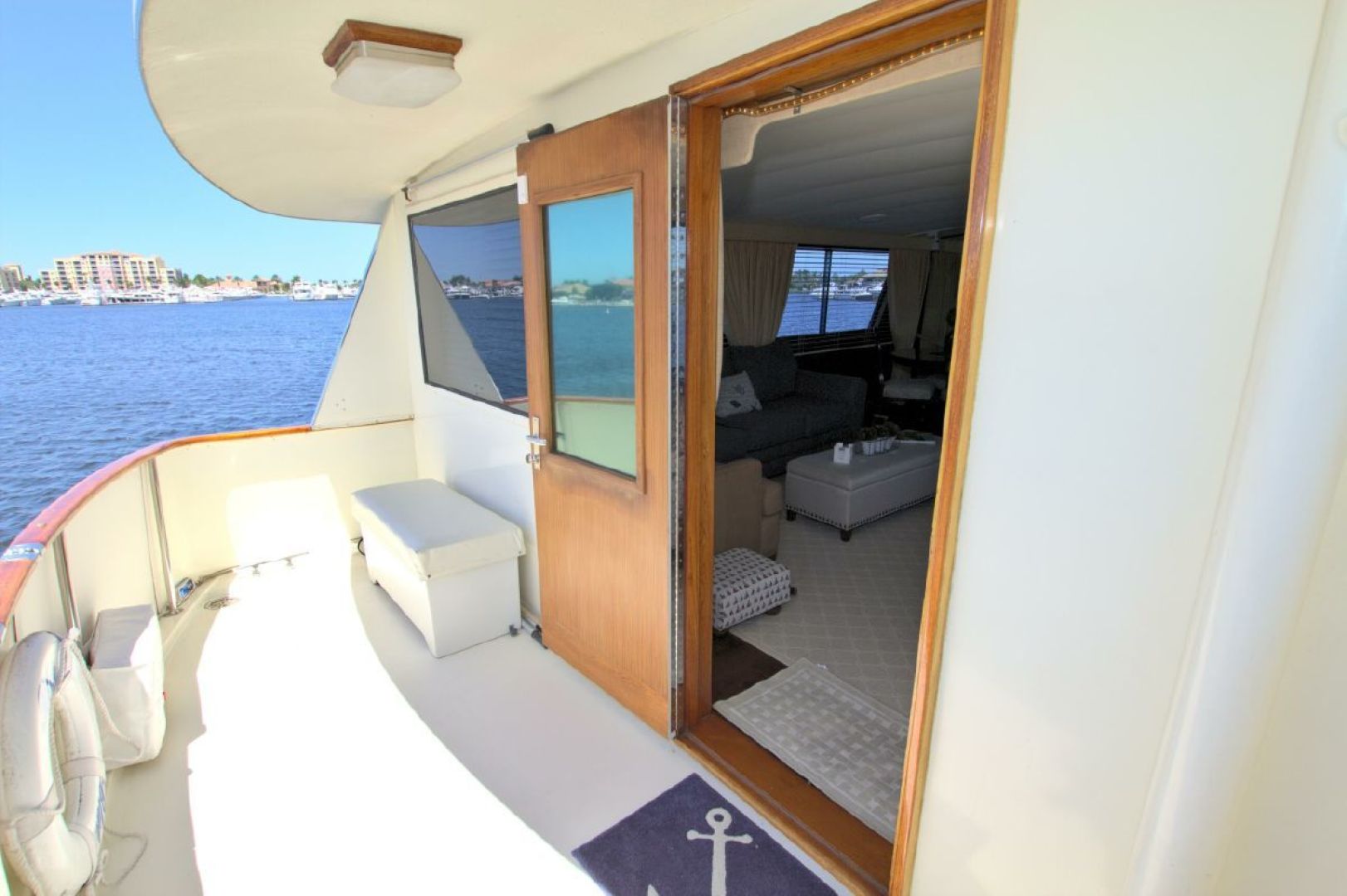Finally aft of the salon, you will pass through another door taking you to the aft deck of the yacht which is protected from the elements by the fully extended fly bridge. There is ample room here for several nice chairs that you can then enjoy for morning coffee or sun downers as your day transitions into evening. This is also where you will handle your stern lines and gives direct access to the swim platform.