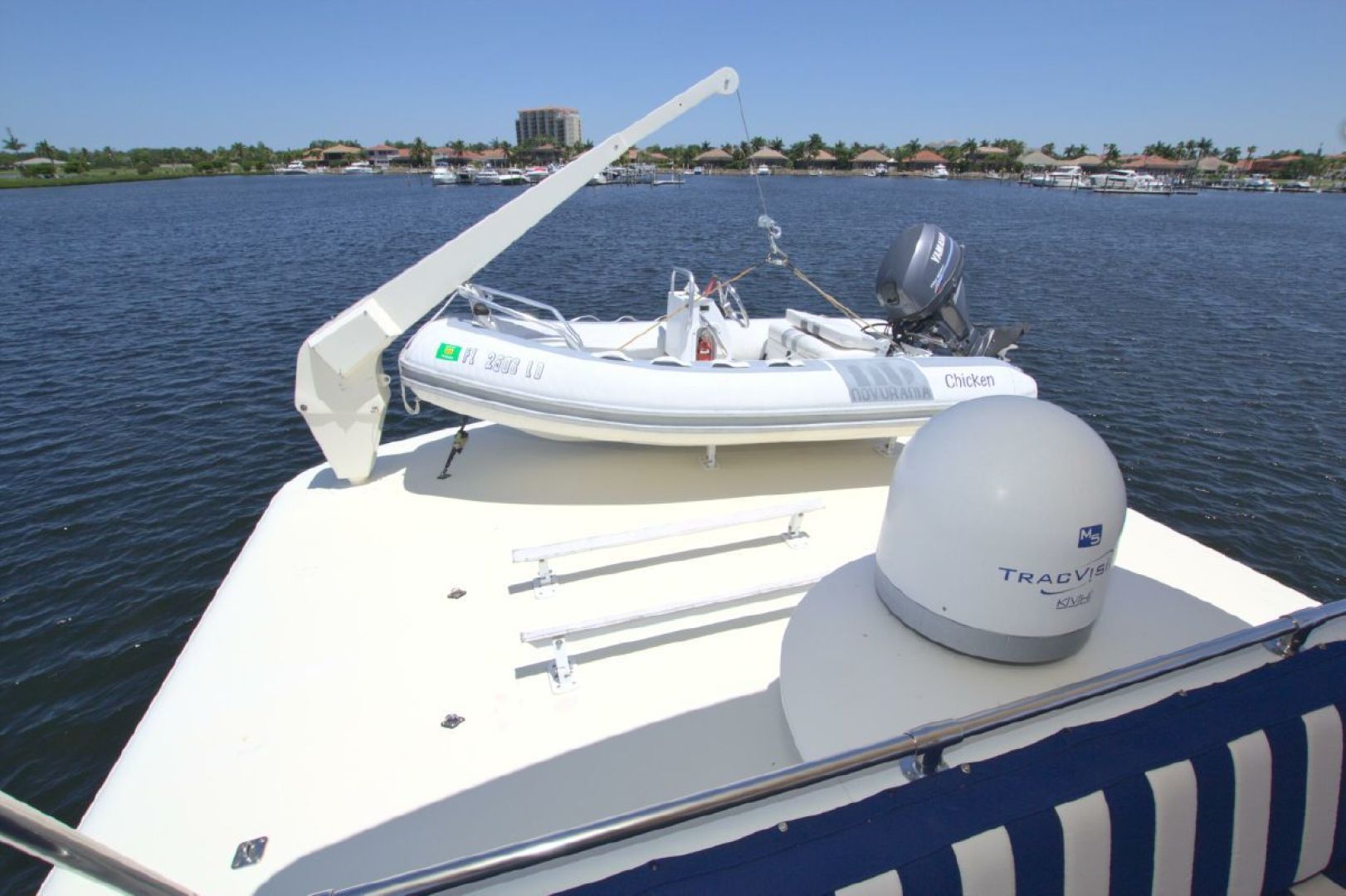 At the aft portion of the fly bridge you will find the KVH M5 satellite TV antenna and aft of that storage for the water toys. There is a cradle for a personal water craft as well as a 12' Novurania 4 person hard bottom inflatable with steering console powered by a 25HP 4 stroke Yamaha outboard. The davit to service these toys was upgraded in August 2021 with a new 2000LB motor and cable.