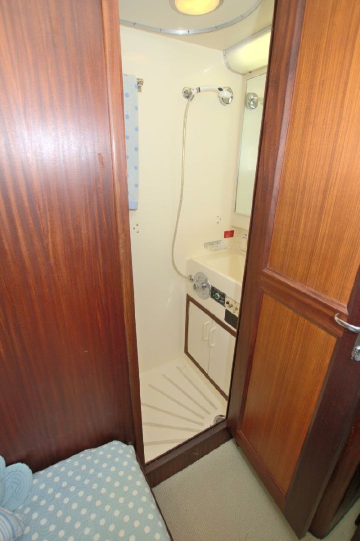 Blue has a total of 4 cabins, all with private heads. The master, located aft of the twin engine rooms, gives the owner a sense of privacy and also boasts a king size bed with a private attached room that could be used as a dressing area, office or a combination of both, with loads of storage and closet space. The private head serving the master also has a bathtub. The other three cabins located forward of the engine rooms sleep and additional 6 people in comfort. The mid ship VIP has a queen size bed, the two remaining cabins both have twin bunks. Again, all cabins have private head/showers.