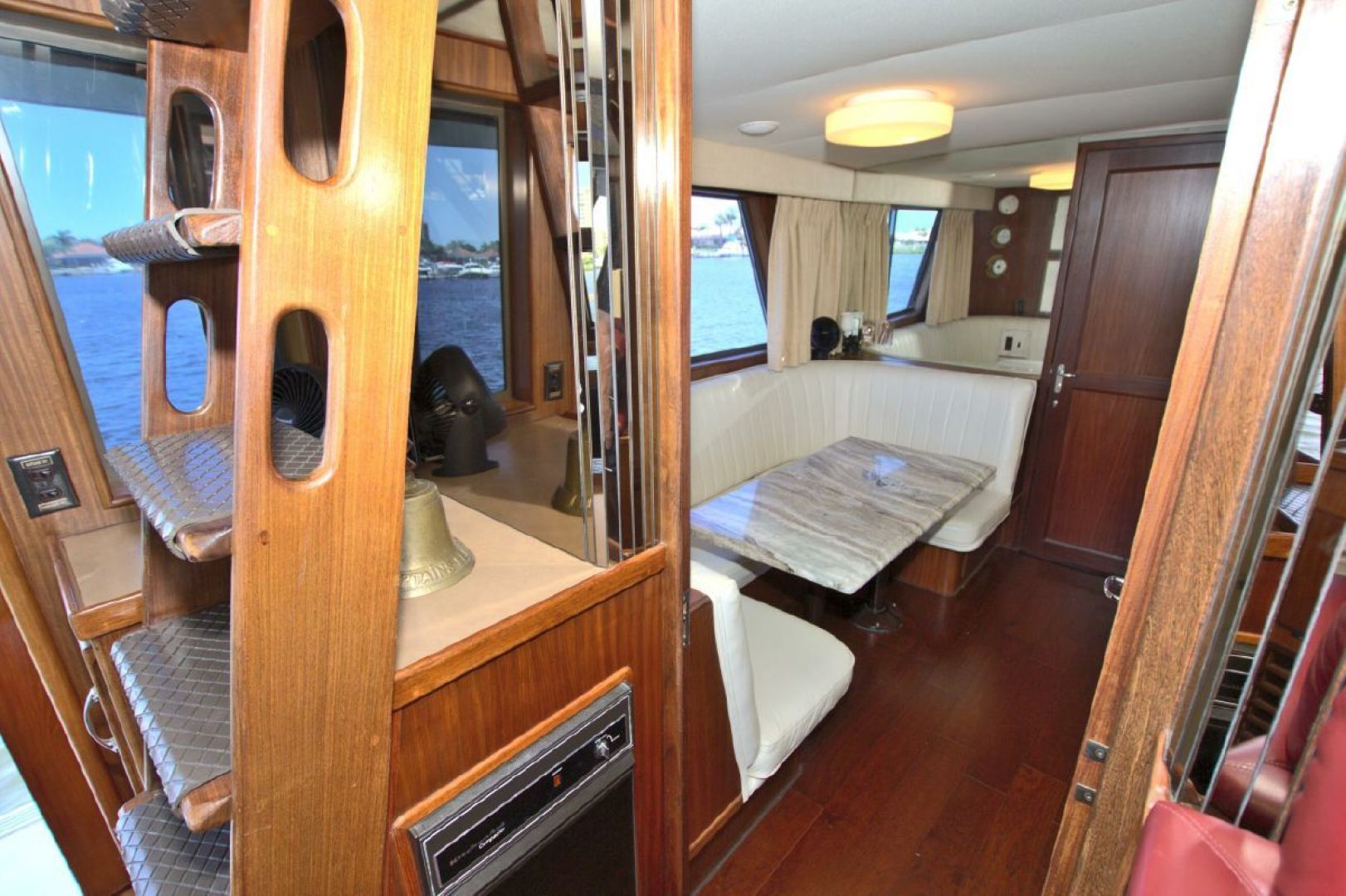 When boarding the boat from either the port or starboard side sliding doors you will find yourself in the lower helm area. This can be closed off from the main floor living areas to allow the Captain to operate the vessel without distraction or at night without compromising night vision with light from other areas of the boat.
