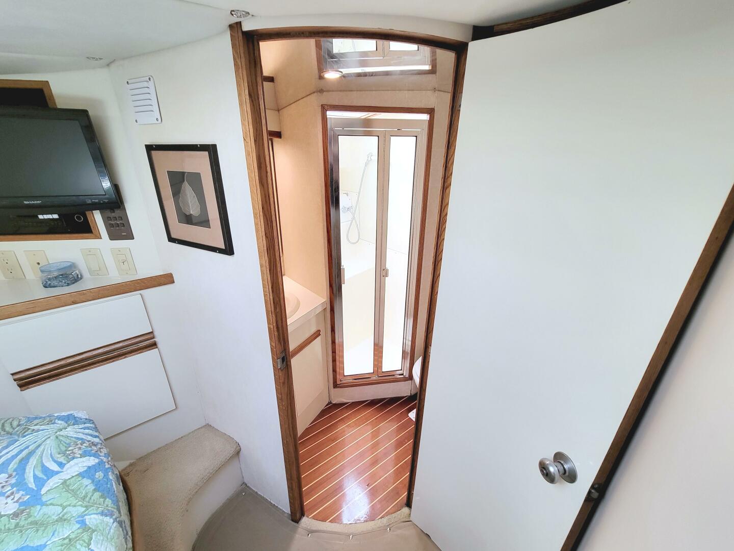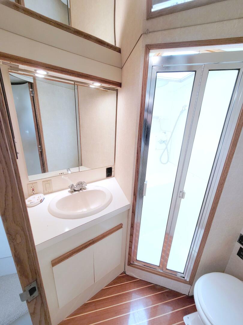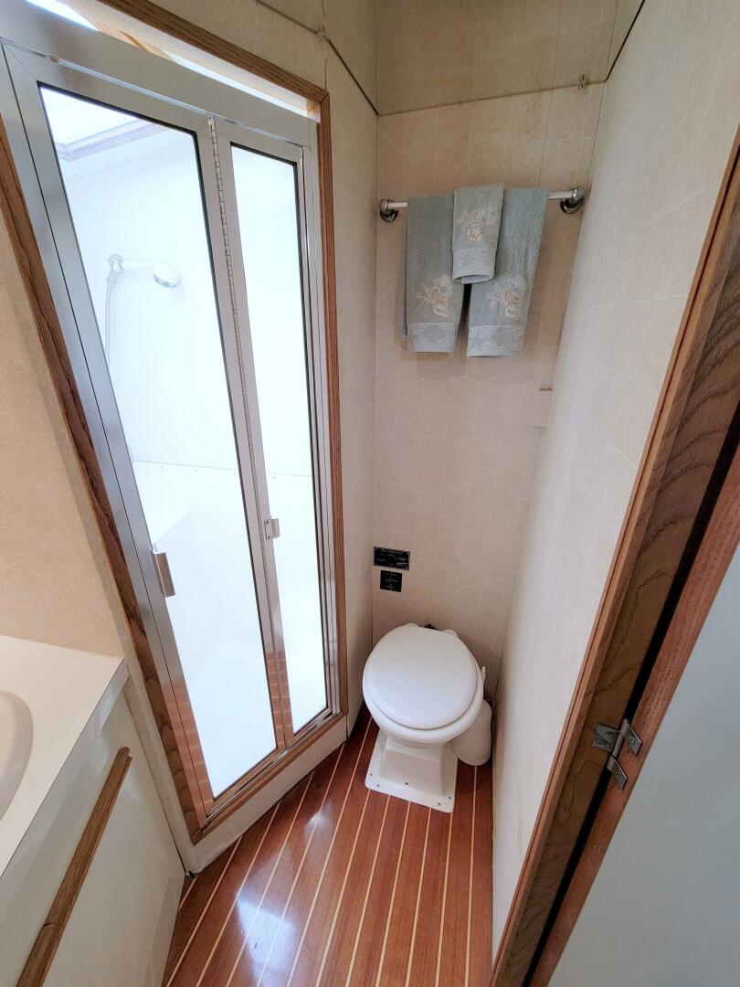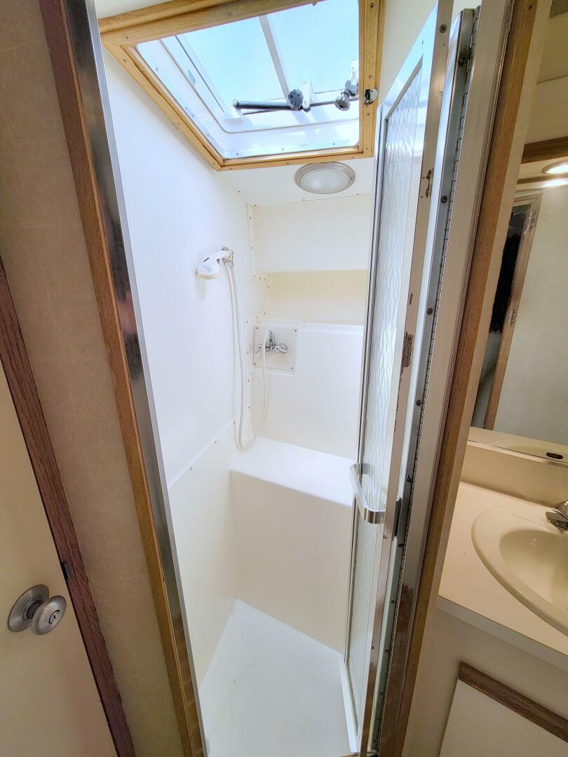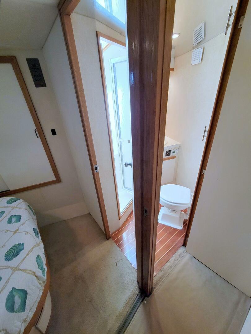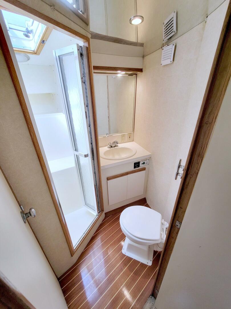 - Heads: Two full bathrooms, including a master ensuite, both with molded-in seat showers, mirrored medicine cabinets, and teak & holly flooring
