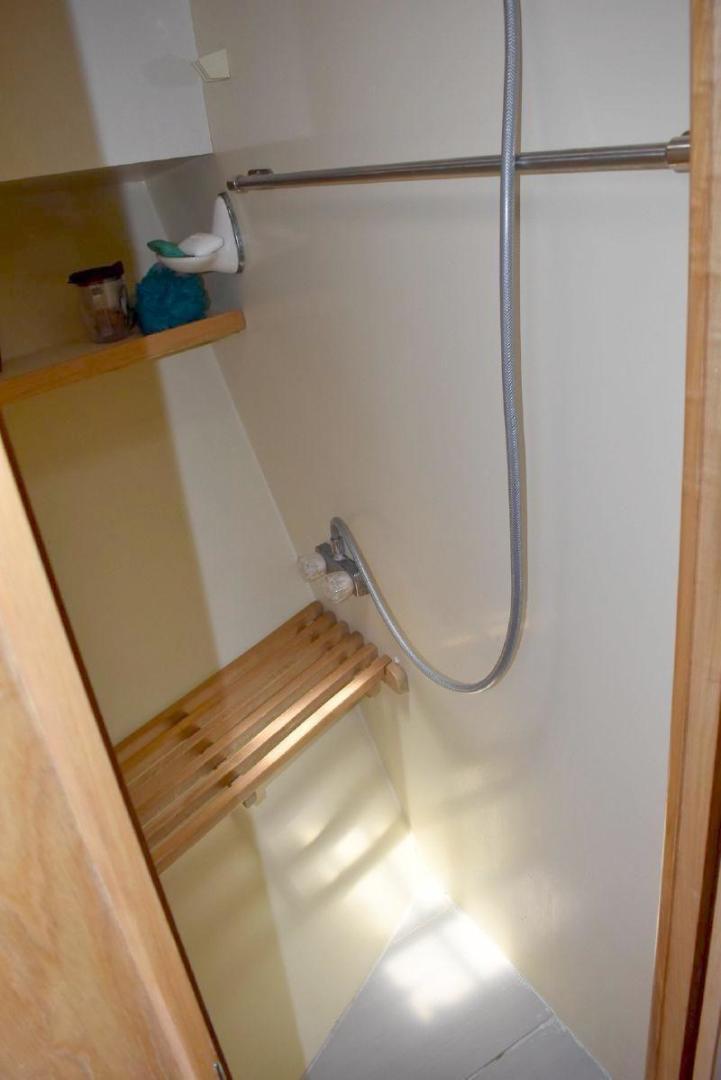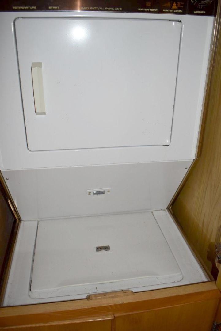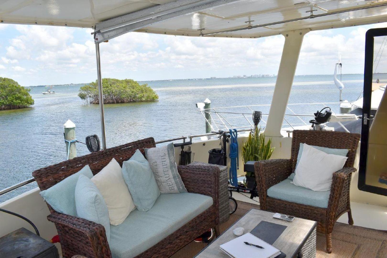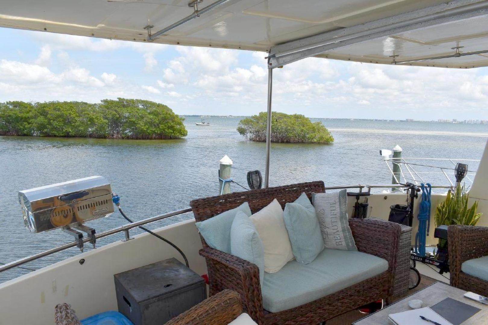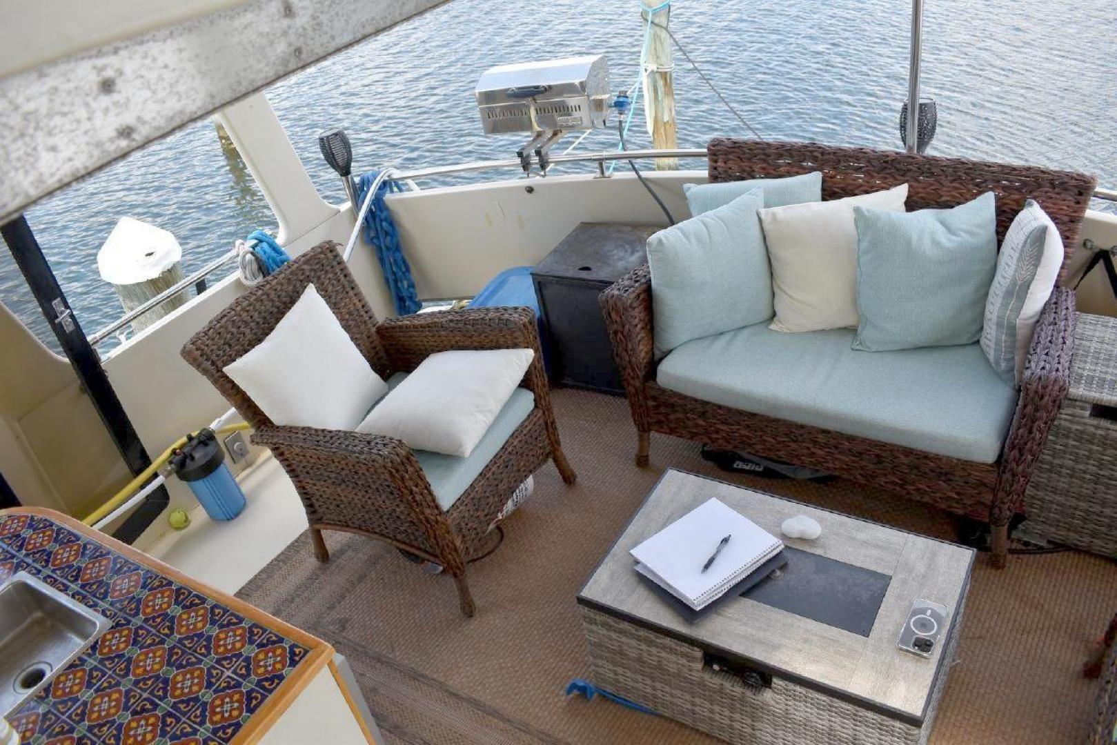 A large covered Aft deck with refrigeration, storage and access to the swim platform & dinghy. The interior is very roomy and will accommodate comfortably 6 passengers, two in the forward second stateroom with ensuite head. Two in the main salon with a pull-out sofa bed, and two in the well-appointed aft master stateroom. The galley is open with microwave, oven, cooktop, and the settee will seat six comfortably. All furniture, TV with soundbar make for a comfortable saloon. Apartment sized Washer & Dryer.