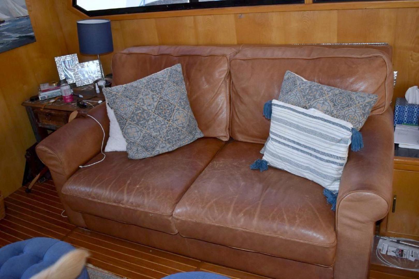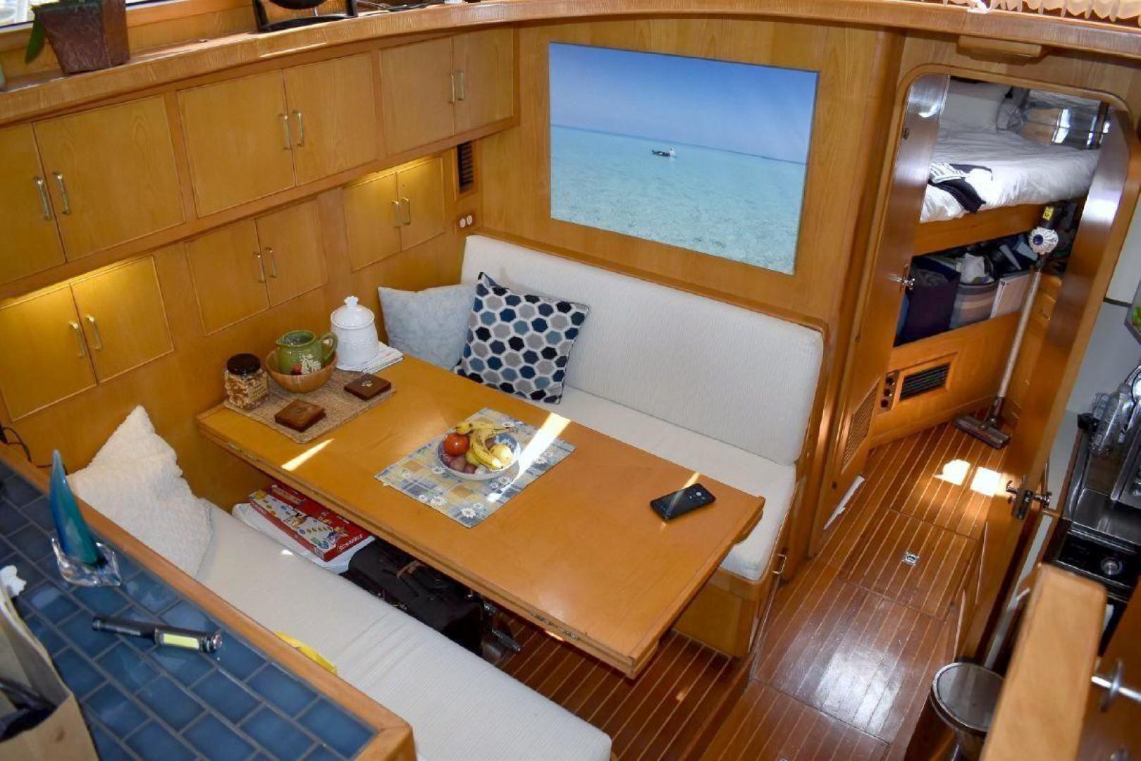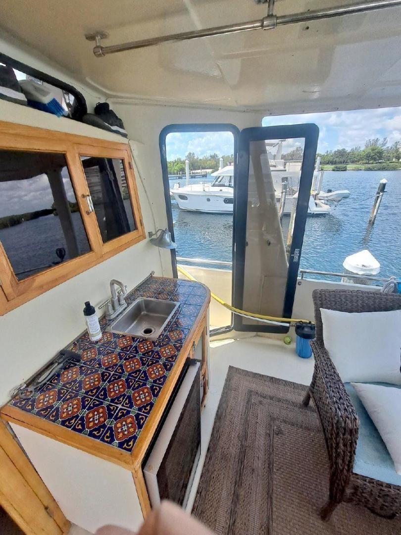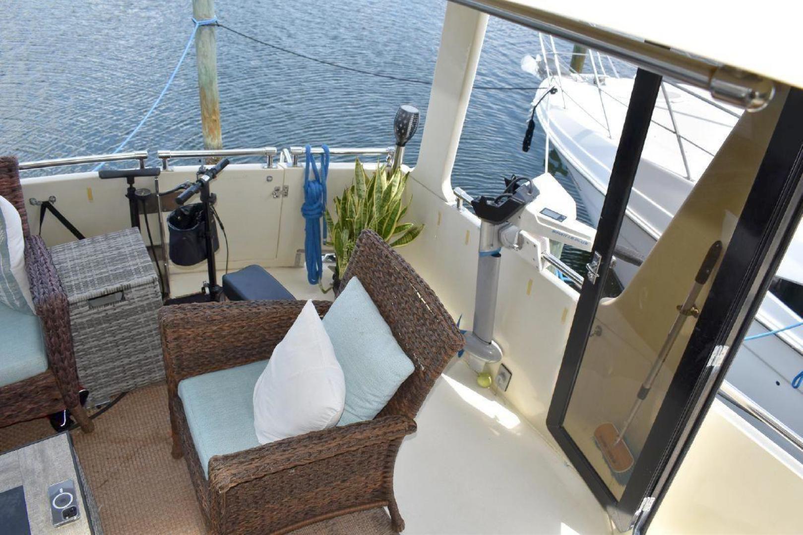 A large covered Aft deck with refrigeration, storage and access to the swim platform & dinghy. The interior is very roomy and will accommodate comfortably 6 passengers, two in the forward second stateroom with ensuite head. Two in the main salon with a pull-out sofa bed, and two in the well-appointed aft master stateroom. The galley is open with microwave, oven, cooktop, and the settee will seat six comfortably. All furniture, TV with soundbar make for a comfortable saloon. Apartment sized Washer & Dryer.