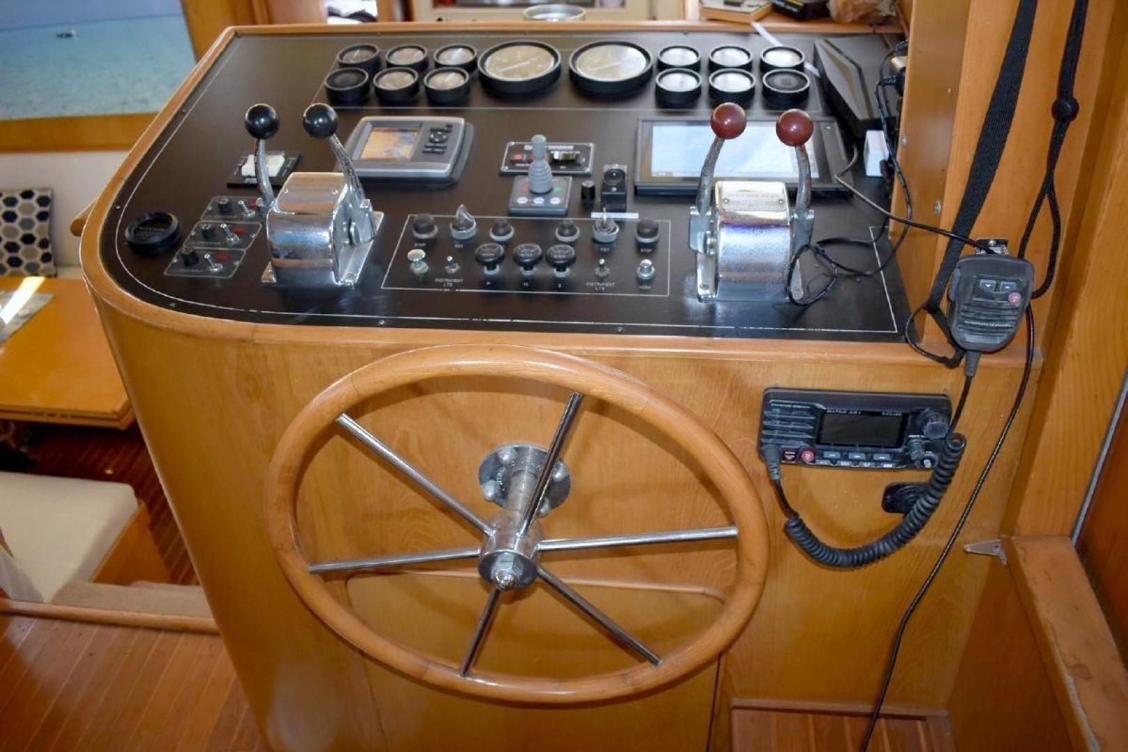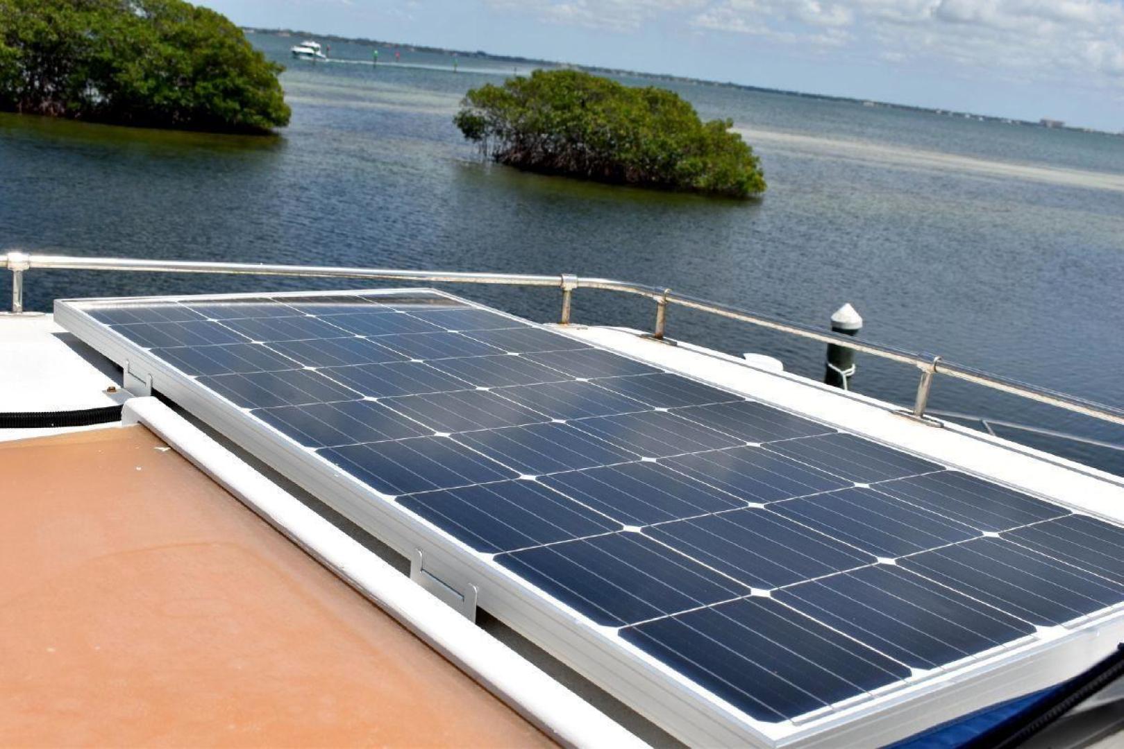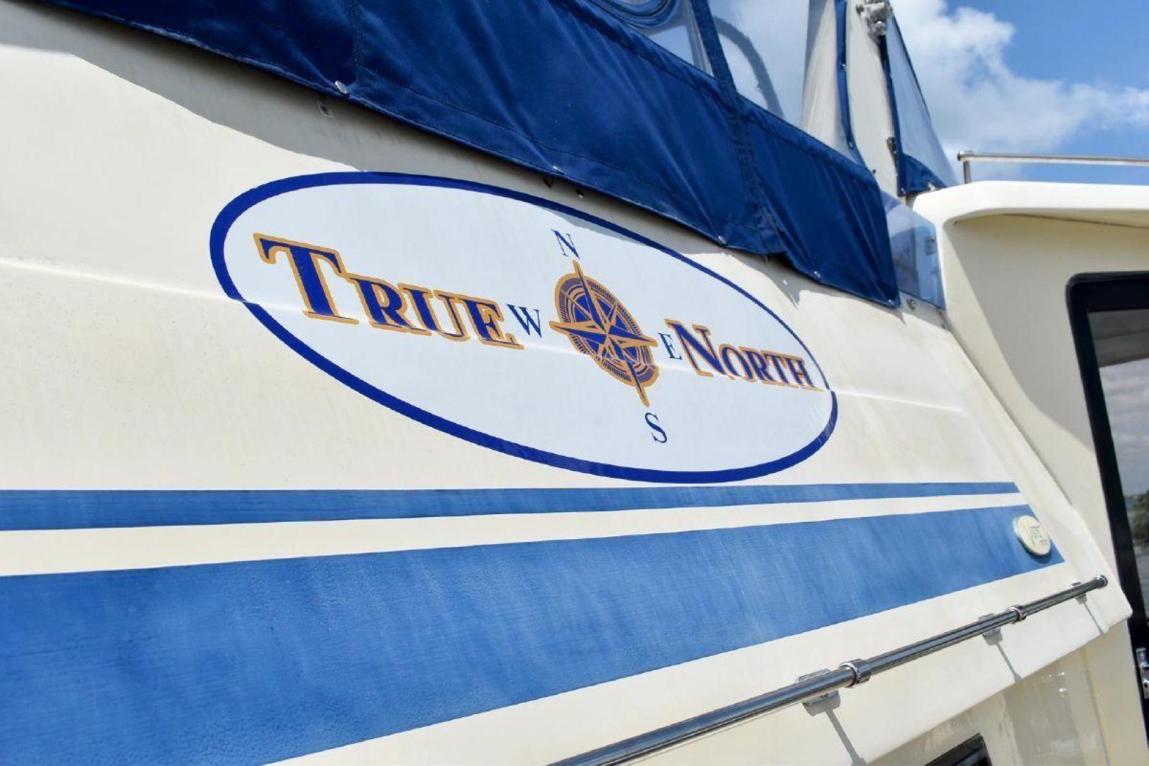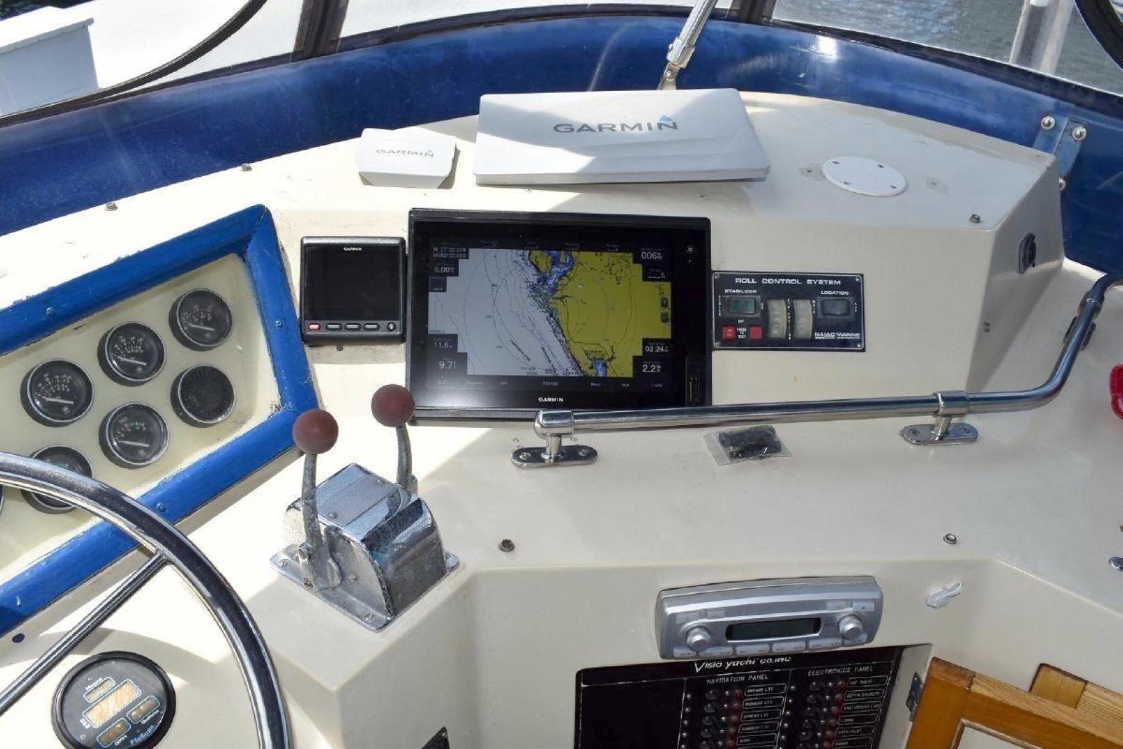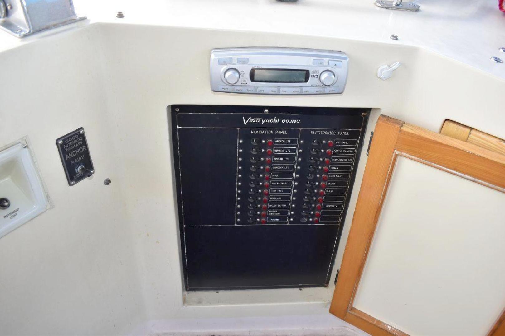 This Vista 43 is set up for cruising. True North offers reliable twin CAT 3208 with only 1560 and 1532 hrs. on the engines and a low 63 hrs. on a 6.5KW genset. True North offers a bow thruster for tight maneuvering, with a new battery. An updated large set of batteries (8 house and dedicated batteries for each engine and genset), 4 new large solar panels (190 watts each), keeps everything charged and a 3kw inverter will keep your refrigerator running for a long time at anchor. A feature of True North is working stabilizers to help with the rocking while making longer runs offshore. Electronics include updated Garmin X5 Color Chart plotter (AIS 2000) with Radar with 2 smaller Garmin Color plotter below, and new updated Autopilot.