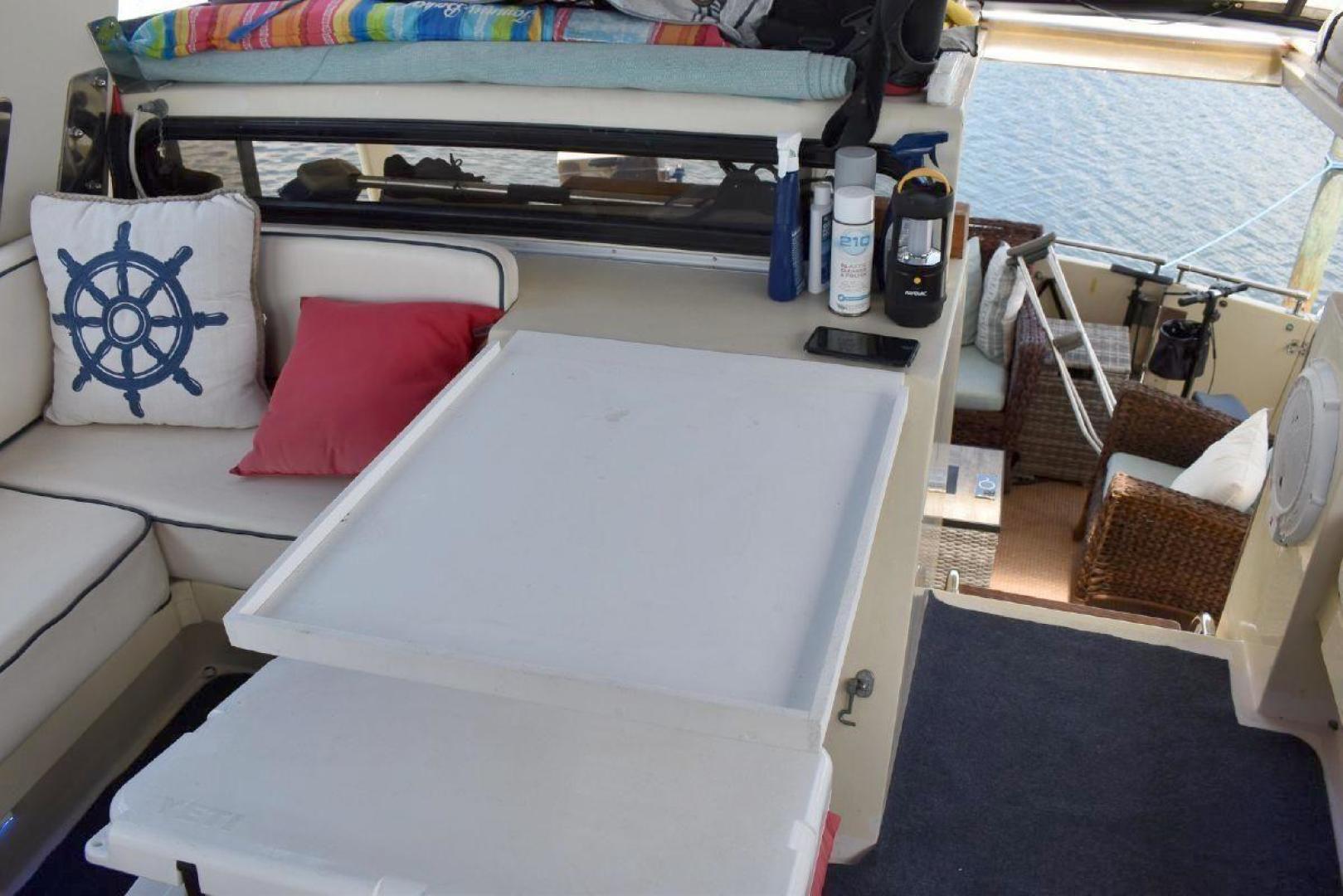 The flybridge is easy access from the aft deck, and offers plenty of seating. On the colder days, you have your option of an inside helm with a captain’s door, as well as Flying Bridge controls.