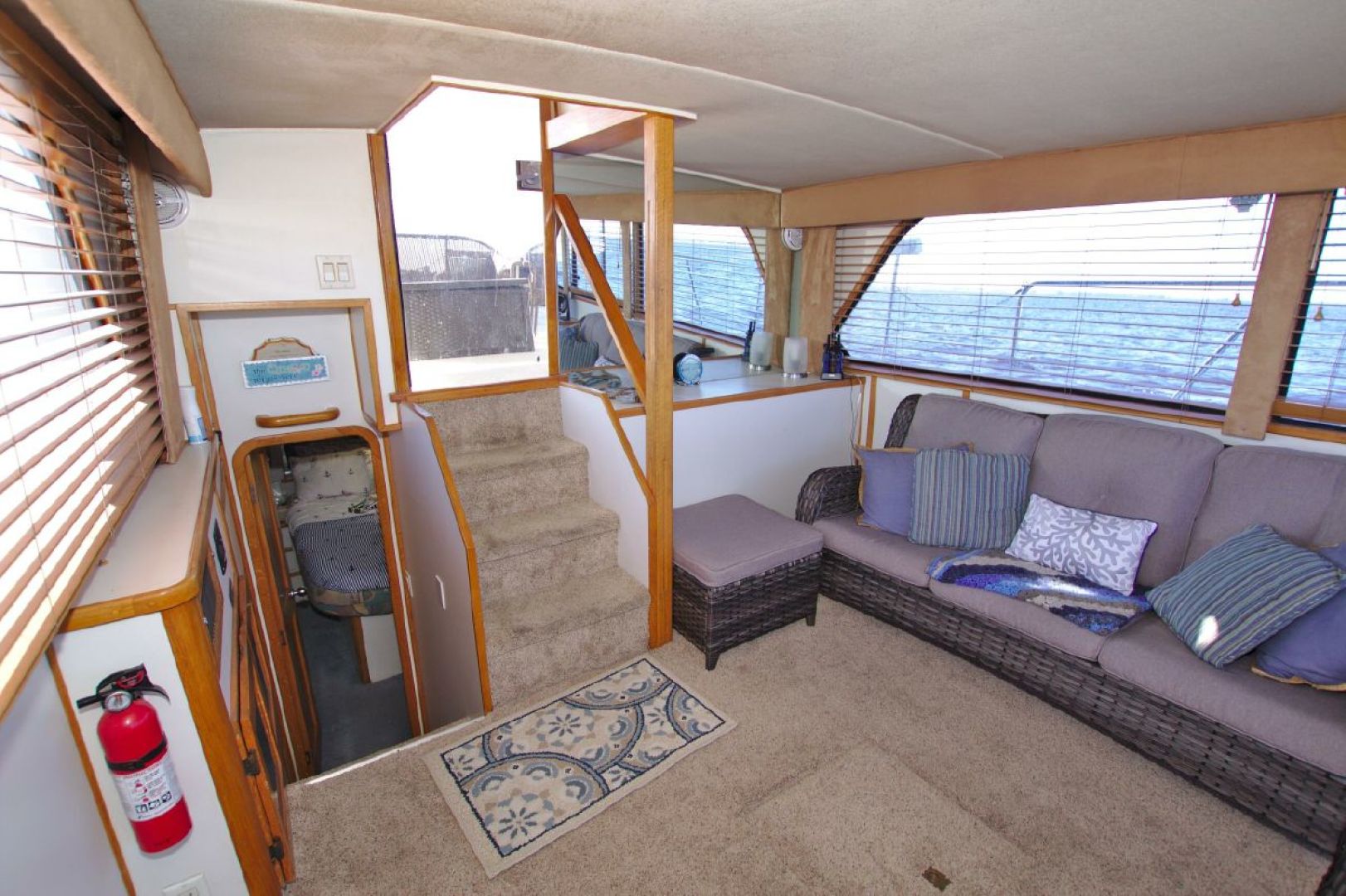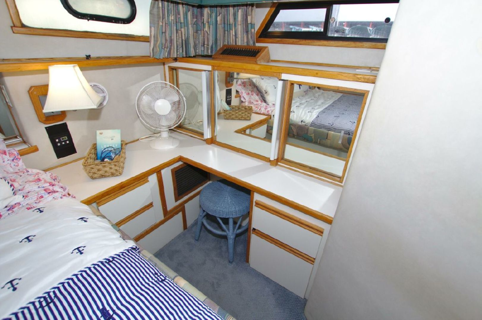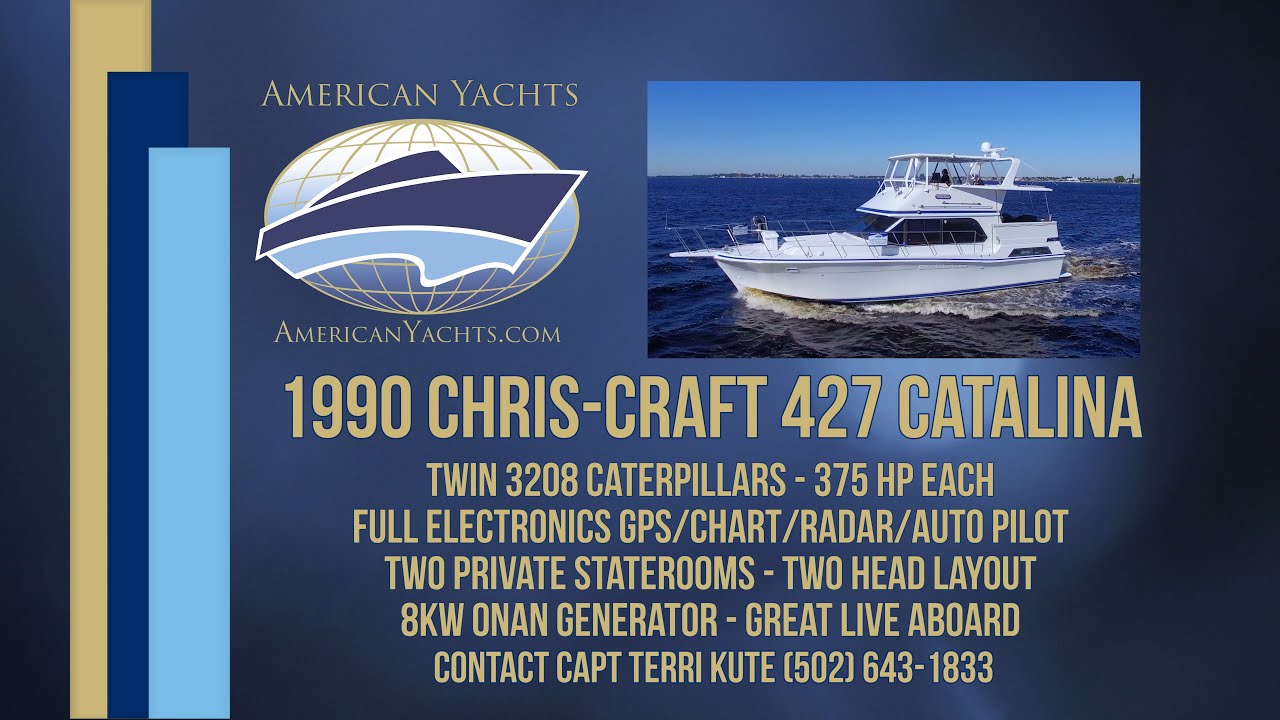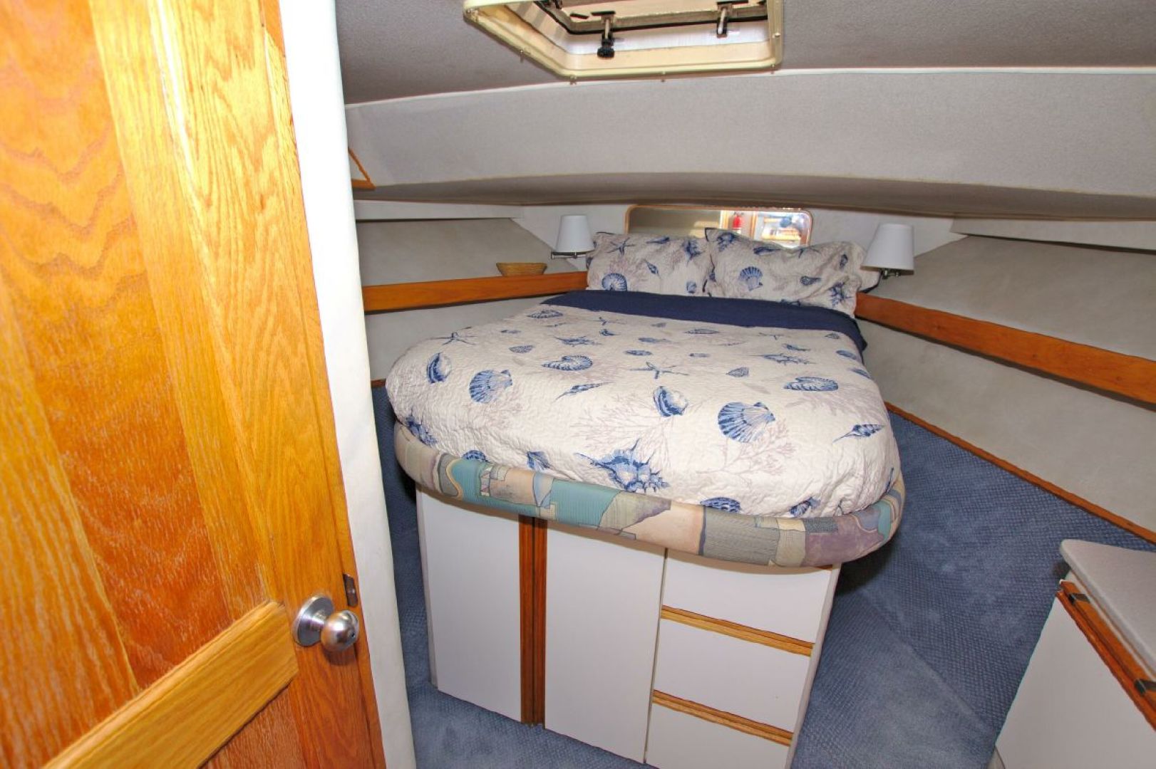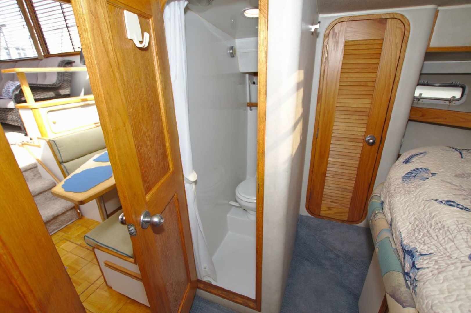 The Chris Craft 427 is a large, roomy vessel that's perfect for cruising or as a live-aboard. For those who like "home-like accommodations" the double stateroom arrangement is ideal with walk-around queen beds in each and en-suite heads. Separating the staterooms is a very comfortable main salon/galley area with a full-size fridge and dinette. Outside living is outstanding with the covered aft deck and spacious bridge deck. The 427 has a great reputation as a safe and stable platform with her modified V hull and twin diesel 3208 engines. "Whimsea" is in great shape and ready for her new owners.