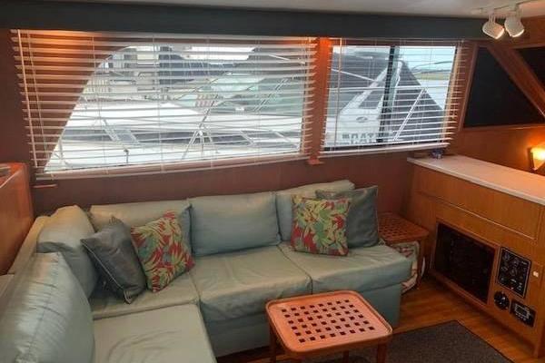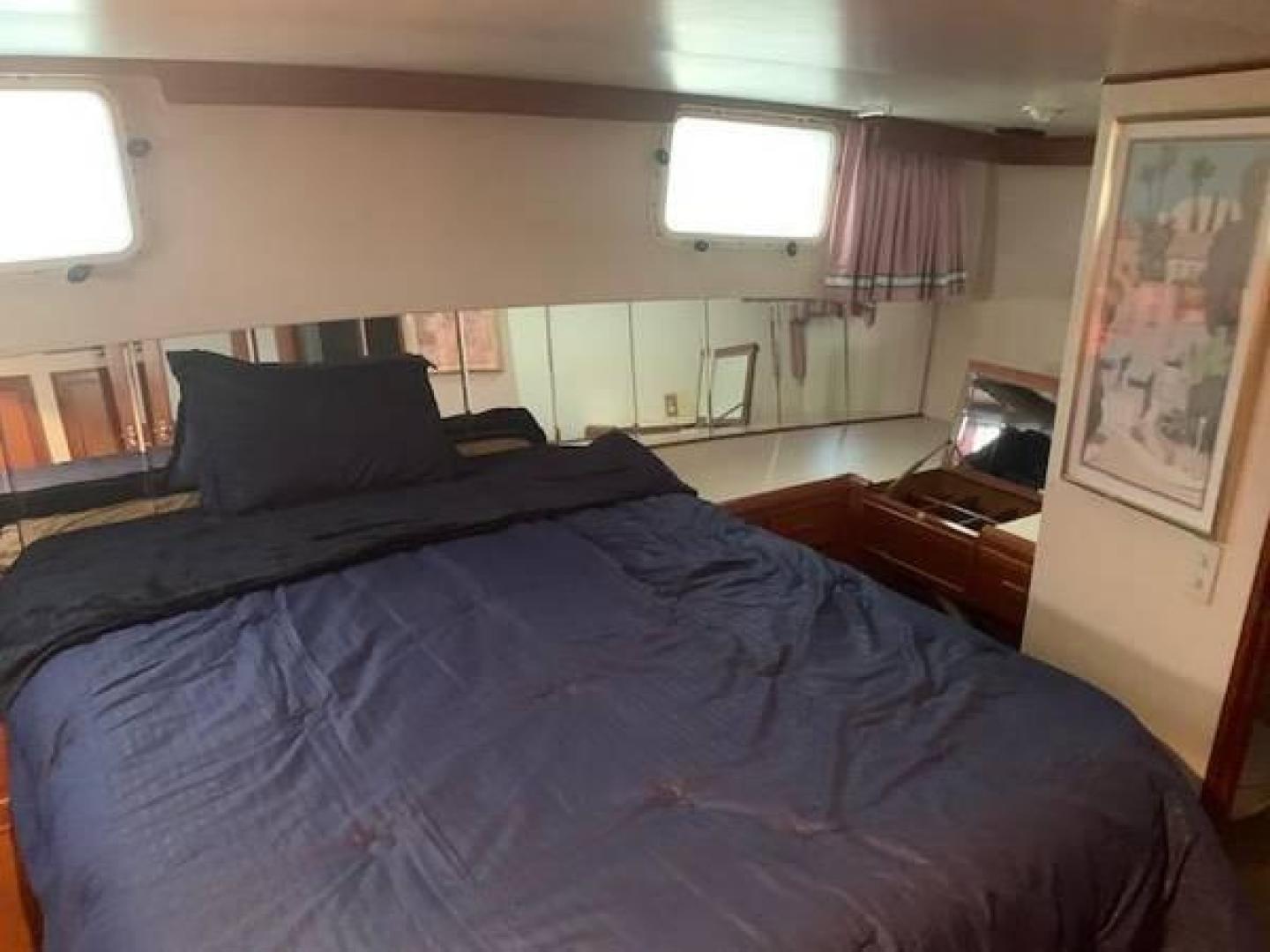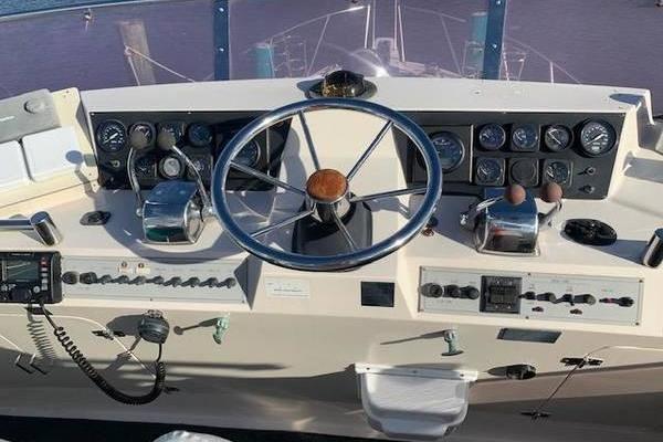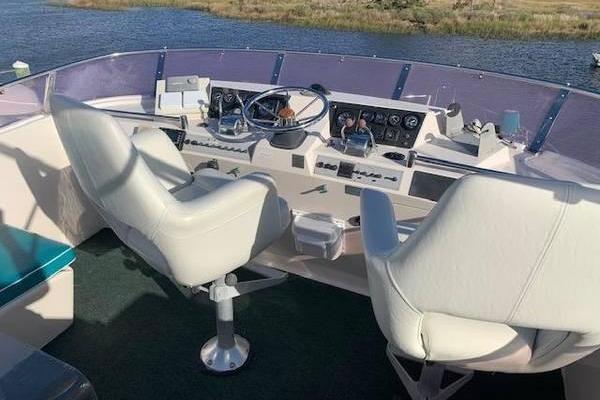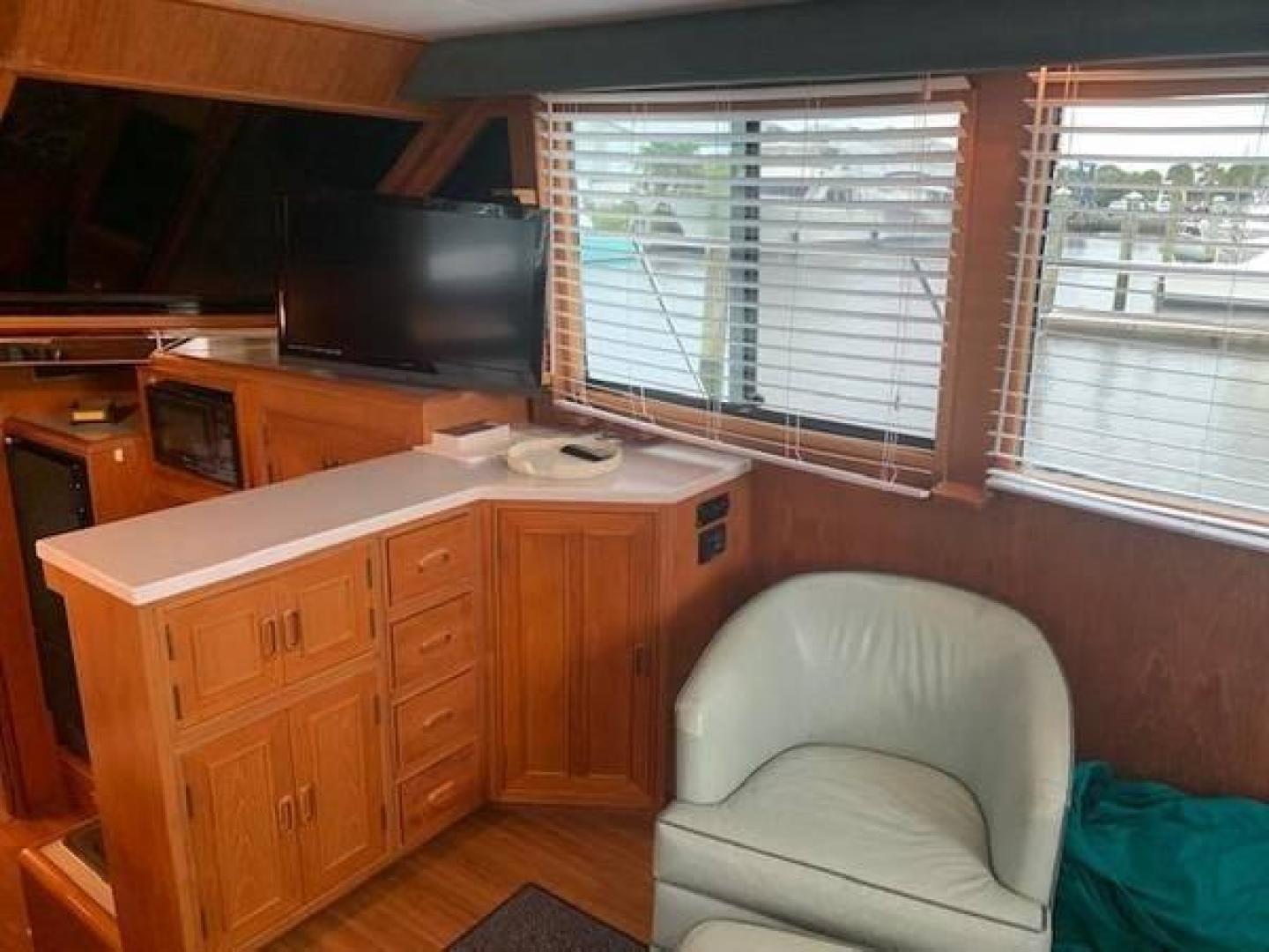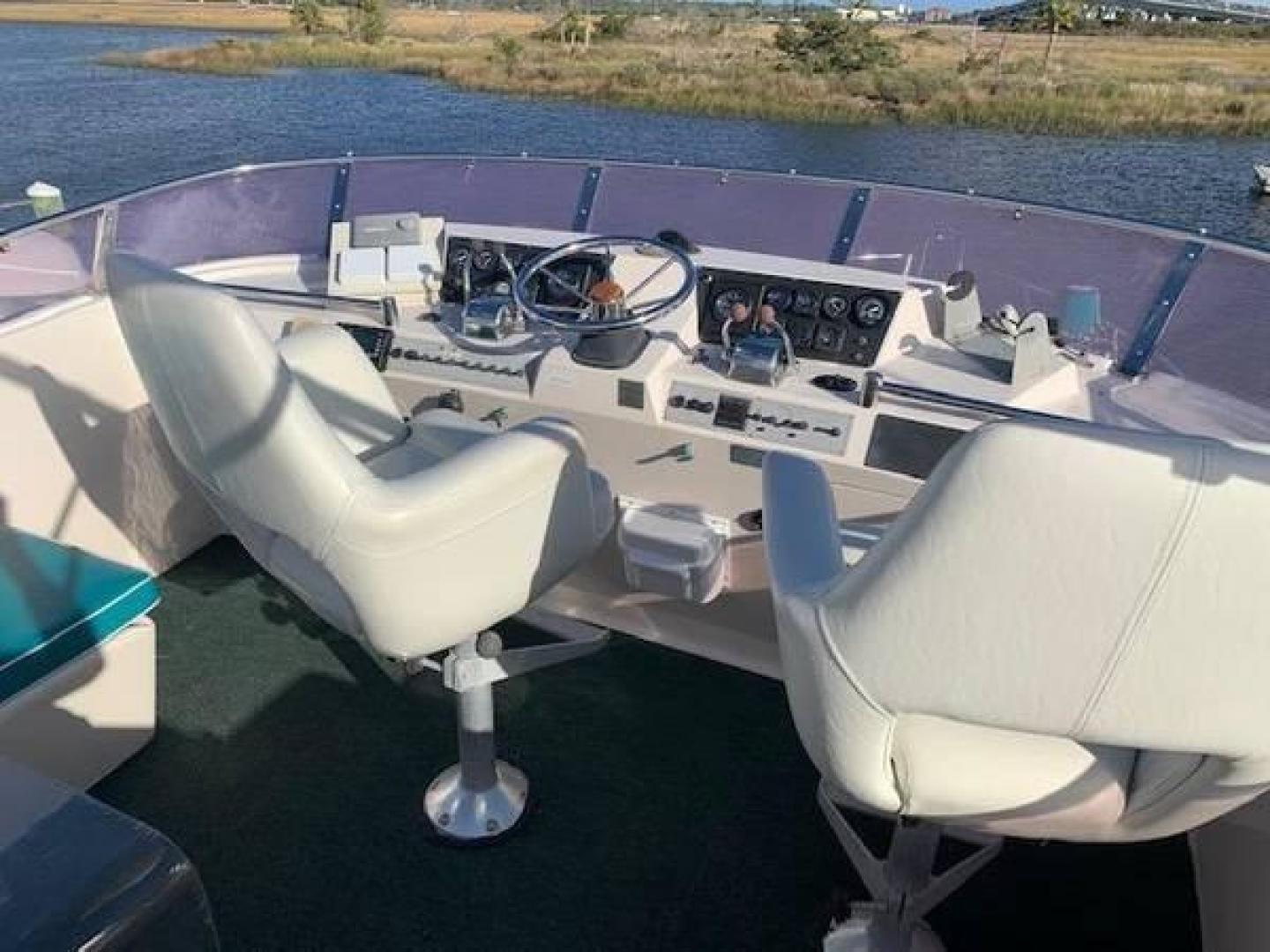 PLUSH WELL BUILT ALL GLASS-DOUBLE CABIN,GALLEY DOWN, 2 COMPLETE HEADS WITH SHOWERS-COMFORTABLE SALON-LARGE WINDOWS FOR THE OPEN AND AIRY FEELING-GALLEY WITH STOVE -FRIDGE MICROWAVE SS SINK-HARDWOOD FLOORS-WELL APPOINTED-MASTER STATEROOM HAS FULL WALK AROUND PEDESTAL BED WITH LARGE CLOSETS AND MAKE UP CENTER WITH BUILT IN MIRROR -SEPARATE ENCLOSED SHOWERS-2 CENTRAL AIR CONDITIONING AND HEAT-BLINDS AND CURTAINS-REAR DECK WITH BAR/STORAGE AND DECK FURNITURE-WITH FULL ENCLOSURE AND WING DOORS-FOR COMFORT-ALSO ENCLOSURE FOR BRIDGE WITH DUAL HELM SEATS AND CORNER SEATING-STAINLESS STEEL HANDRAILS-RADAR ARCH (FOLD DOWN) TRAC VISION FOR TV ROAMING-BUILT IN 1993 BY CAMARUGE SHE REEKS OF QUALITY-WIDE BOARDING LADDER ON TRANSOM FROM A WIDE SWIM PLATFORM-GREAT LINES