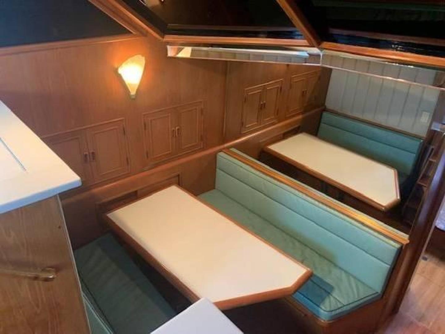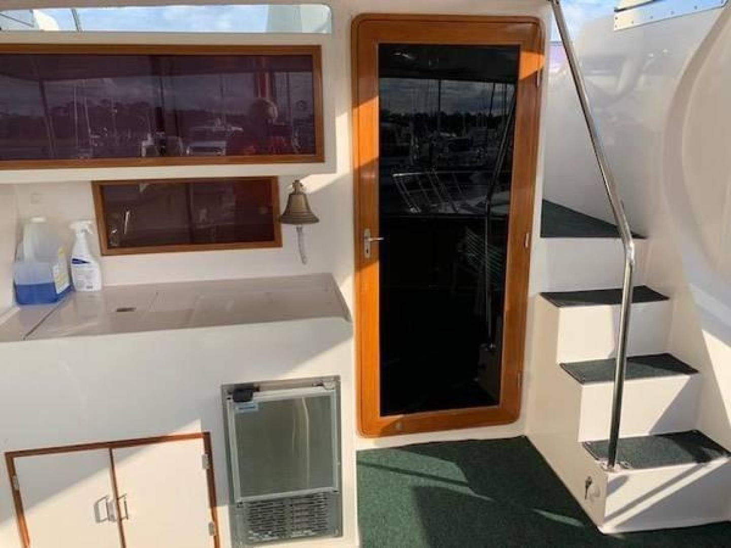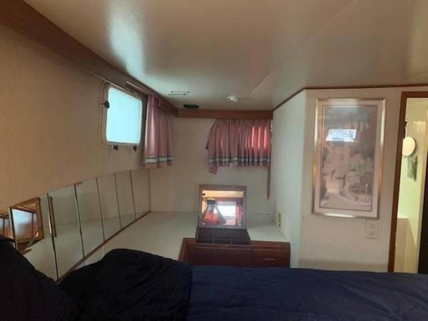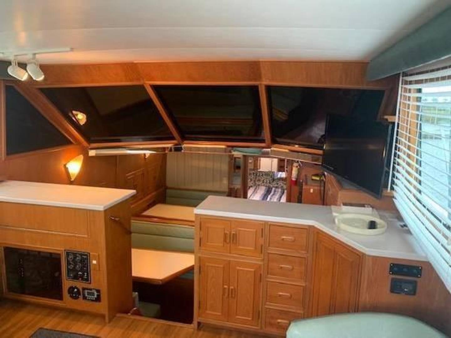 PLUSH WELL BUILT ALL GLASS-DOUBLE CABIN,GALLEY DOWN, 2 COMPLETE HEADS WITH SHOWERS-COMFORTABLE SALON-LARGE WINDOWS FOR THE OPEN AND AIRY FEELING-GALLEY WITH STOVE -FRIDGE MICROWAVE SS SINK-HARDWOOD FLOORS-WELL APPOINTED-MASTER STATEROOM HAS FULL WALK AROUND PEDESTAL BED WITH LARGE CLOSETS AND MAKE UP CENTER WITH BUILT IN MIRROR -SEPARATE ENCLOSED SHOWERS-2 CENTRAL AIR CONDITIONING AND HEAT-BLINDS AND CURTAINS-REAR DECK WITH BAR/STORAGE AND DECK FURNITURE-WITH FULL ENCLOSURE AND WING DOORS-FOR COMFORT-ALSO ENCLOSURE FOR BRIDGE WITH DUAL HELM SEATS AND CORNER SEATING-STAINLESS STEEL HANDRAILS-RADAR ARCH (FOLD DOWN) TRAC VISION FOR TV ROAMING-BUILT IN 1993 BY CAMARUGE SHE REEKS OF QUALITY-WIDE BOARDING LADDER ON TRANSOM FROM A WIDE SWIM PLATFORM-GREAT LINES