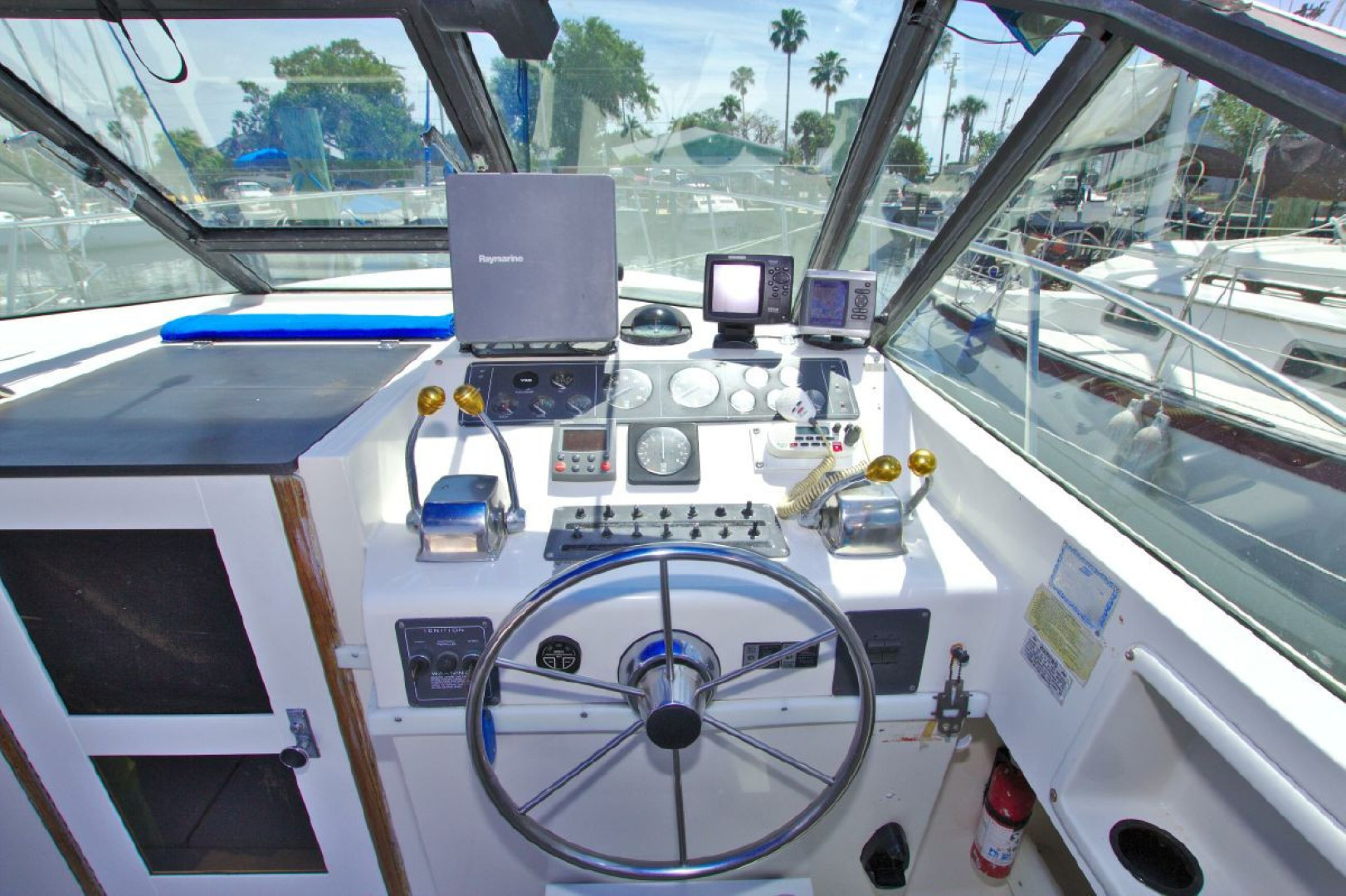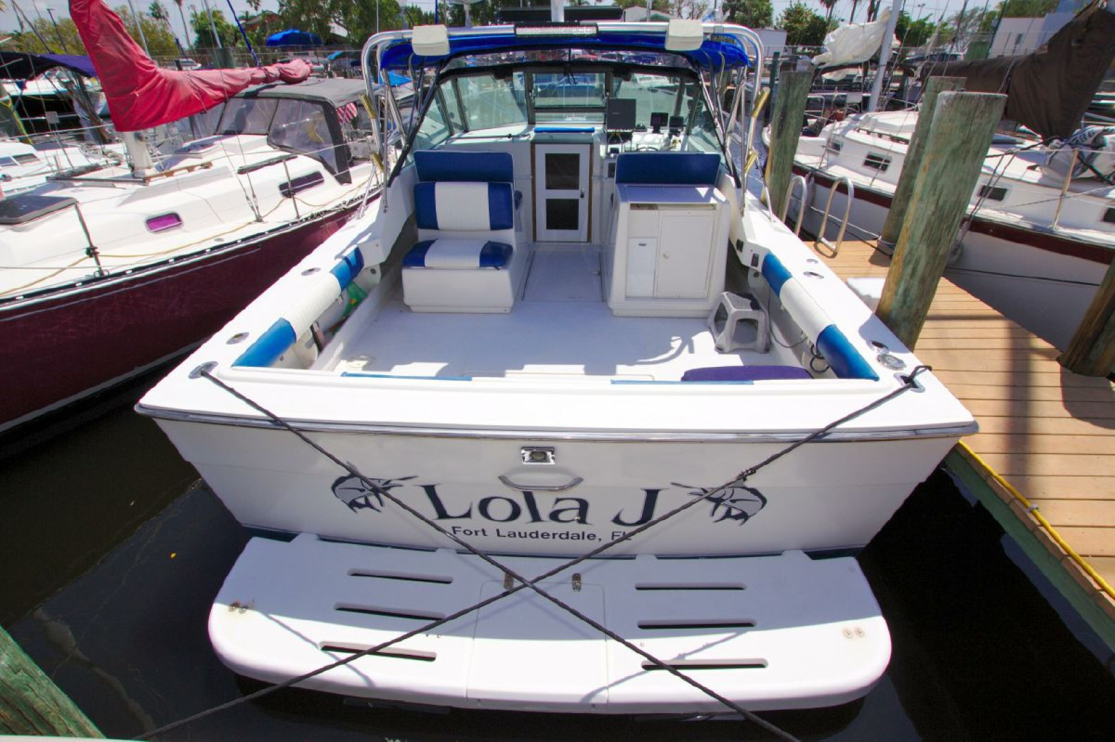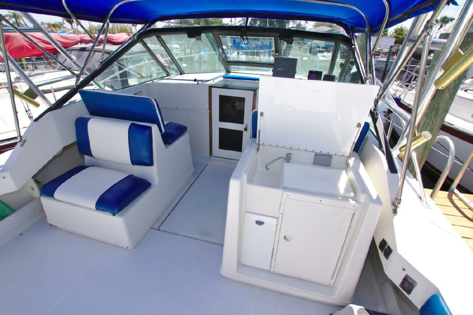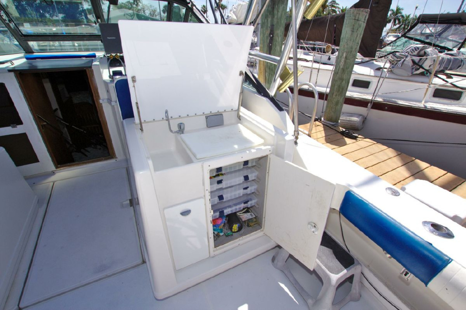 Single-level cockpit provides excellent fishing platform with room for mounted chair. Bait and tackle center fits behind helm seat; in-floor live well was popular option.