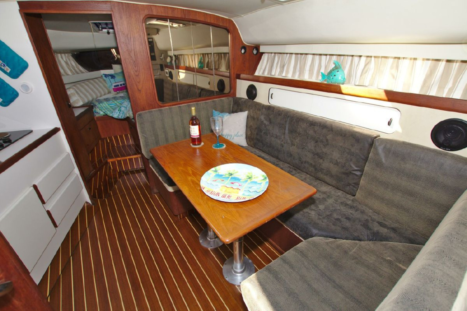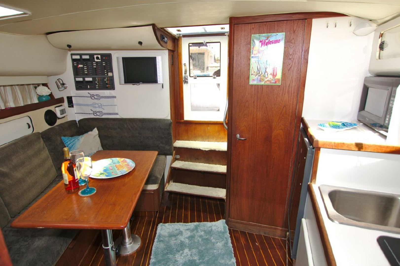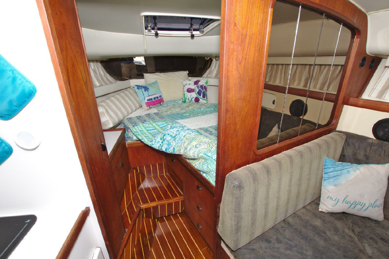 Roomy cabin, U-shaped dinette, private stateroom sleeps four.