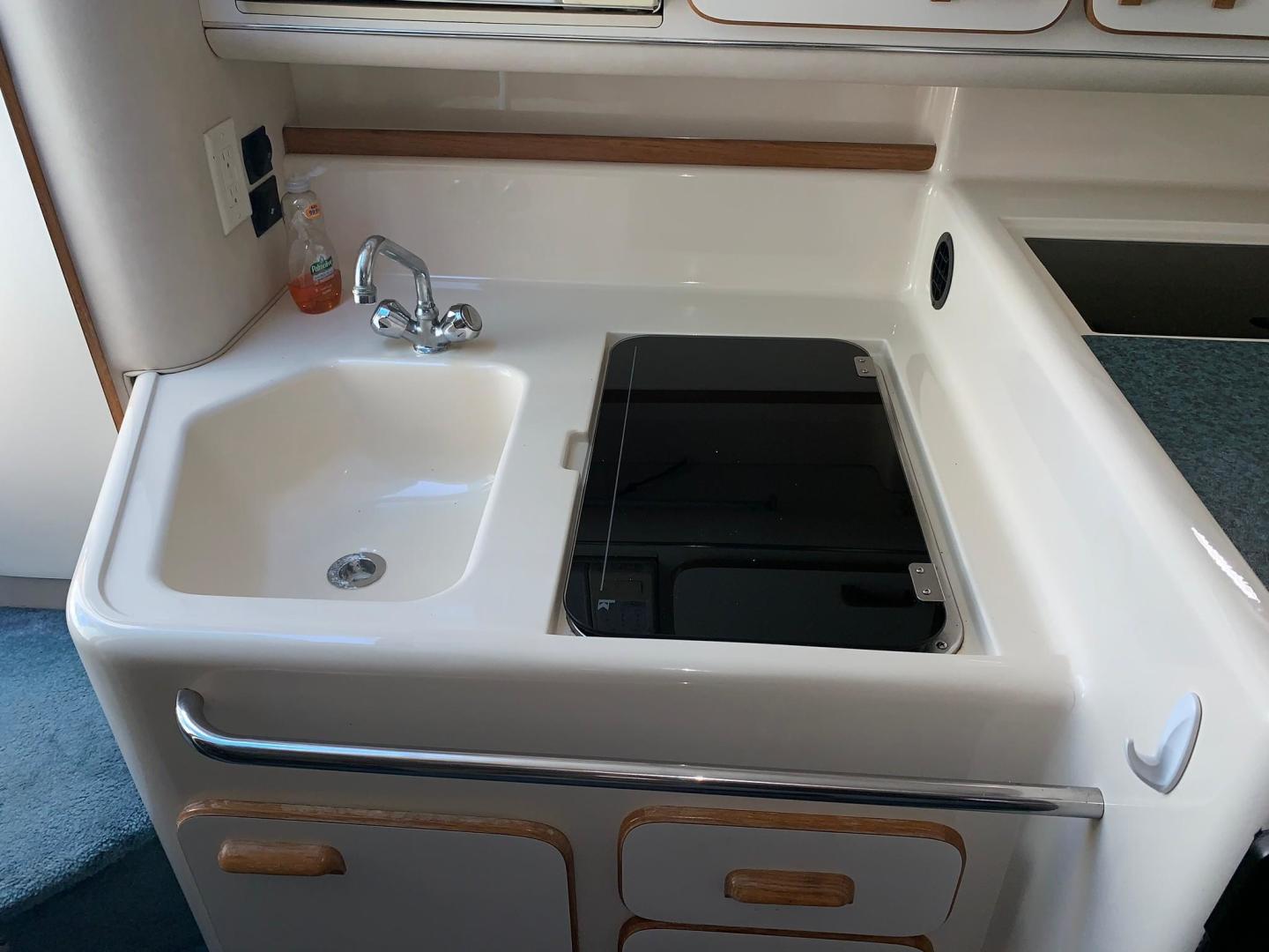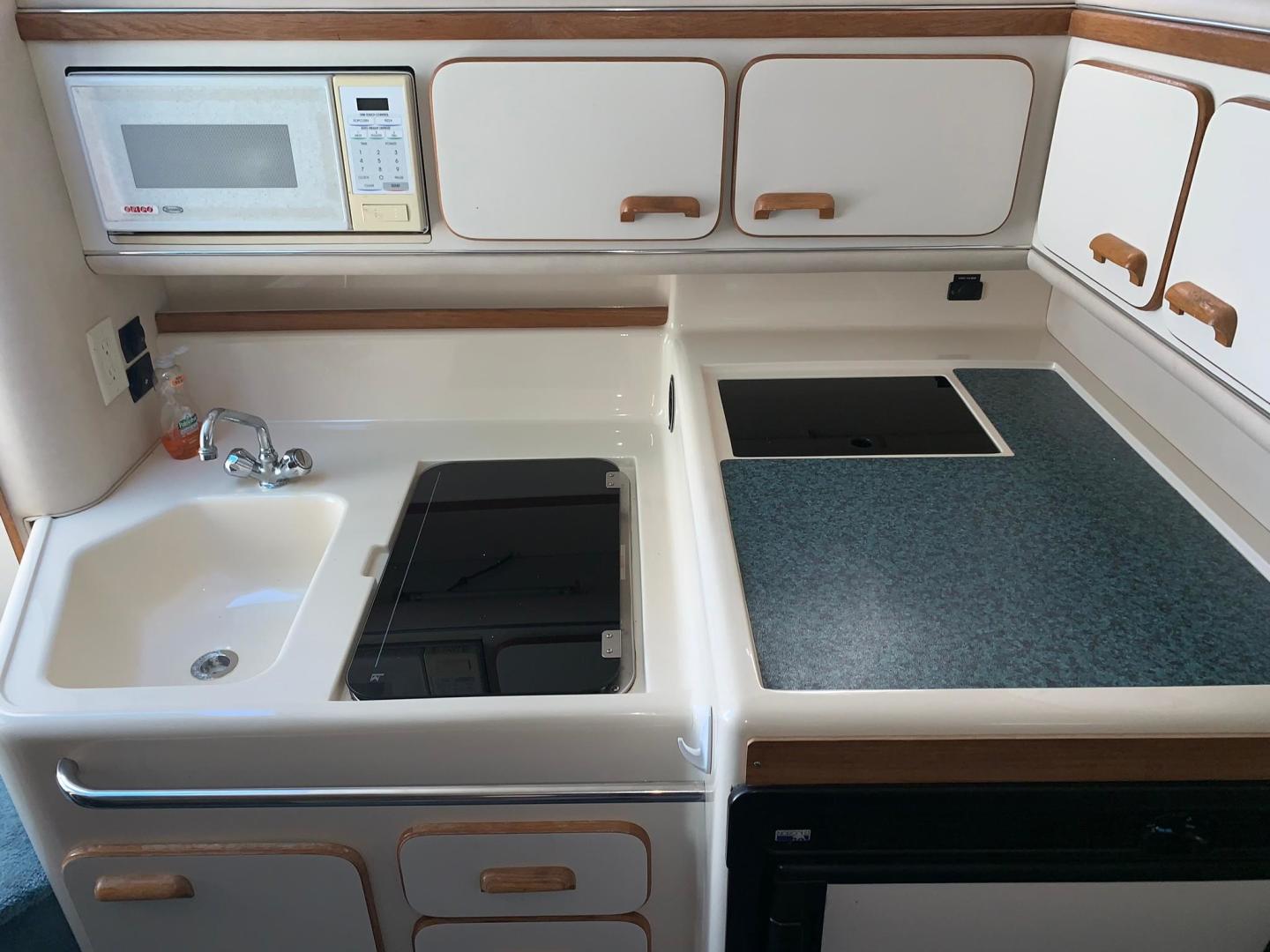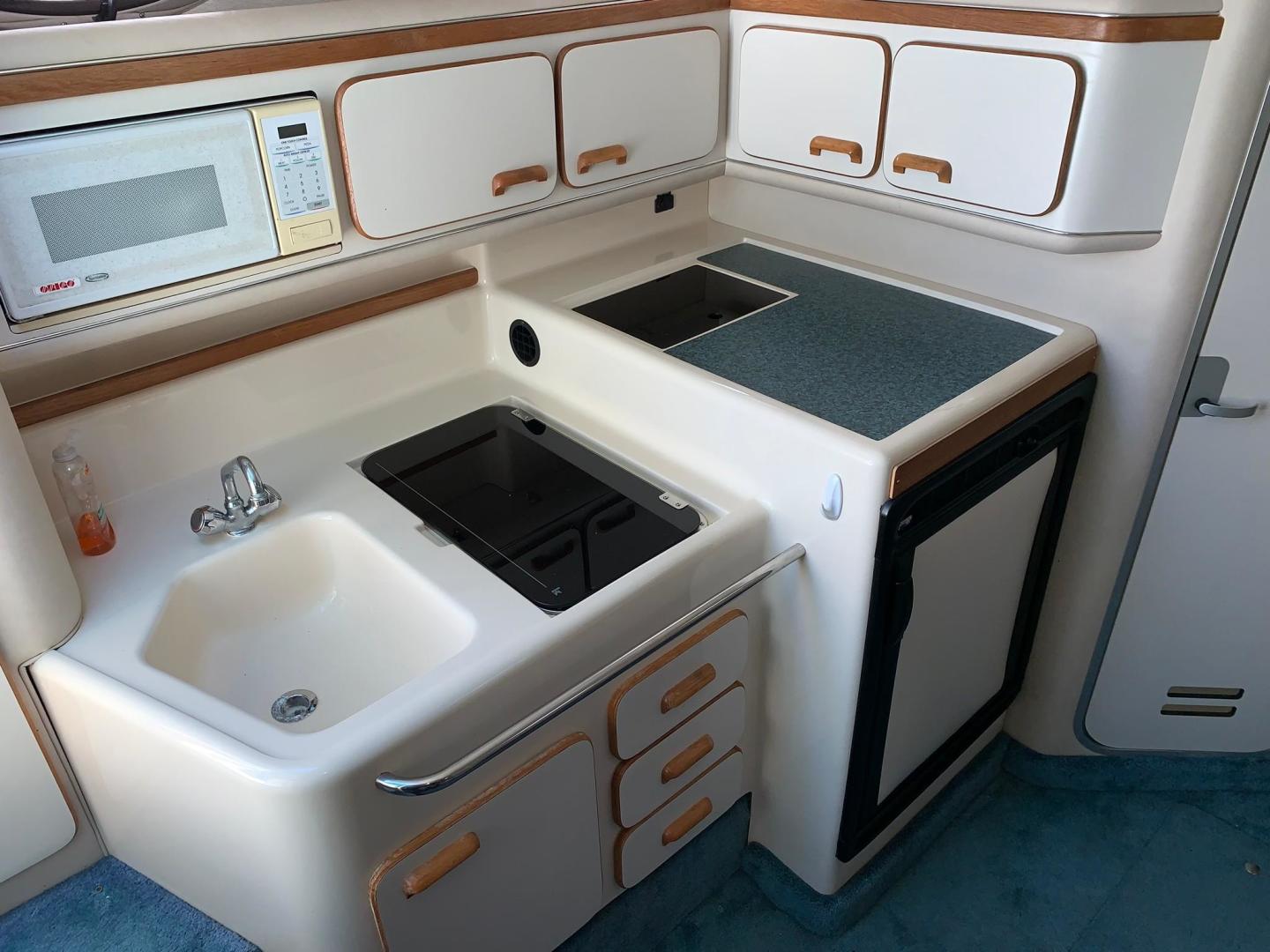 With its distinctive styling, the Sea Ray 330 Sundancer stands apart from the crowd. This 33-footer sleeps six, has a large, versatile cockpit and all the performance anyone ever needs in a family cruiser. The double helm seat gives captain and navigator a clear view of the water through the tempered glass windshield, which is center-vented to catch sea breezes and provide access to the foredeck. All instrumentation is within easy reach, including the standard VHF radio and Lowrance depth finder. A portside wet bar stands ready to accommodate any cockpit refreshment needs. The convenient fold-down step assists passengers in boarding. Lower the cockpit table, add the filler cushion, and create a sunpad for two. The aft seat is hinged so that the electrically actuated cockpit sole rises for instant access to the engines. Standard canvas package includes Sunbrella bimini top - sun shade with interlocking top extrusion, boot and vertical top storage, front bimini curtains, side curtains, and an aft cover to protect the cockpit. Belowdecks to starboard, a plush sofa provides plenty of room to relax as well as a comfortable dining area. Lower the table, add the plump filler cushion and the sofa turns into a double berth. The mid-stateroom functions as a conversation area during waking hours, then converts to a double berth during sleeping hours. A screened sliding window admits plenty of fresh air and light. The forward stateroom features a double berth, two large mirrored hanging lockers, a TV-VCR combination, and a privacy curtain that encloses the entire area. The head is located just inside the cabin door, providing easy access for passengers in the cockpit, as well as the cabin. The compartment includes a VacuFlush toilet, vanity with sink, and shower with curtain. In the galley, appointments include a large sink, refrigerator, flush-mounted two-burner electric stove, and microwave.