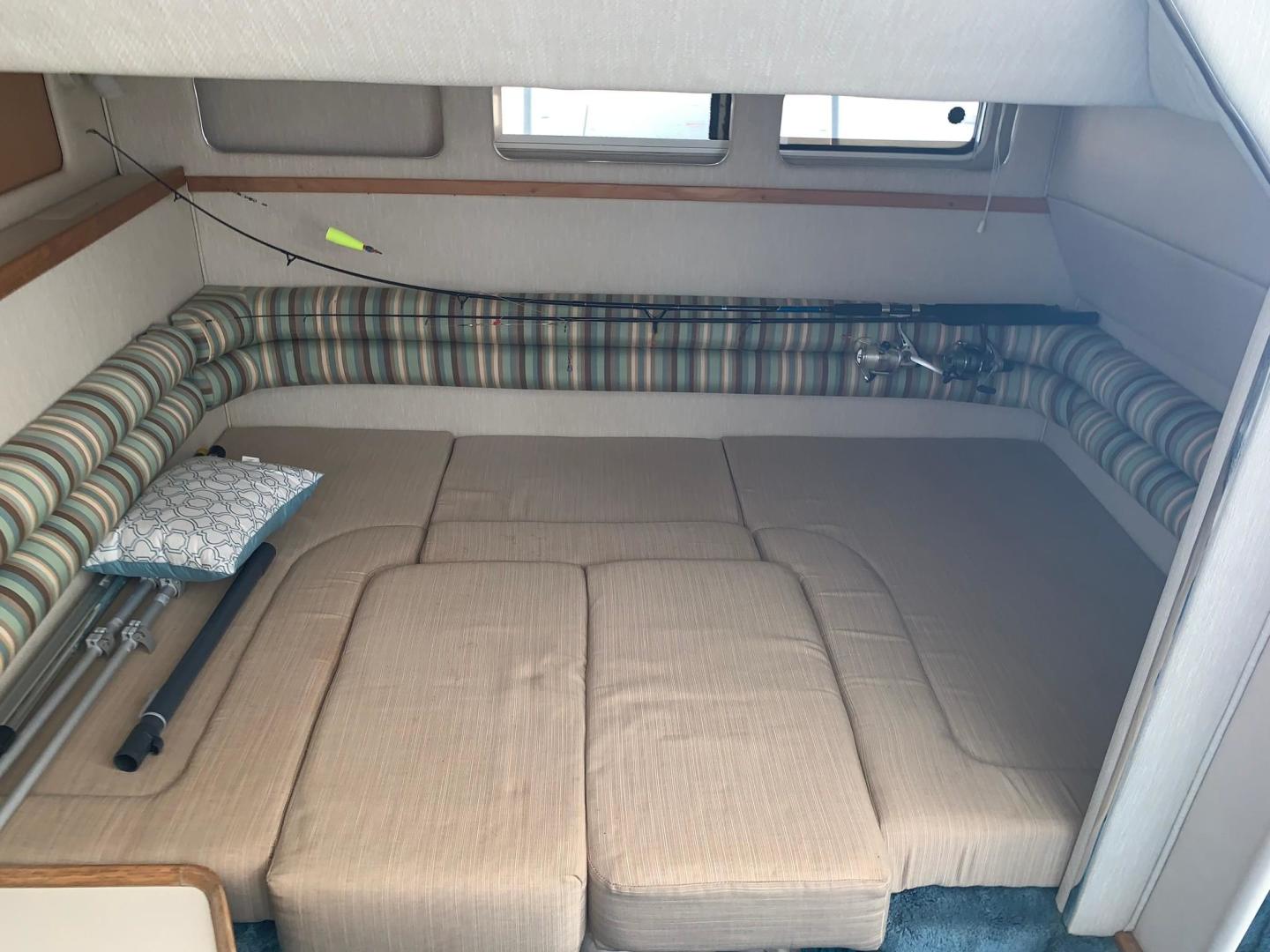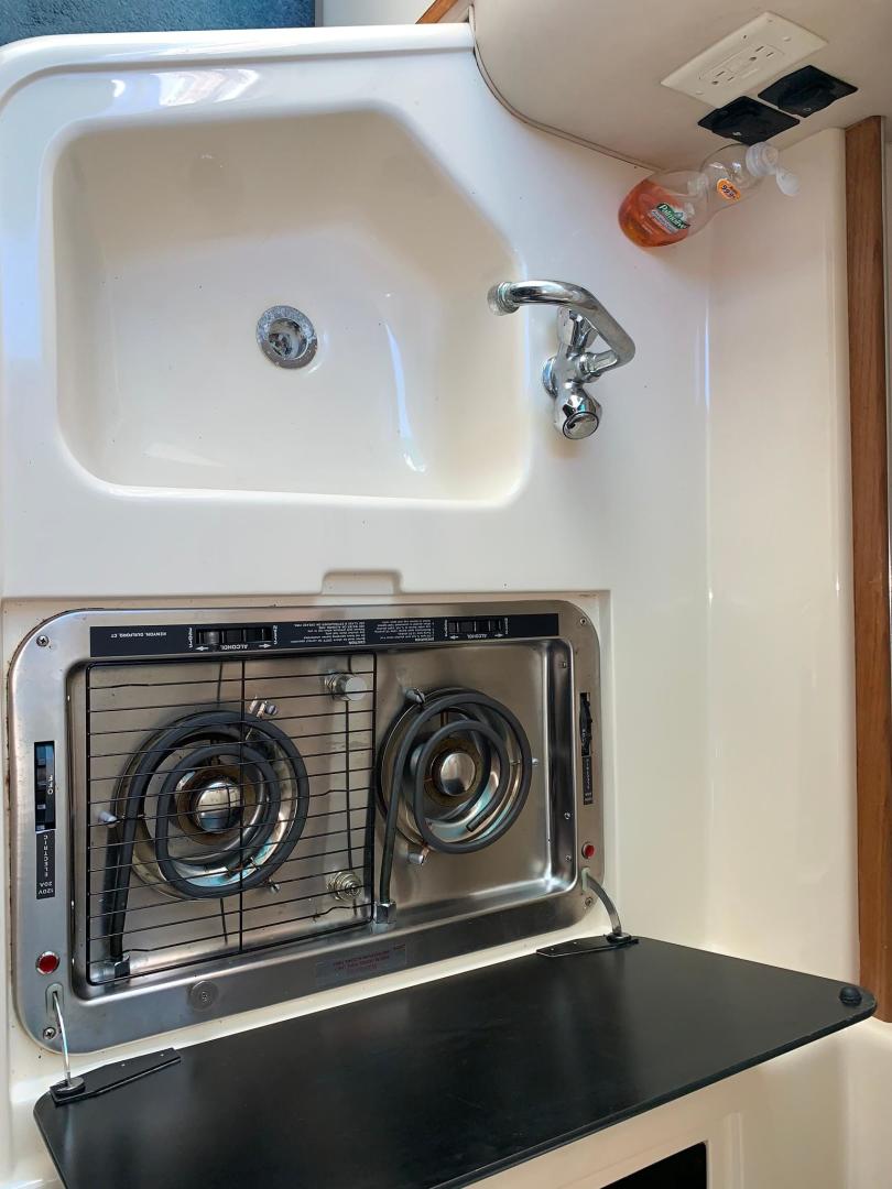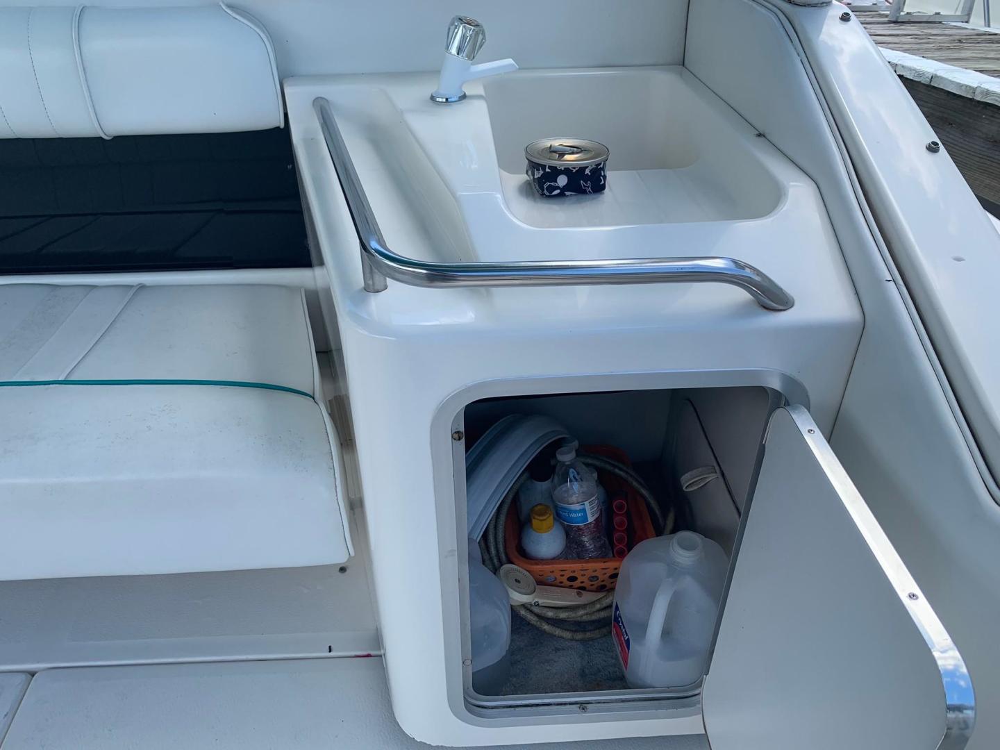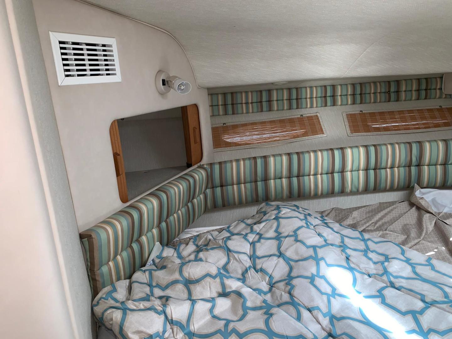 With its distinctive styling, the Sea Ray 330 Sundancer stands apart from the crowd. This 33-footer sleeps six, has a large, versatile cockpit and all the performance anyone ever needs in a family cruiser. The double helm seat gives captain and navigator a clear view of the water through the tempered glass windshield, which is center-vented to catch sea breezes and provide access to the foredeck. All instrumentation is within easy reach, including the standard VHF radio and Lowrance depth finder. A portside wet bar stands ready to accommodate any cockpit refreshment needs. The convenient fold-down step assists passengers in boarding. Lower the cockpit table, add the filler cushion, and create a sunpad for two. The aft seat is hinged so that the electrically actuated cockpit sole rises for instant access to the engines. Standard canvas package includes Sunbrella bimini top - sun shade with interlocking top extrusion, boot and vertical top storage, front bimini curtains, side curtains, and an aft cover to protect the cockpit. Belowdecks to starboard, a plush sofa provides plenty of room to relax as well as a comfortable dining area. Lower the table, add the plump filler cushion and the sofa turns into a double berth. The mid-stateroom functions as a conversation area during waking hours, then converts to a double berth during sleeping hours. A screened sliding window admits plenty of fresh air and light. The forward stateroom features a double berth, two large mirrored hanging lockers, a TV-VCR combination, and a privacy curtain that encloses the entire area. The head is located just inside the cabin door, providing easy access for passengers in the cockpit, as well as the cabin. The compartment includes a VacuFlush toilet, vanity with sink, and shower with curtain. In the galley, appointments include a large sink, refrigerator, flush-mounted two-burner electric stove, and microwave.