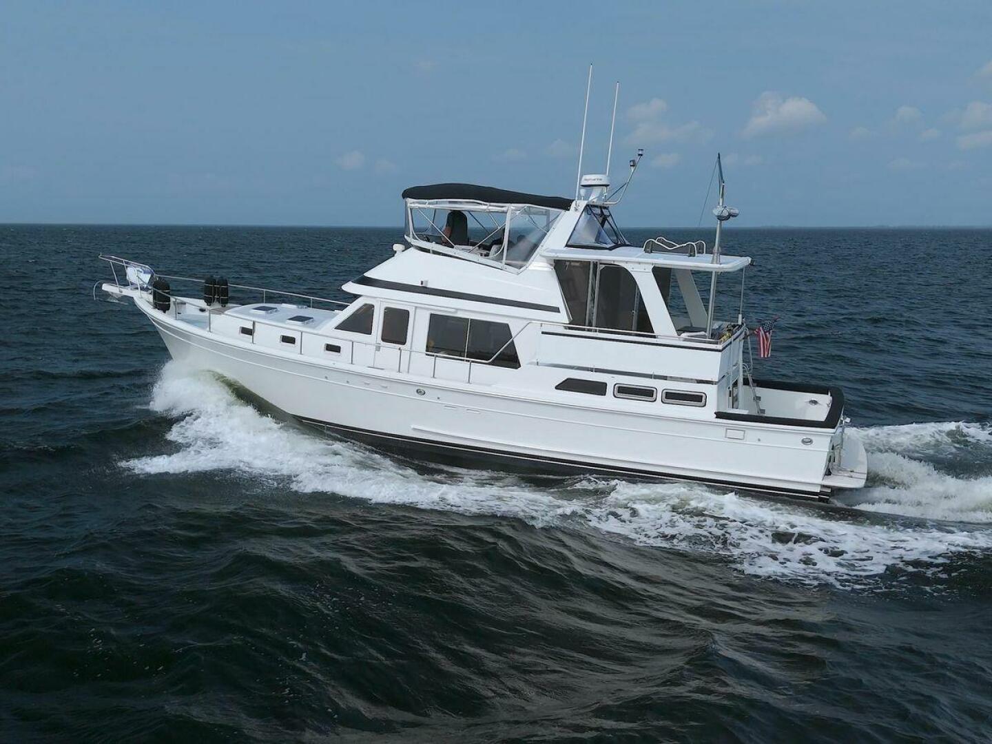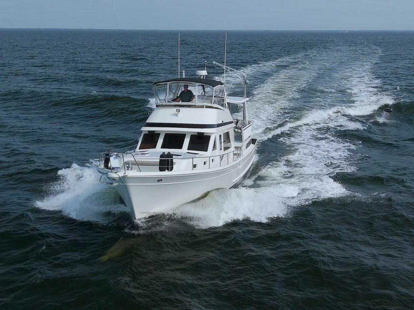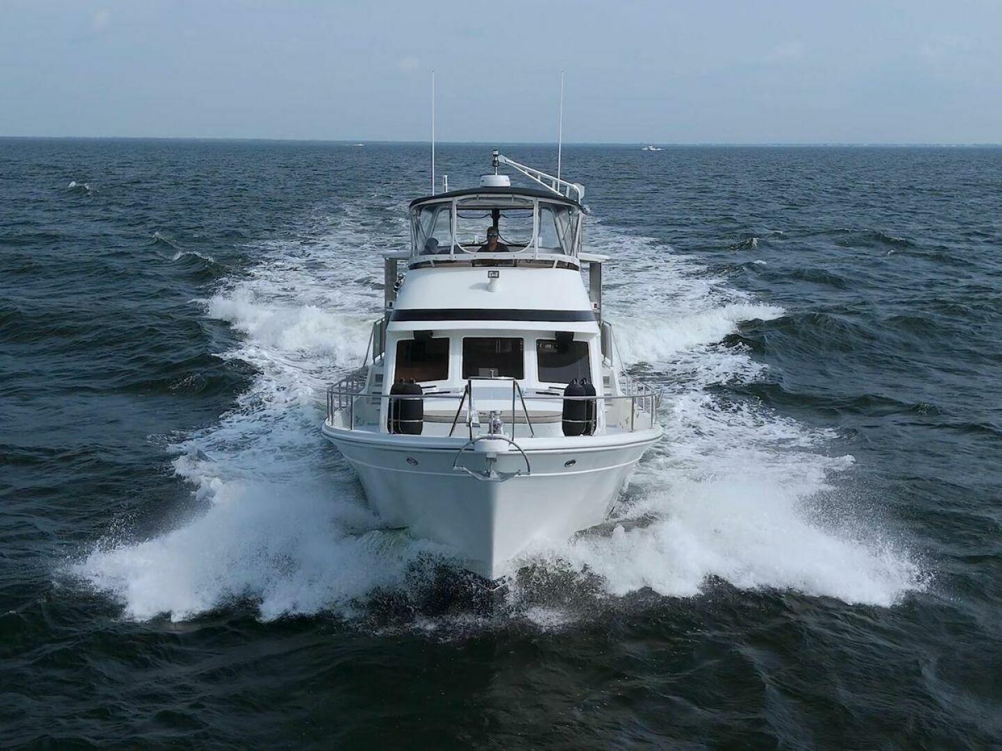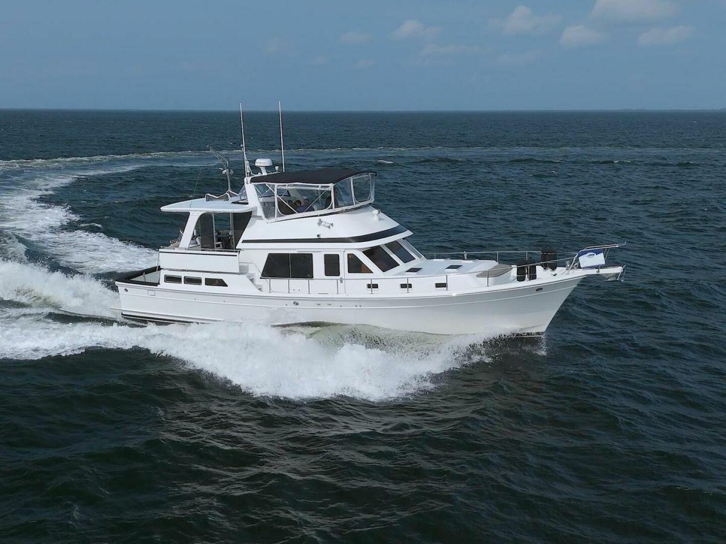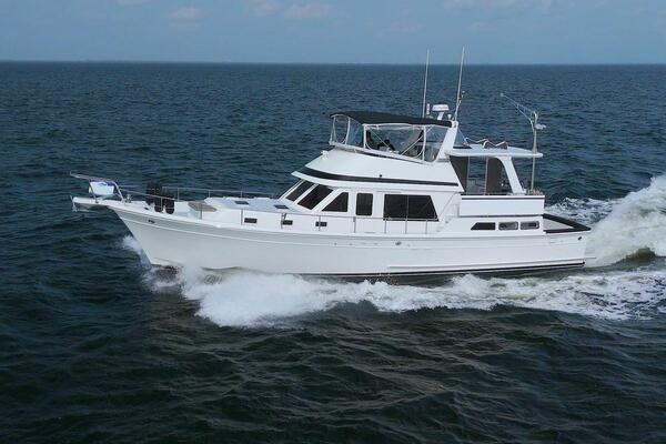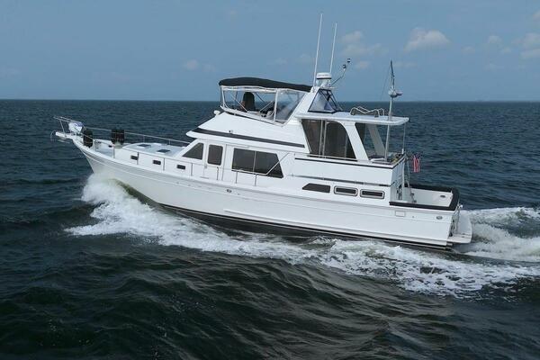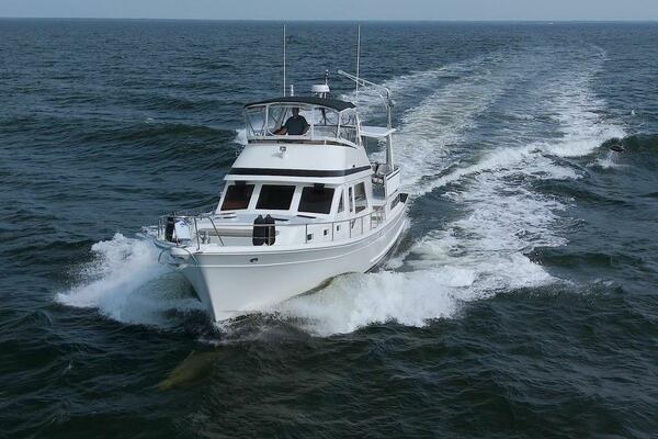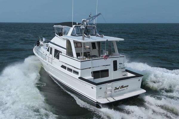 The Offshore 48 CPMY, produced from 1985-1999, has long been popular with boaters who have experienced the reality of life at sea. Thanks to the boat's substantial displacement, long shallow keel, low profile, and low center of gravity, the 48 offers a rock-solid ride and a high degree of directional stability. Repowered in 2002 with twin 420 horsepower Caterpillar 3126 diesels. She cruises at 17 knots and can reach a top speed of around 21 knots.