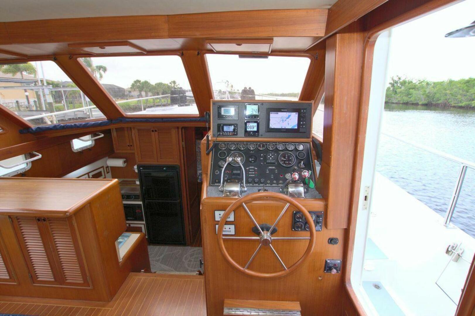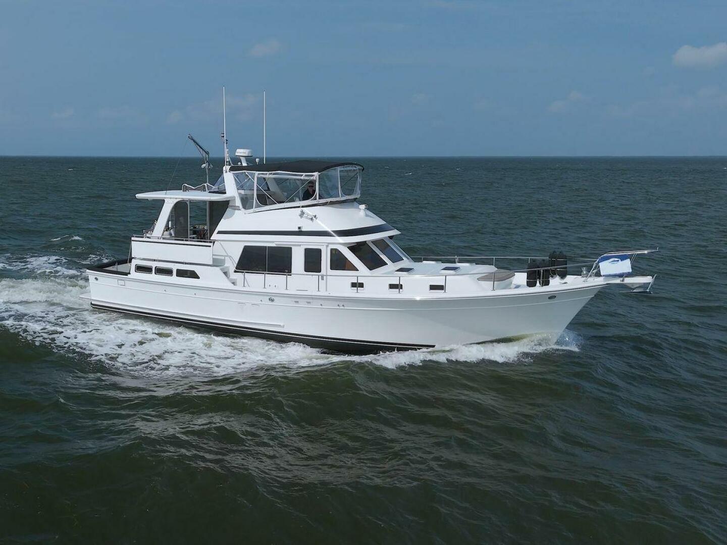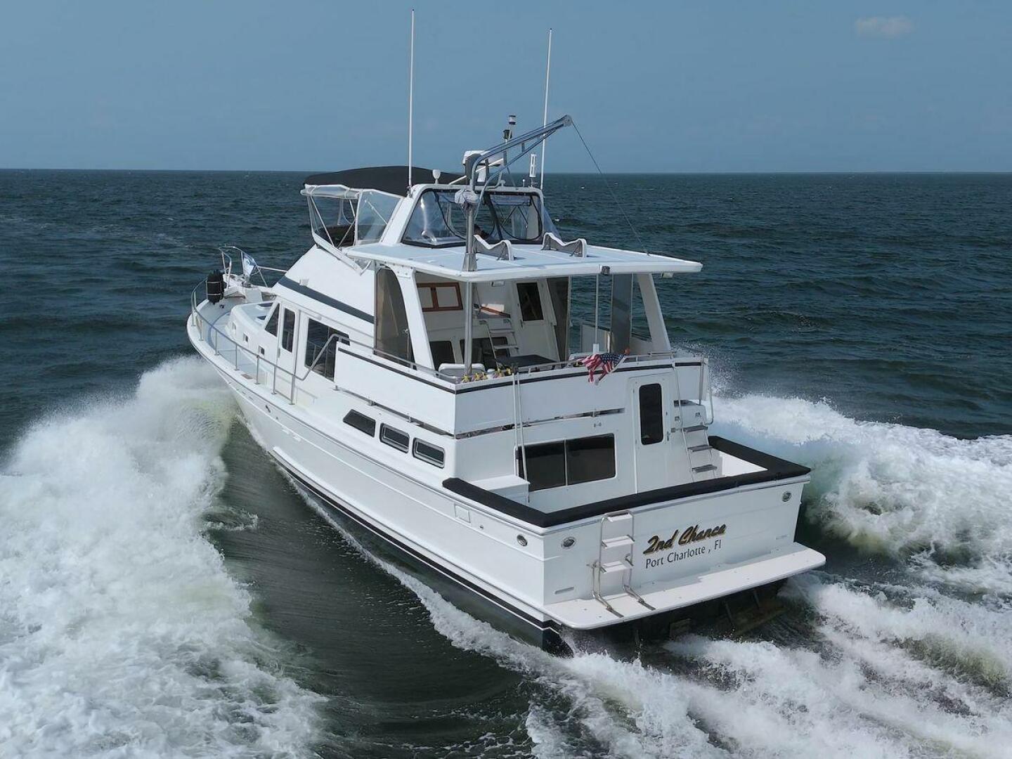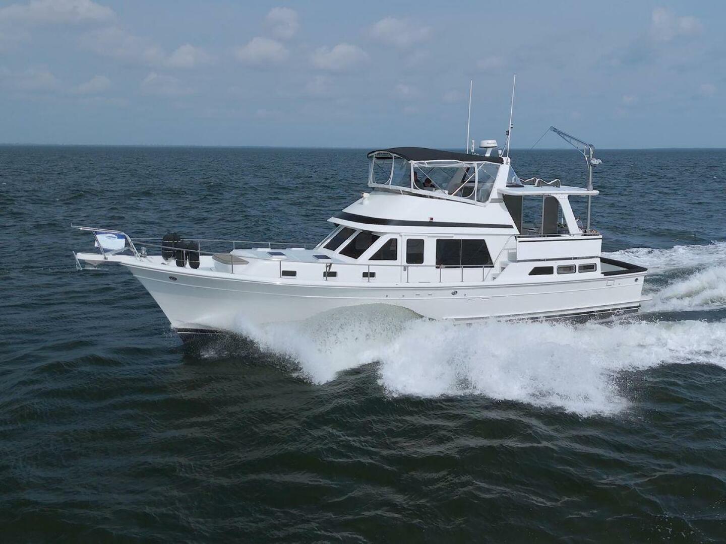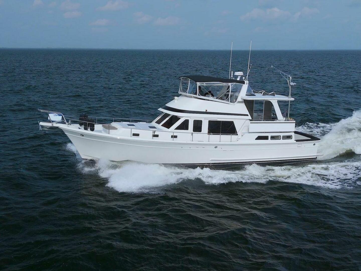 The Offshore 48 CPMY, produced from 1985-1999, has long been popular with boaters who have experienced the reality of life at sea. Thanks to the boat's substantial displacement, long shallow keel, low profile, and low center of gravity, the 48 offers a rock-solid ride and a high degree of directional stability. Repowered in 2002 with twin 420 horsepower Caterpillar 3126 diesels. She cruises at 17 knots and can reach a top speed of around 21 knots.