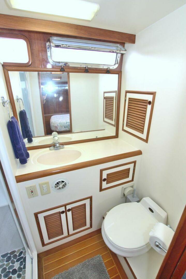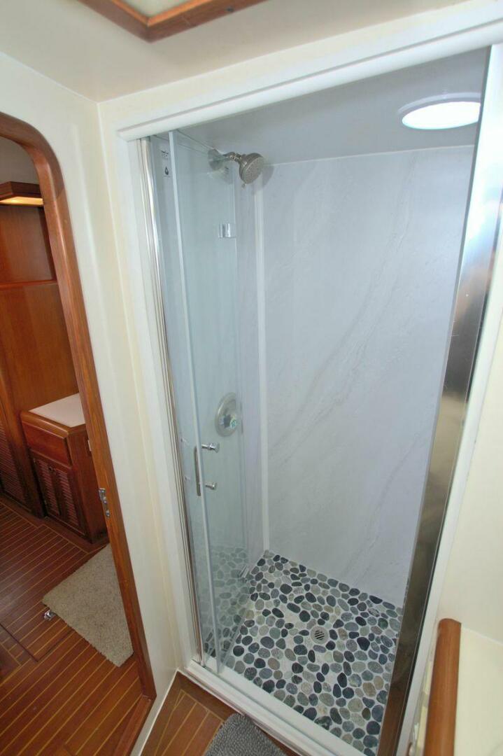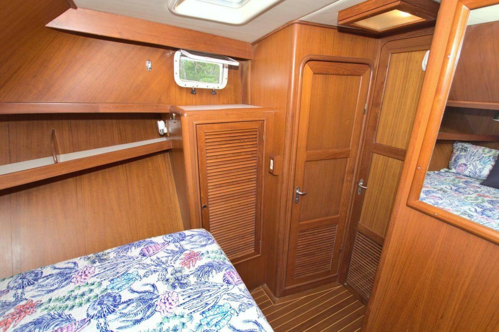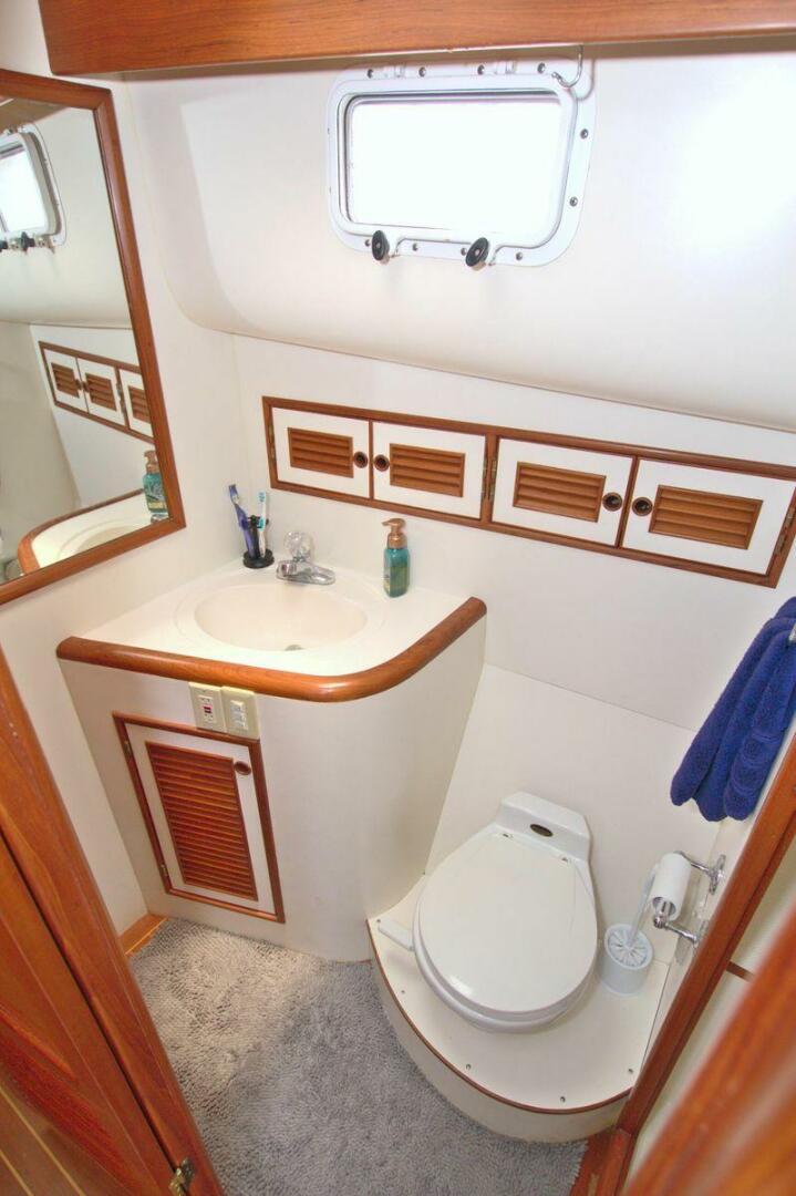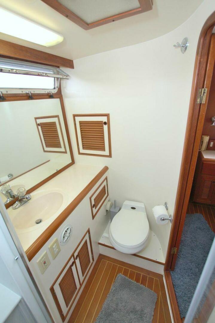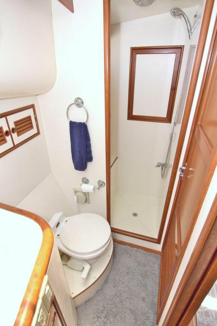 The spacious master stateroom is located aft and is complemented by attractive teak joinery. There is a centerline queen berth. Additional storage includes cedar-lined hanging lockers, and large dresser to port. The master stateroom features a door with forward access to the salon as well as a handy door aft to access the cockpit. The master ensuite bath (Remodeled recently) is roomy and offers a full size stall shower, sink with vanity, Vacu-flush head, large dressing area, as well as ample storage. The master receives natural lighting thanks to the large window aft, aft door to the cockpit, and 4 new portholes, TV and storage closet all prepped for a Washer/Dryer combo.