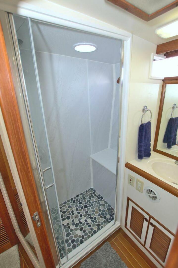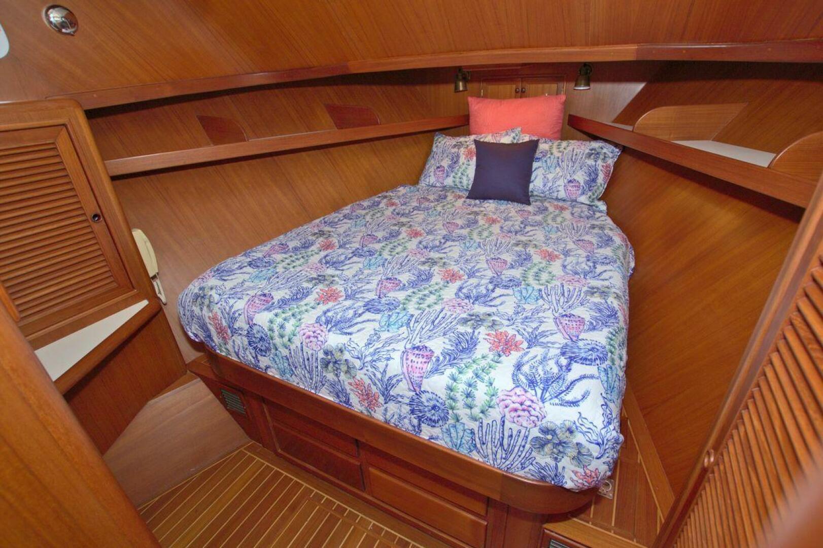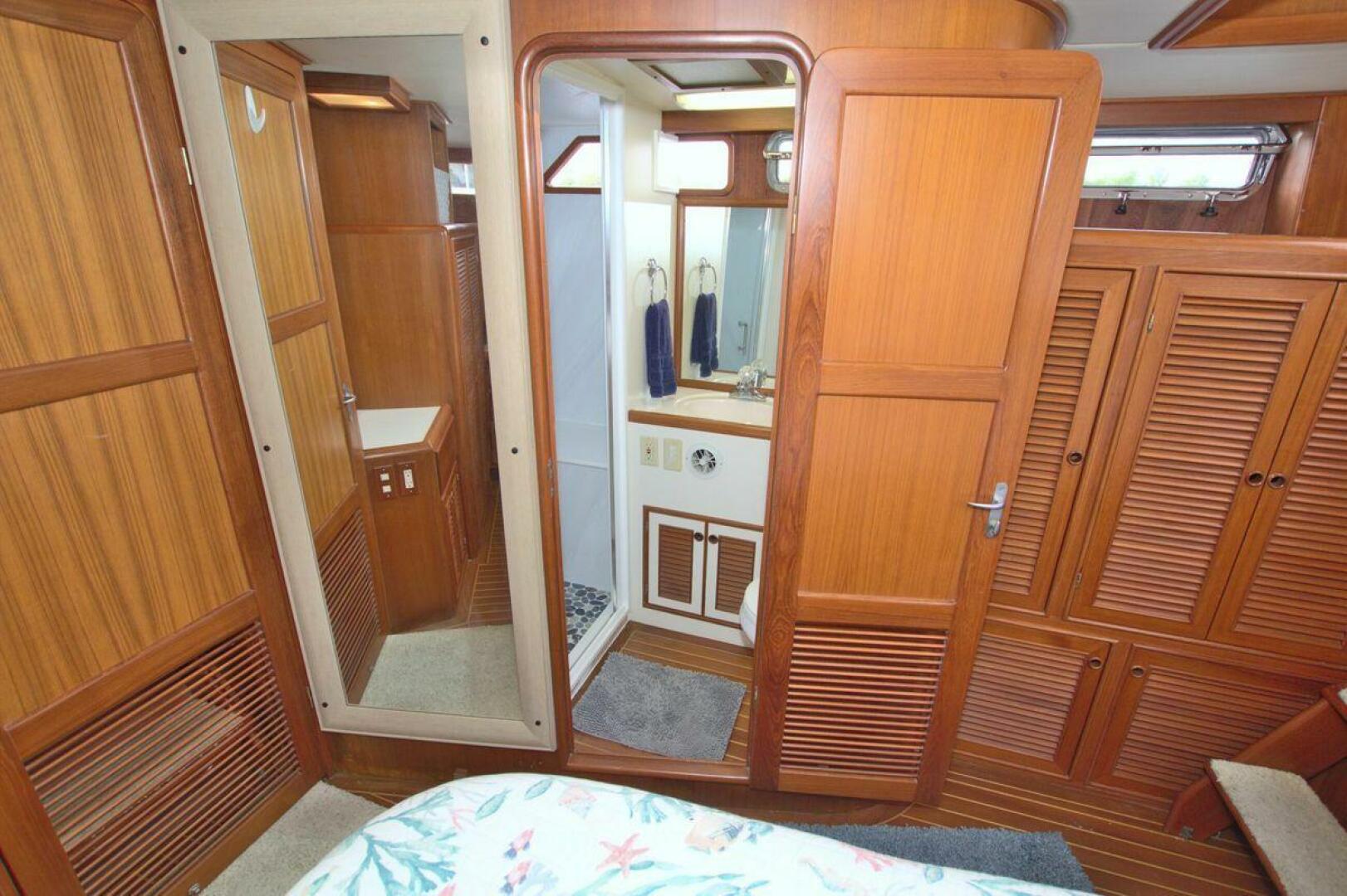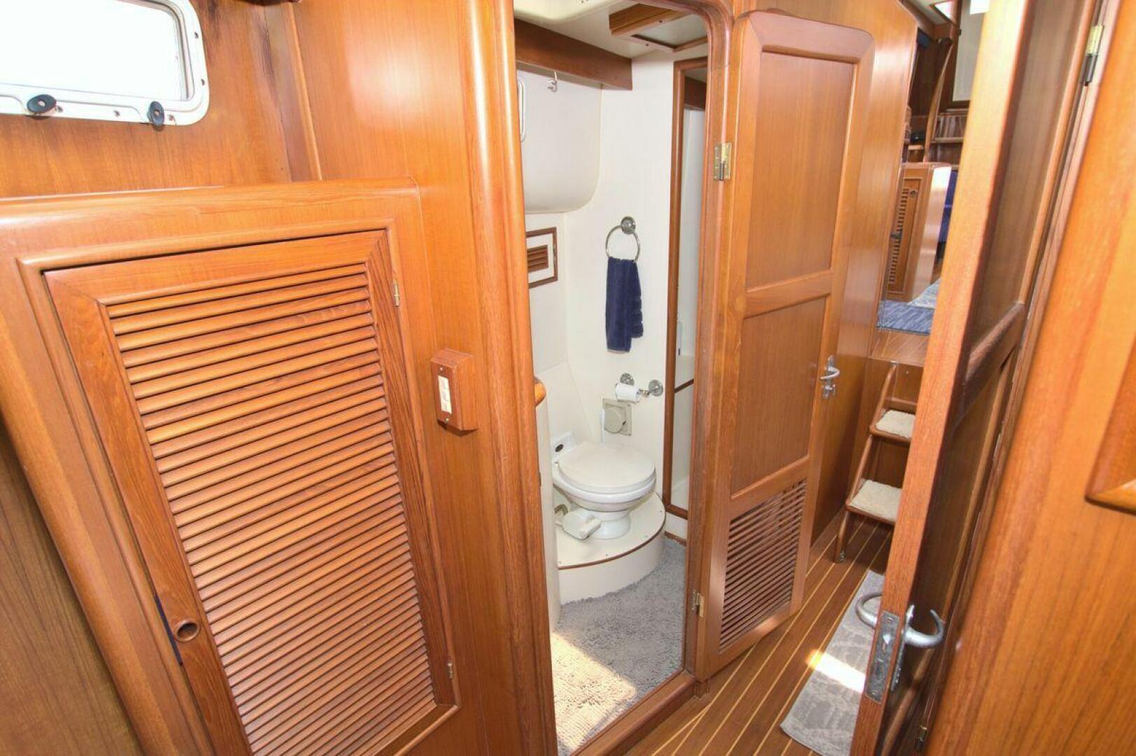 The spacious master stateroom is located aft and is complemented by attractive teak joinery. There is a centerline queen berth. Additional storage includes cedar-lined hanging lockers, and large dresser to port. The master stateroom features a door with forward access to the salon as well as a handy door aft to access the cockpit. The master ensuite bath (Remodeled recently) is roomy and offers a full size stall shower, sink with vanity, Vacu-flush head, large dressing area, as well as ample storage. The master receives natural lighting thanks to the large window aft, aft door to the cockpit, and 4 new portholes, TV and storage closet all prepped for a Washer/Dryer combo.