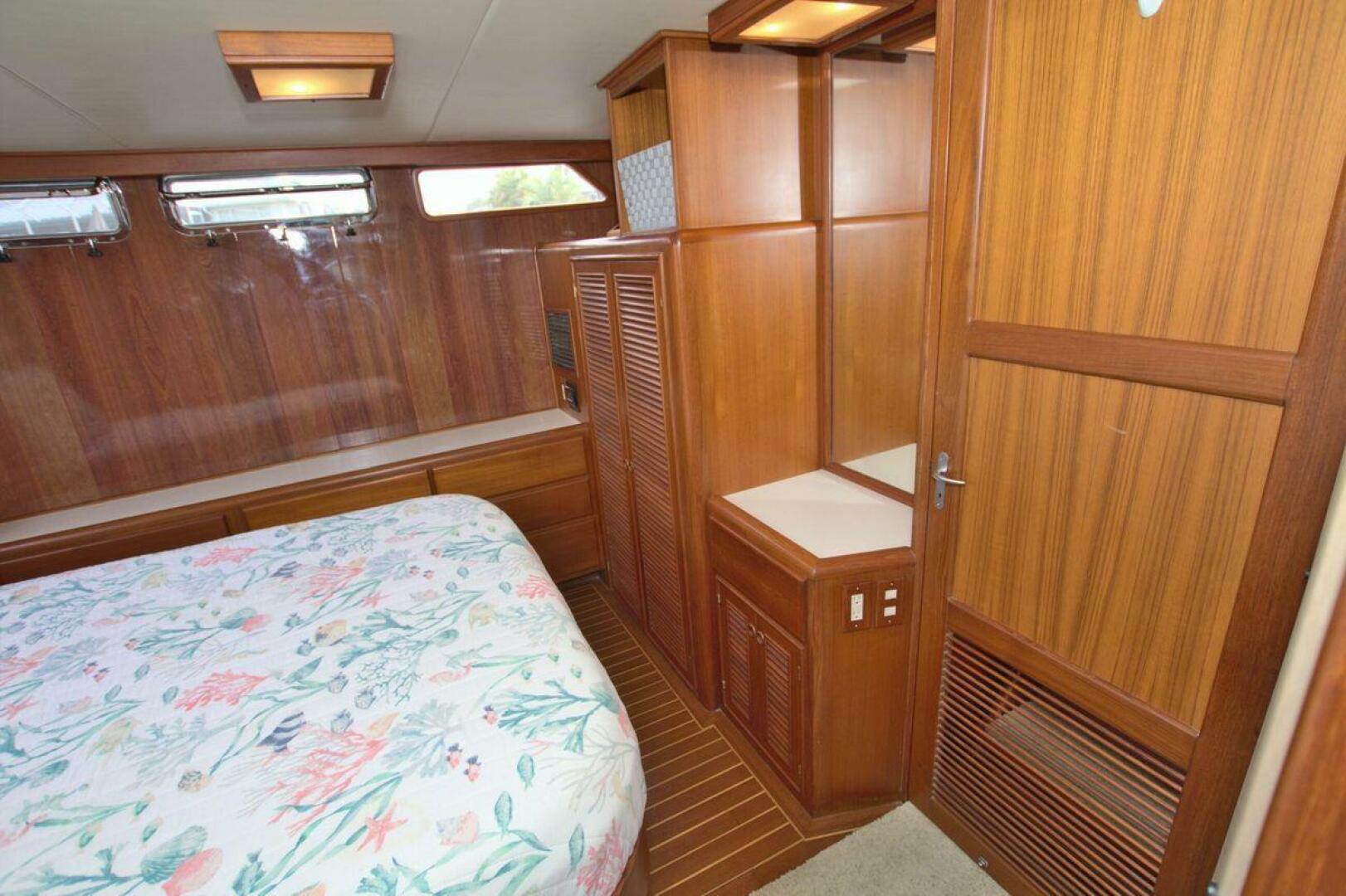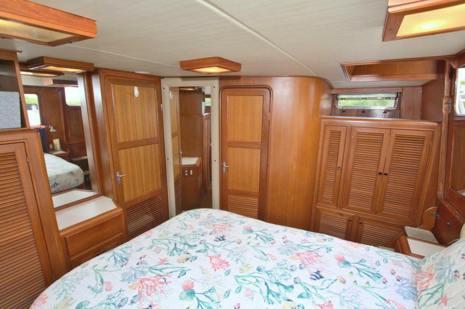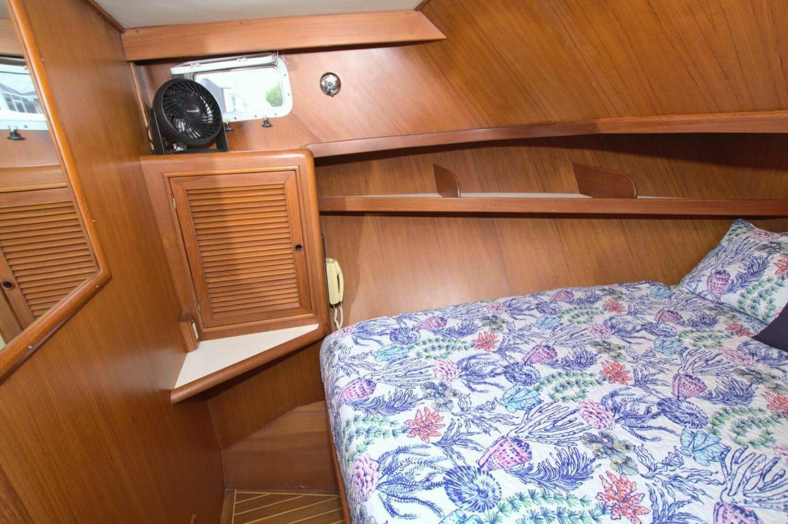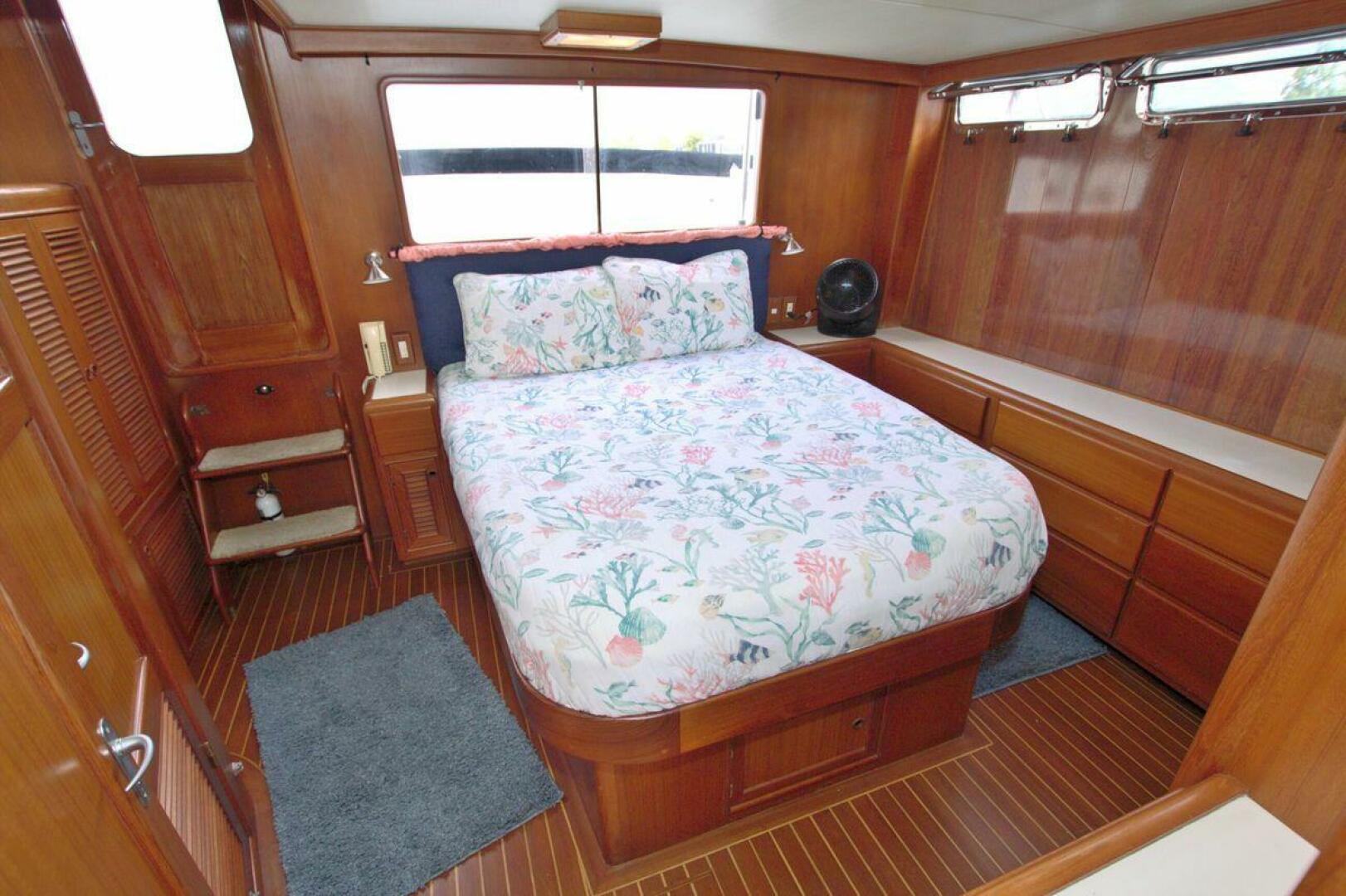 The spacious master stateroom is located aft and is complemented by attractive teak joinery. There is a centerline queen berth. Additional storage includes cedar-lined hanging lockers, and large dresser to port. The master stateroom features a door with forward access to the salon as well as a handy door aft to access the cockpit. The master ensuite bath (Remodeled recently) is roomy and offers a full size stall shower, sink with vanity, Vacu-flush head, large dressing area, as well as ample storage. The master receives natural lighting thanks to the large window aft, aft door to the cockpit, and 4 new portholes, TV and storage closet all prepped for a Washer/Dryer combo.