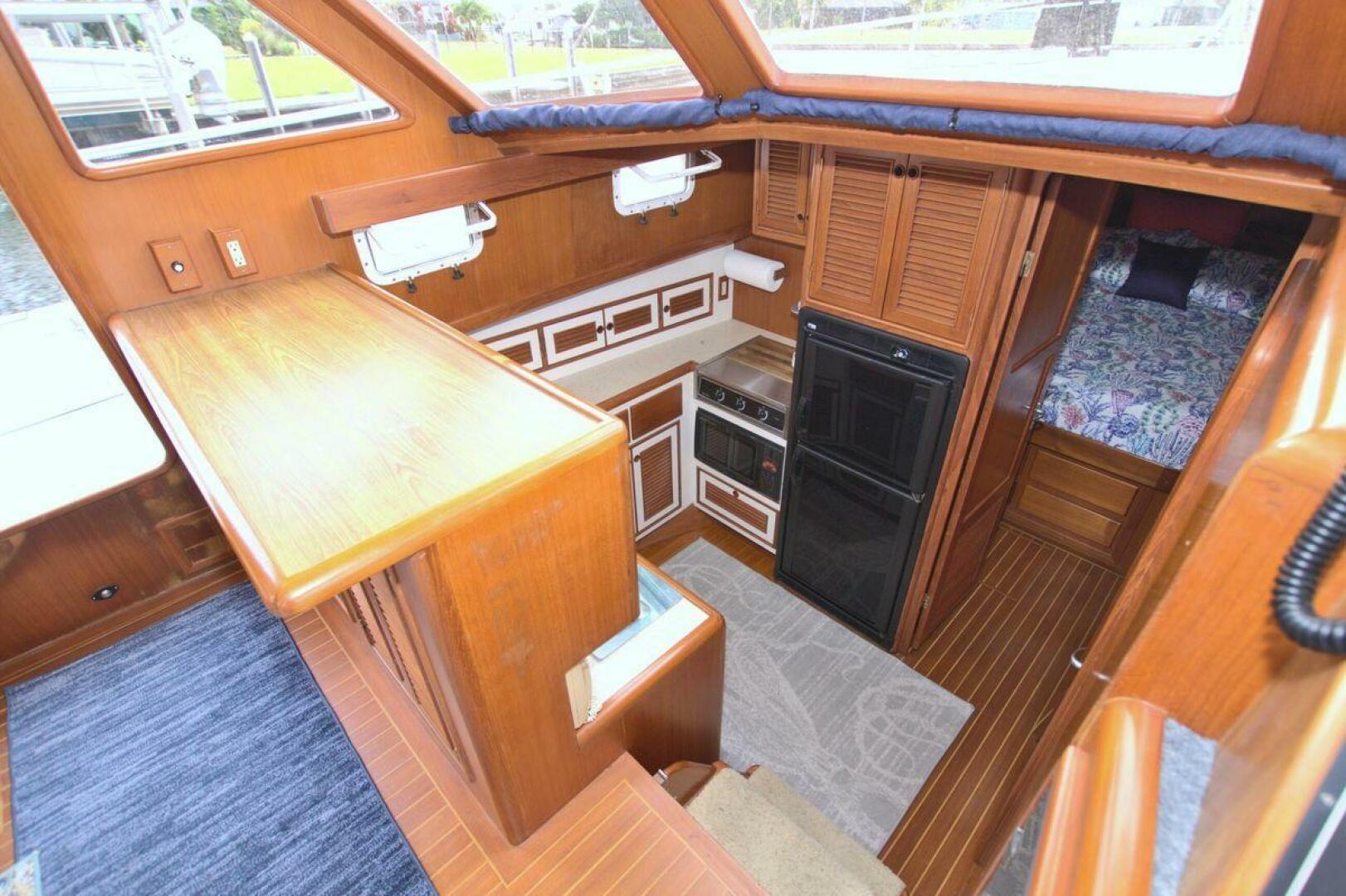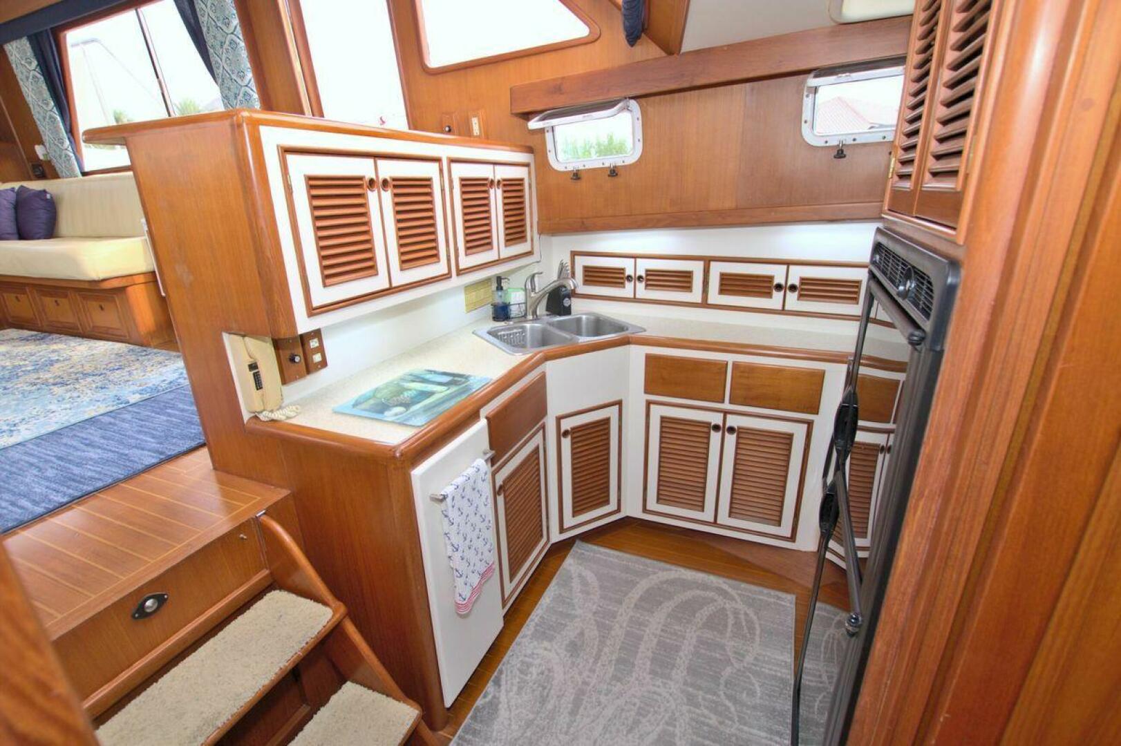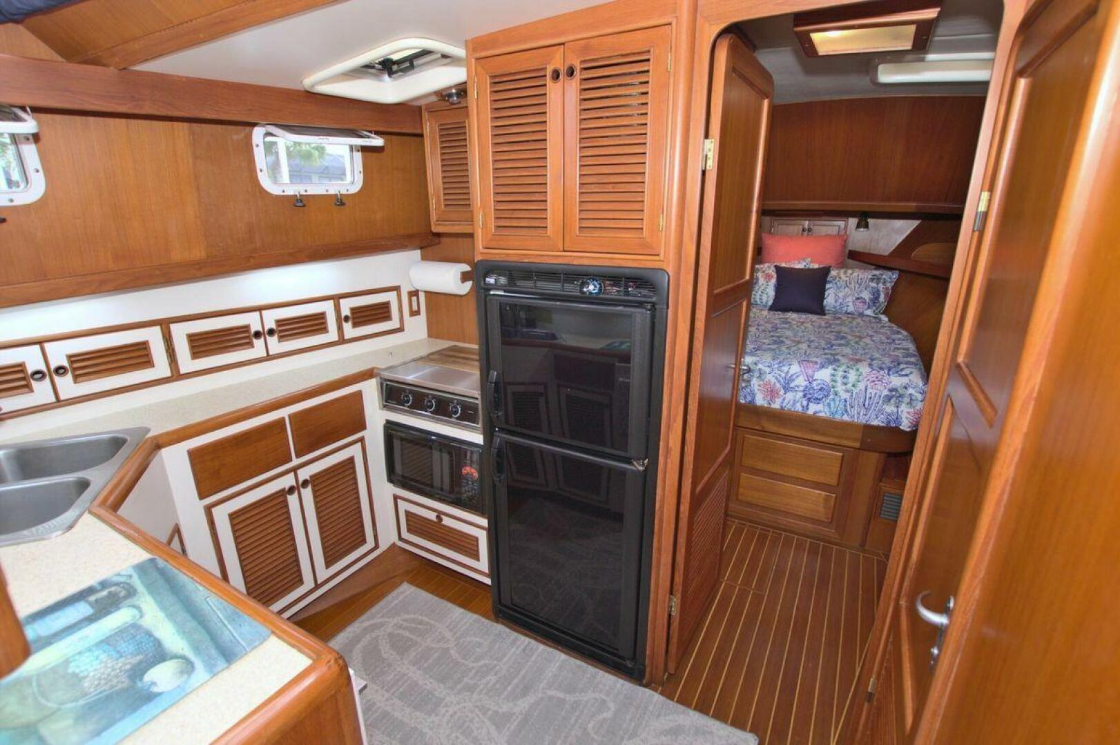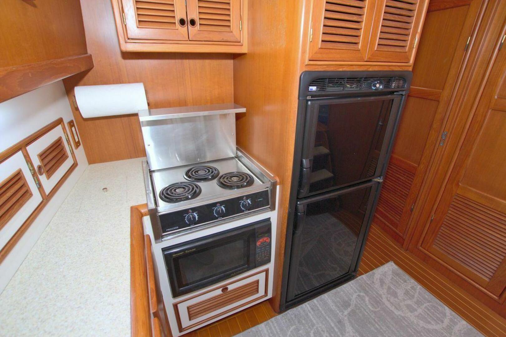 The Galley is located on the port side down. The Galley offers "like home" amenities plus the storage required for extended cruising. Norcold refrigerator/freezer - AC/DC power, Princess 3-burner cooktop with cover, Sharp carousel microwave, Teak trimmed cabinets and drawer, formica counter tops with double stainless sinks, hot & cold fresh water.