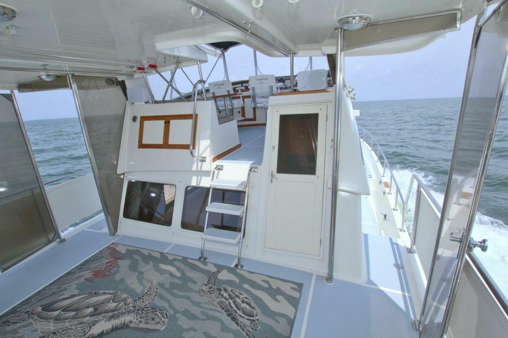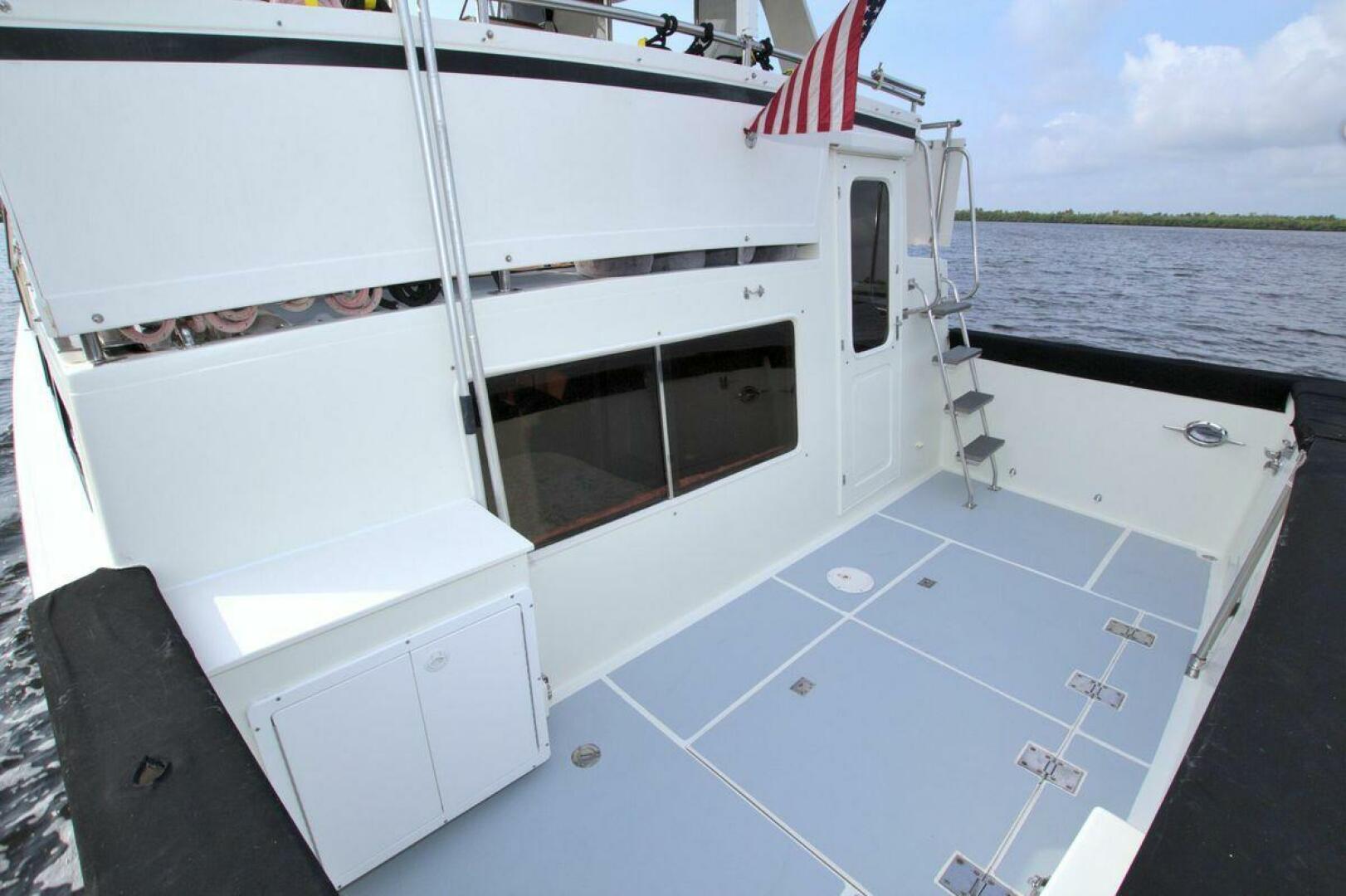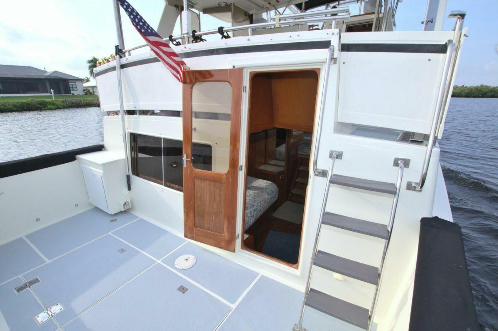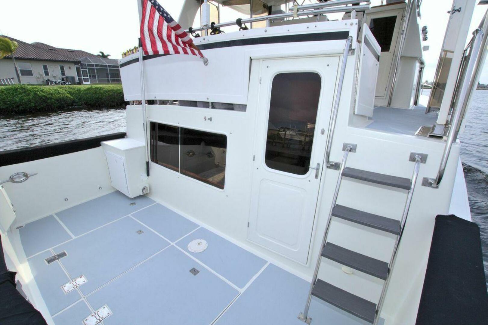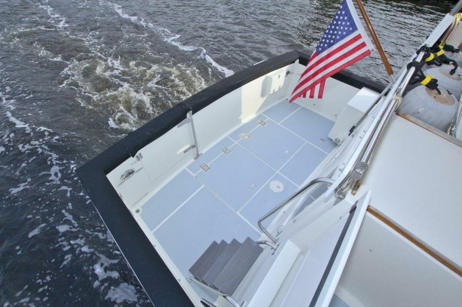Aft cockpit with teak gunwale, transom door, and swim platform with stainless swim ladder. Cockpit has access to lazarette with a brand new Northern Lights 12.5 KW Generator with 90 Hours. Mid-level Aft deck has a hard top with aft deck plexi-glass wing doors, salon entry door.