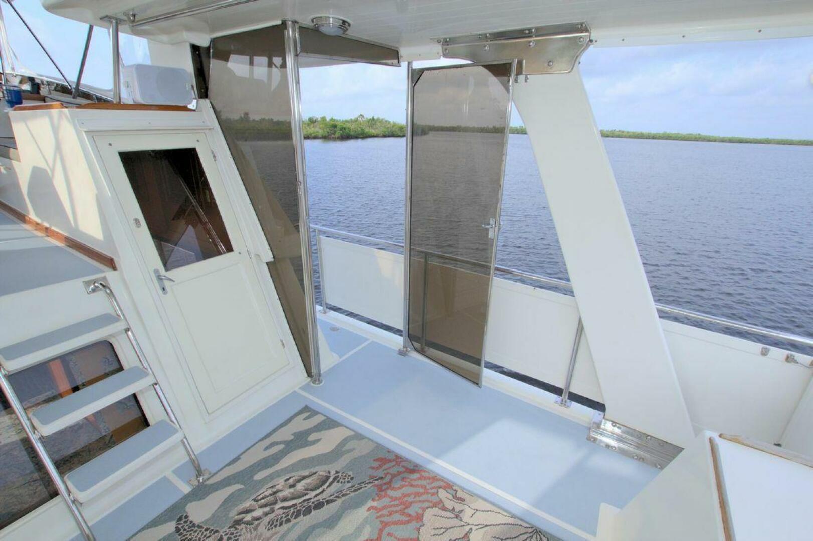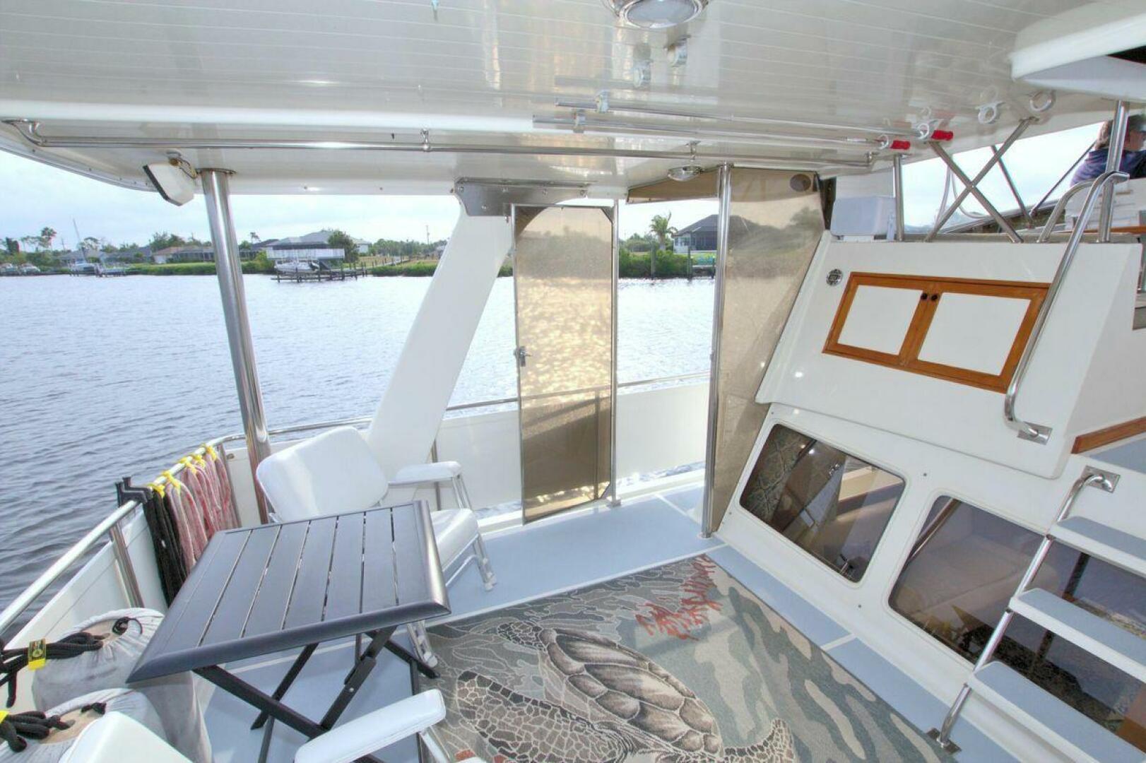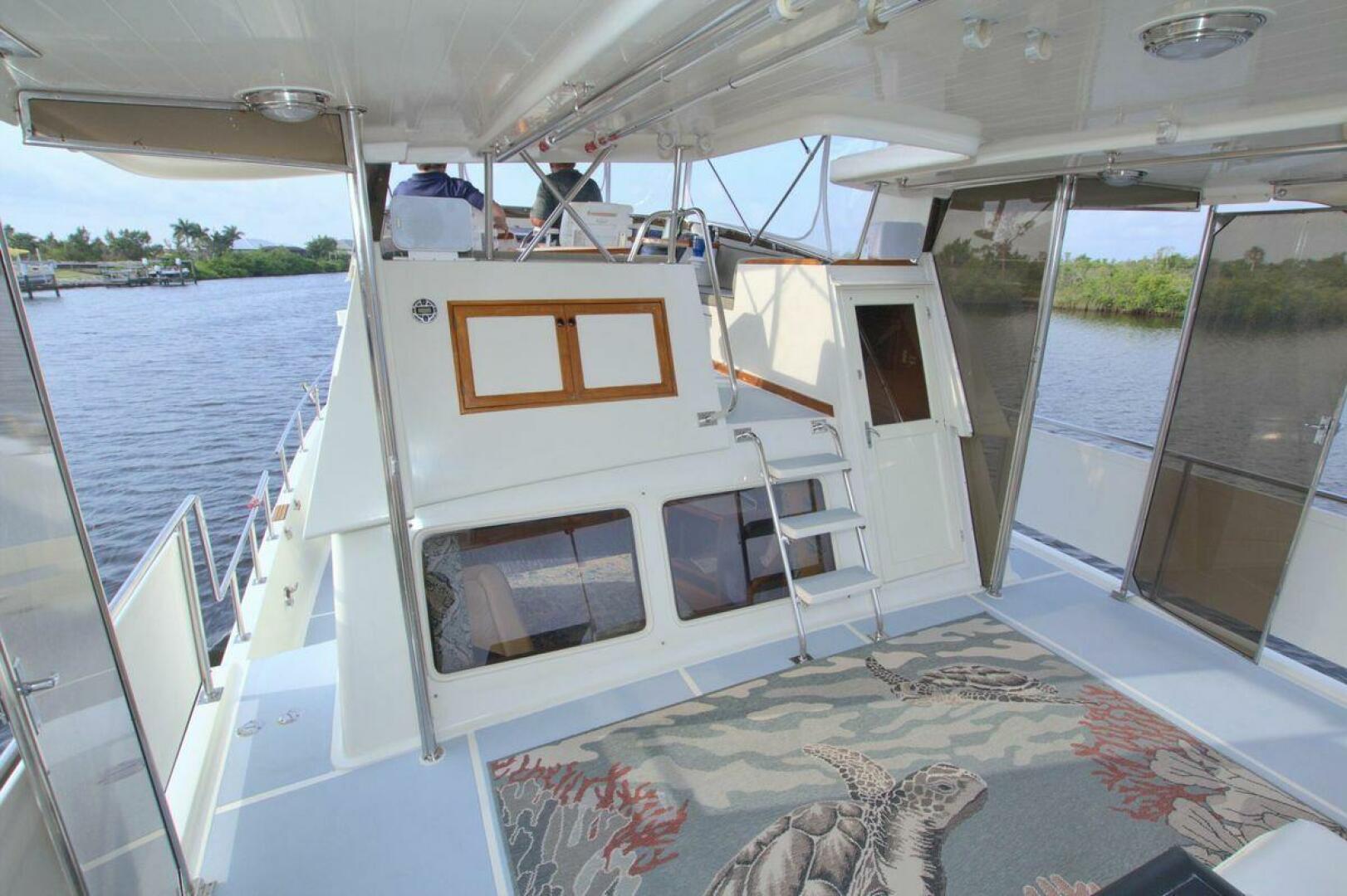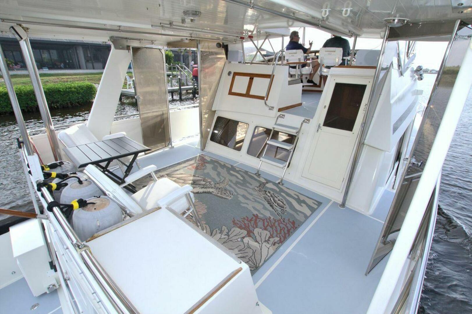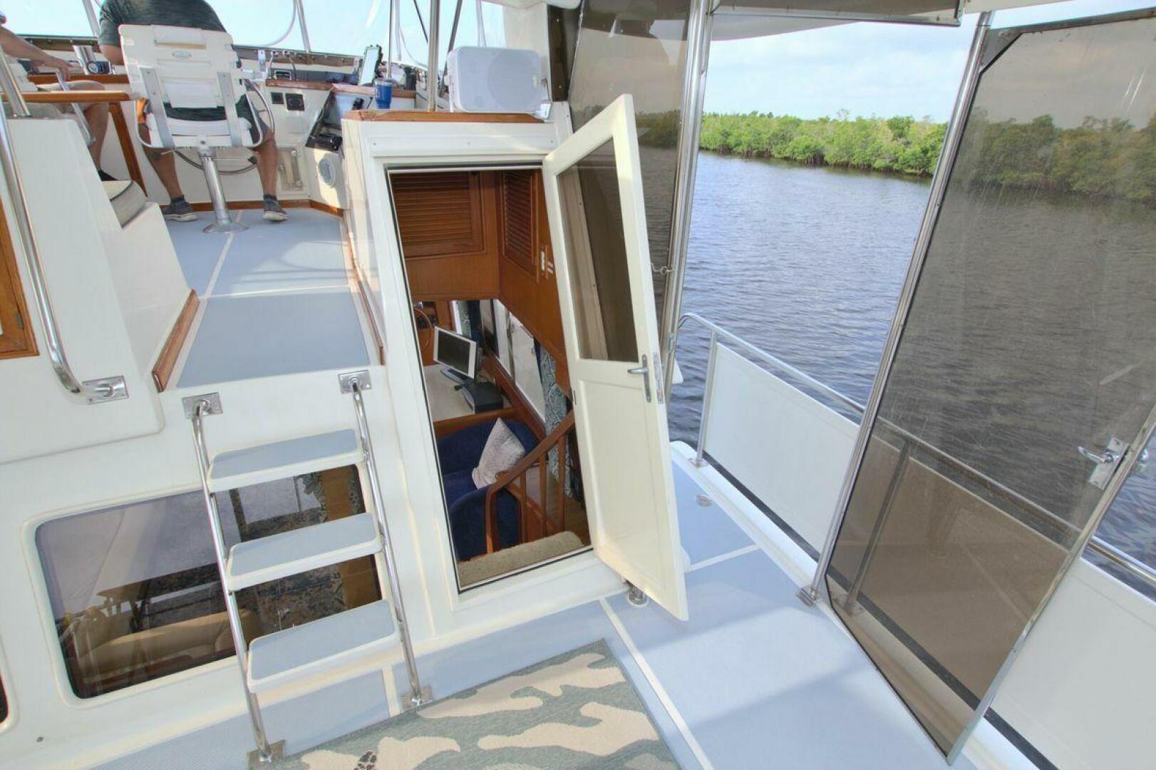 Aft cockpit with teak gunwale, transom door, and swim platform with stainless swim ladder. Cockpit has access to lazarette with a brand new Northern Lights 12.5 KW Generator with 90 Hours. Mid-level Aft deck has a hard top with aft deck plexi-glass wing doors, salon entry door.