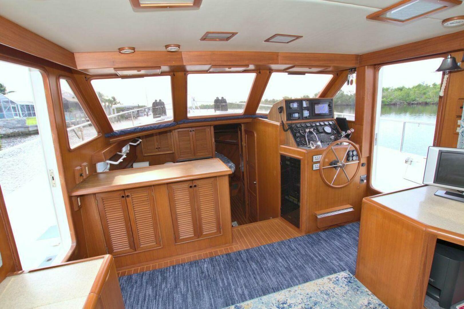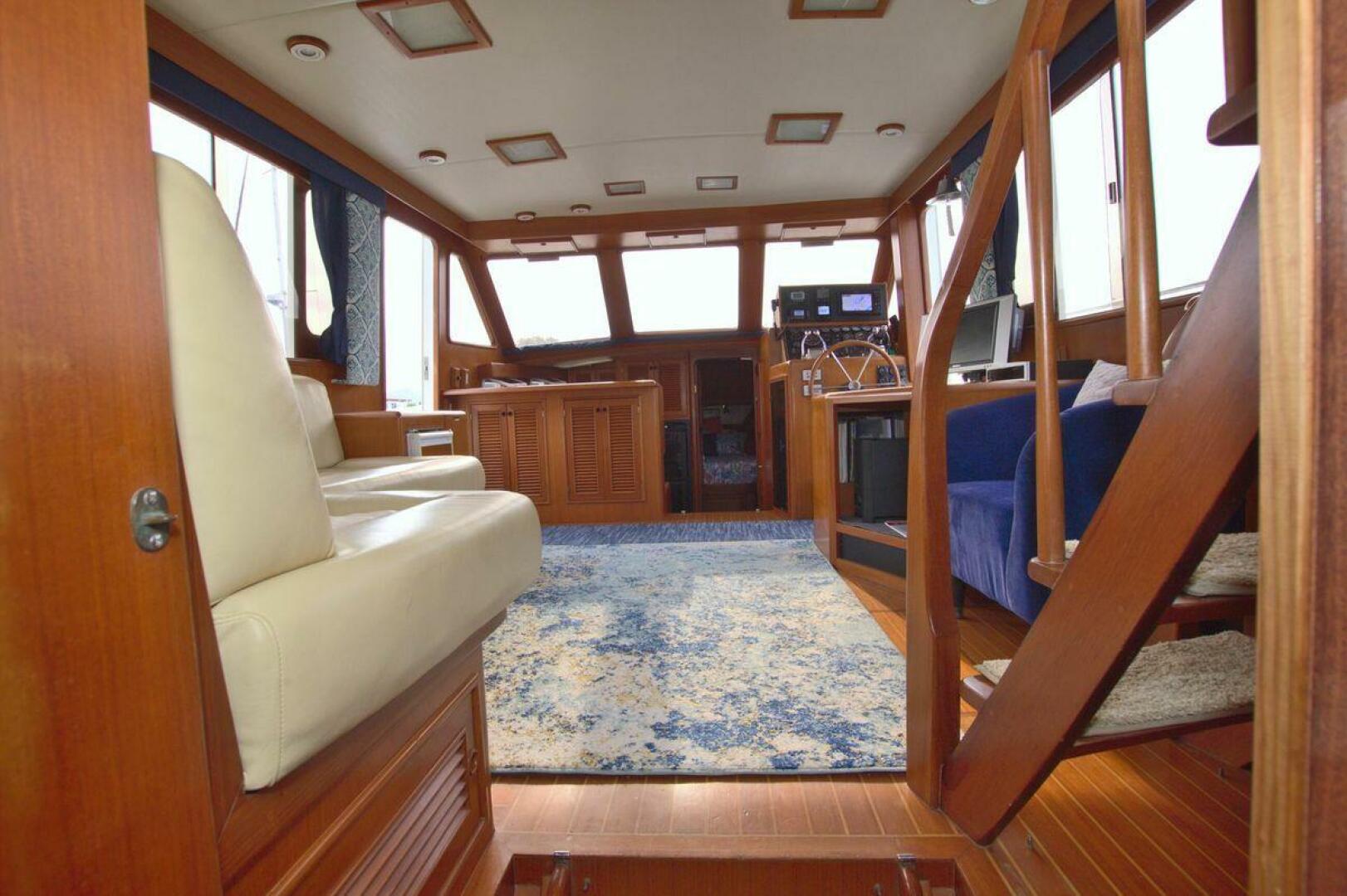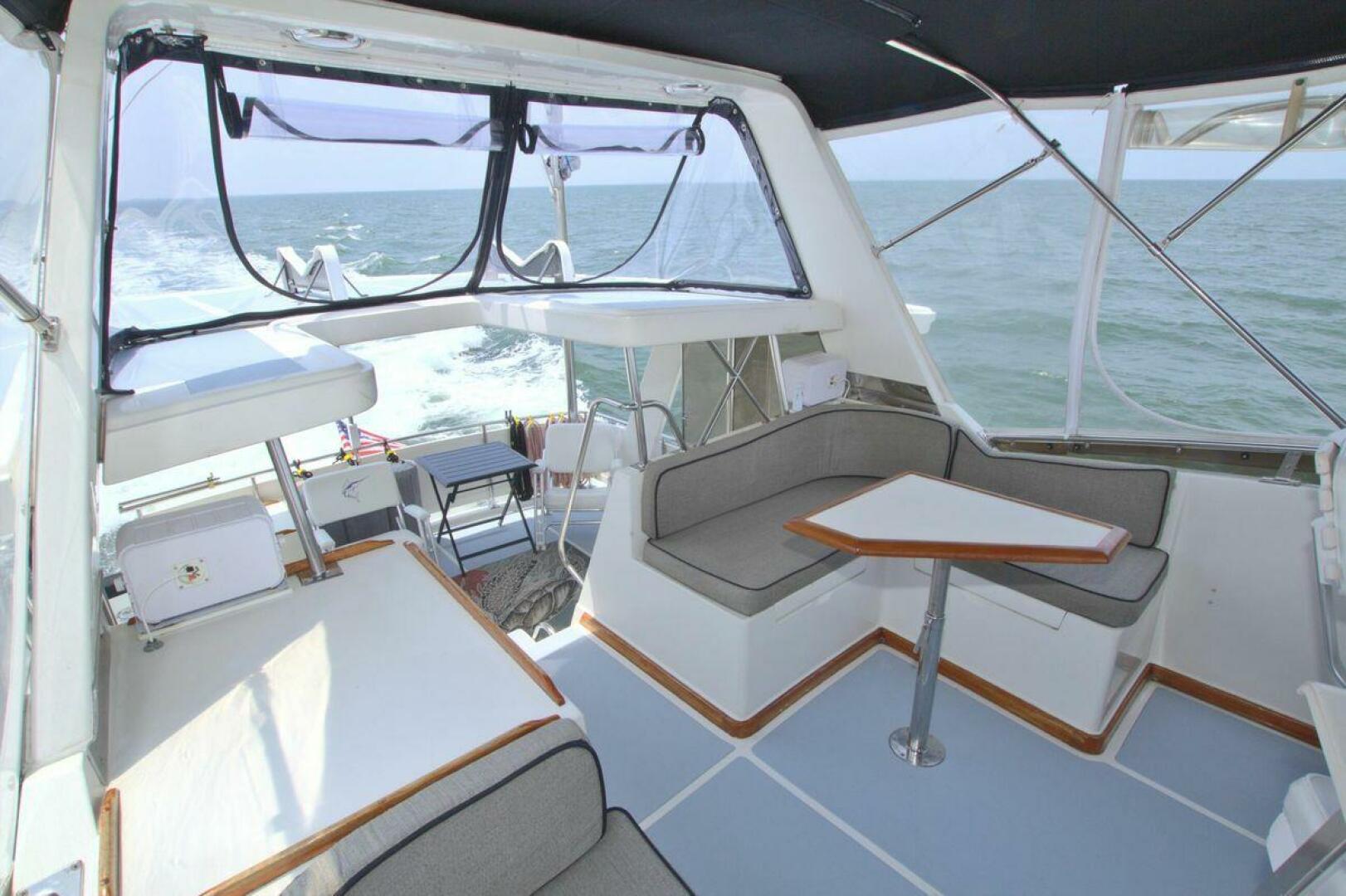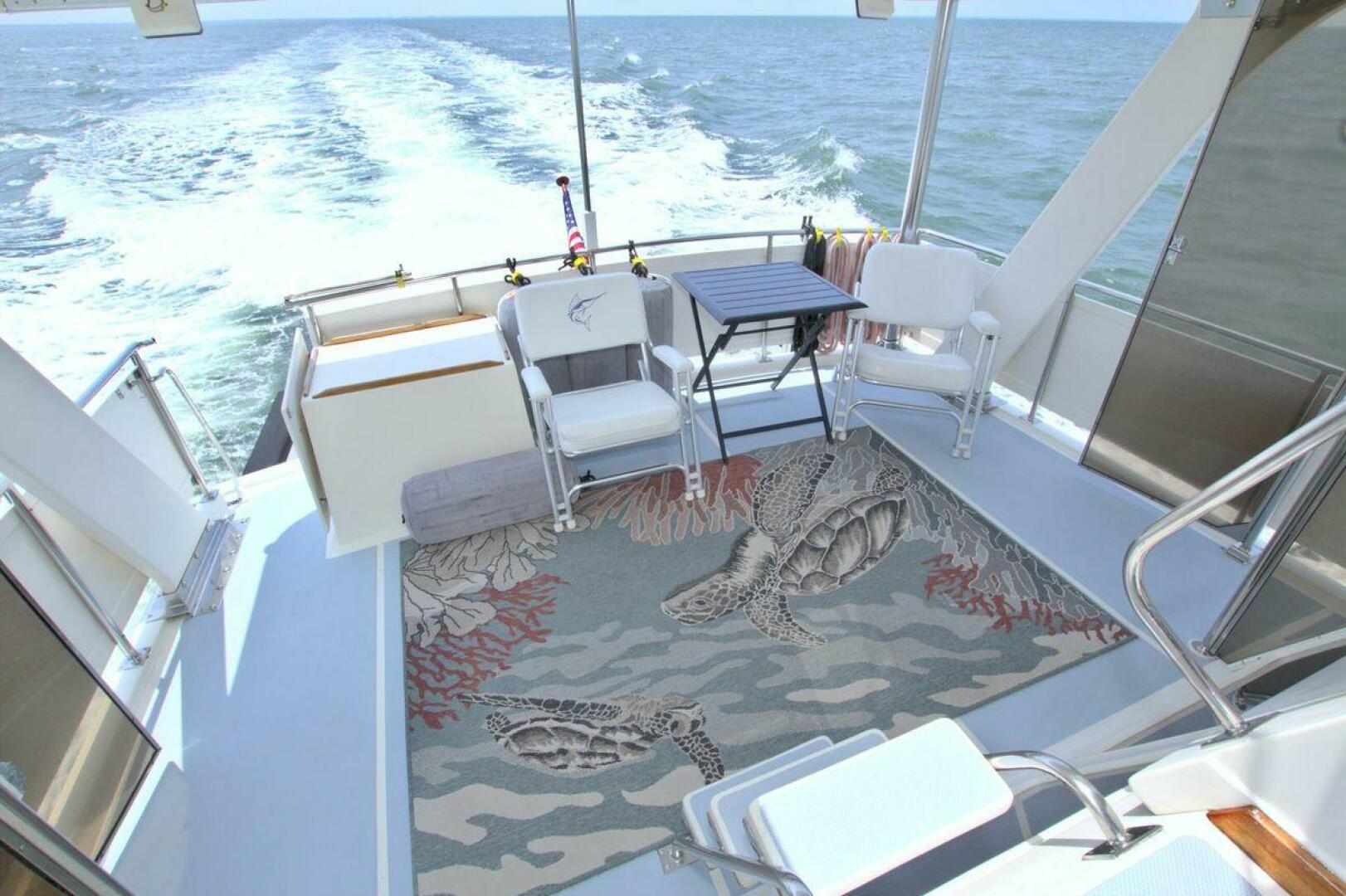 Aft cockpit with teak gunwale, transom door, and swim platform with stainless swim ladder. Cockpit has access to lazarette with a brand new Northern Lights 12.5 KW Generator with 90 Hours. Mid-level Aft deck has a hard top with aft deck plexi-glass wing doors, salon entry door.